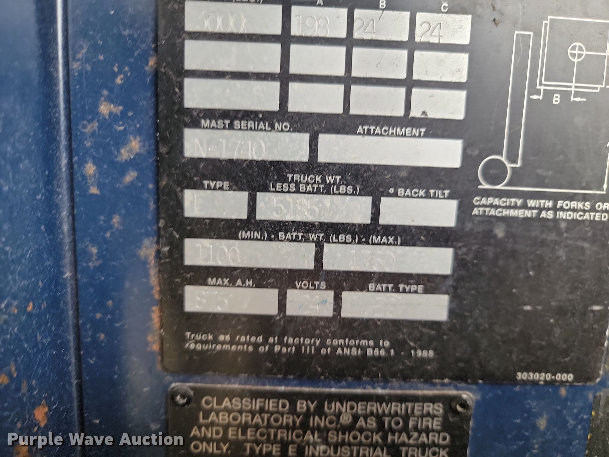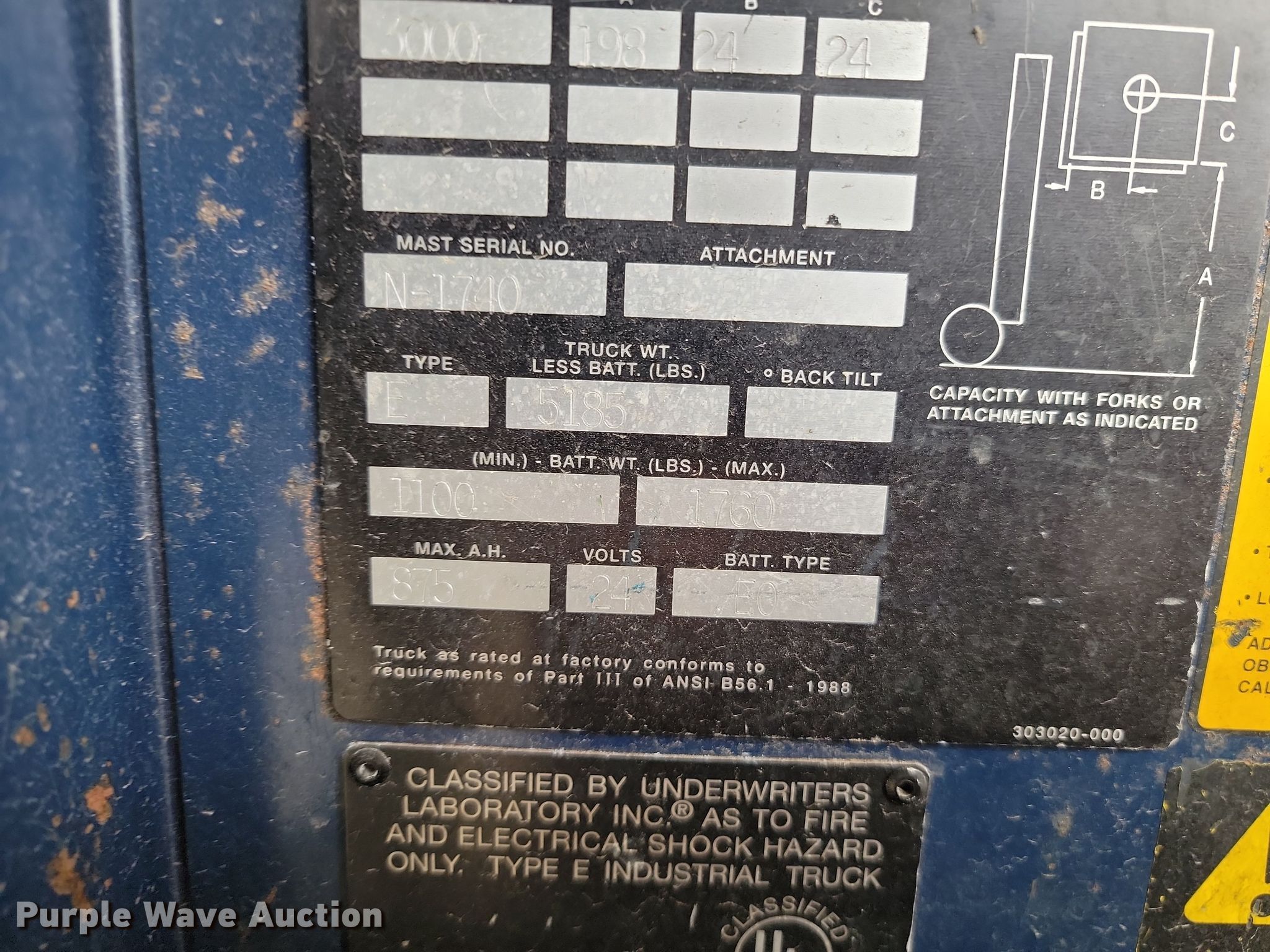 Komatsu MPF15 forklift. Hours: 3,847 on meter, Serial: MPF151A9010. Electric Motor Volts: 24, Charger: Three phase. Transmission Hydrostatic. Operators station Canopy. Features Maximum lift capacity: 3,000 lbs, Maximum lift height: 198", Mast stages: 3, Fork length: 42", Ferro Five FR12HK850E charger Serial: B PIU950534. Tires Non-marking. Notes Unknown operating condition. Brent Nelson. Independence, KS 67301