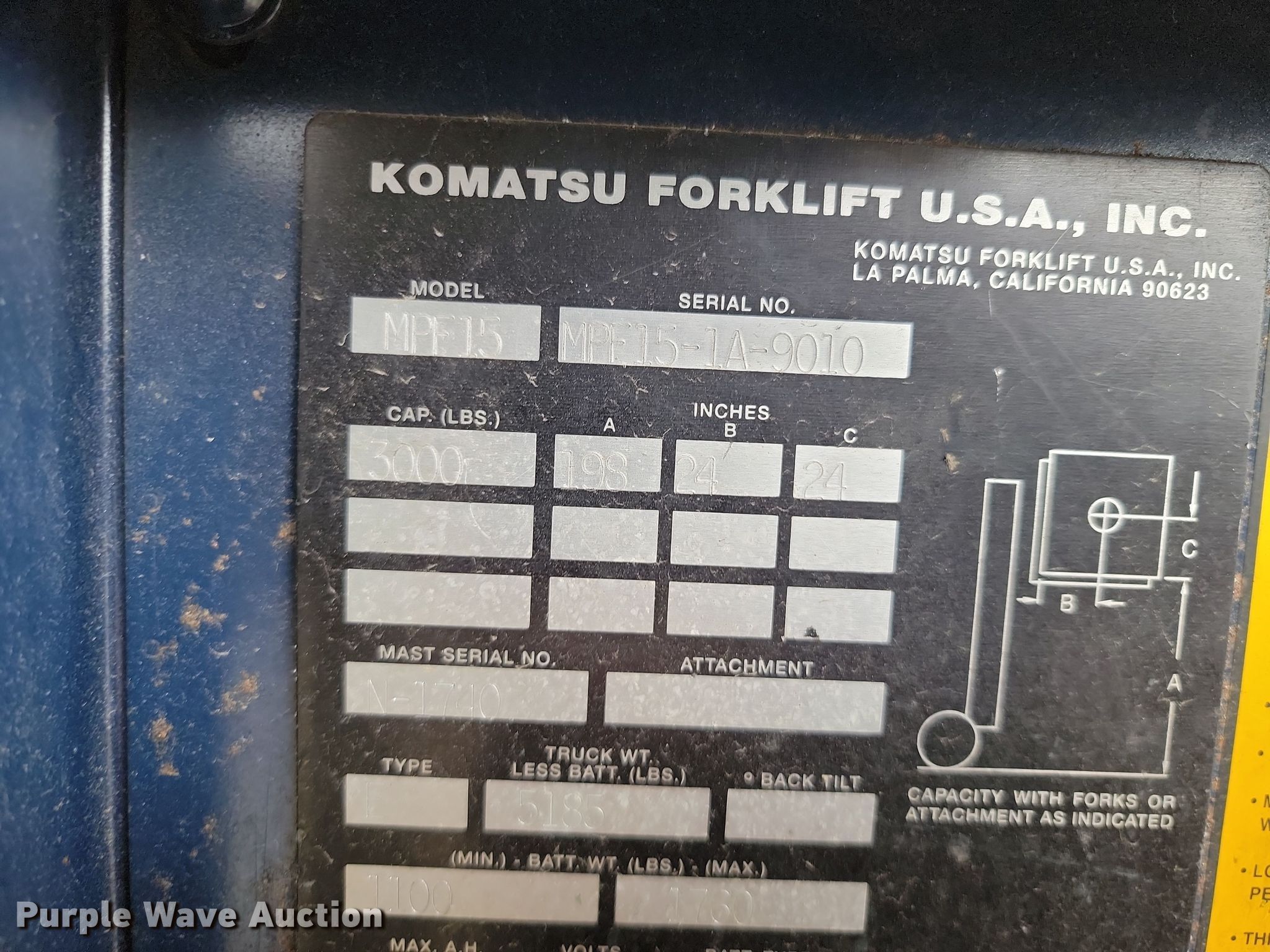 Purple Wave is selling a used Warehouse Forklift in Kansas. This item is a Komatsu MPF15 forklift with the following: Hours: 3,847 on meter, Serial: MPF151A9010
