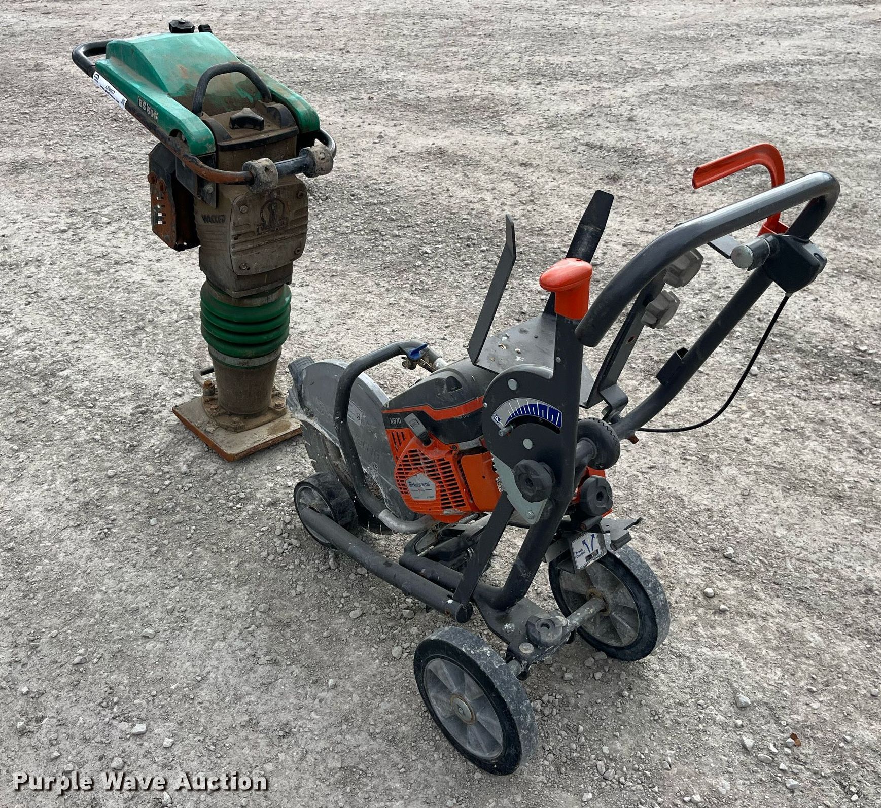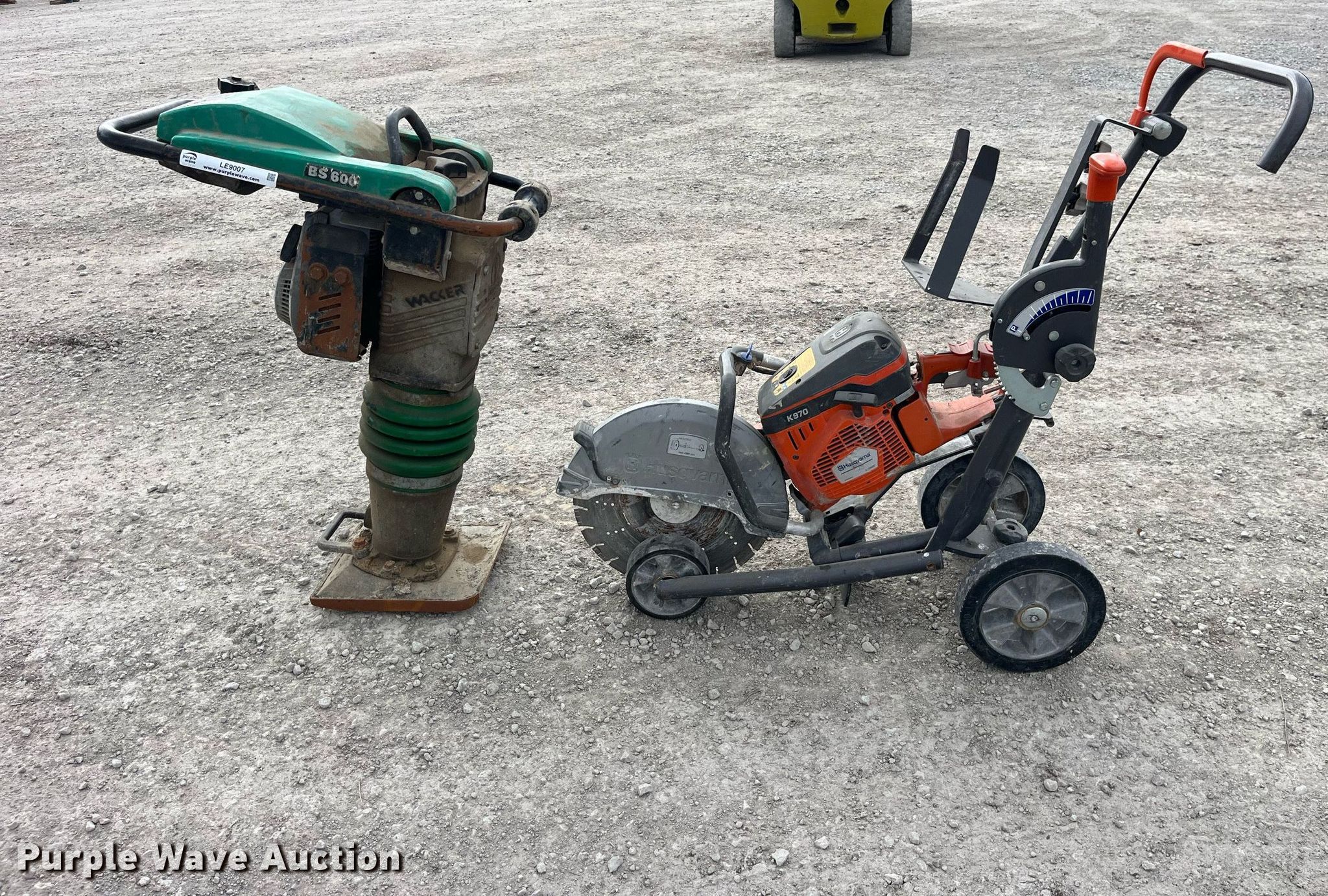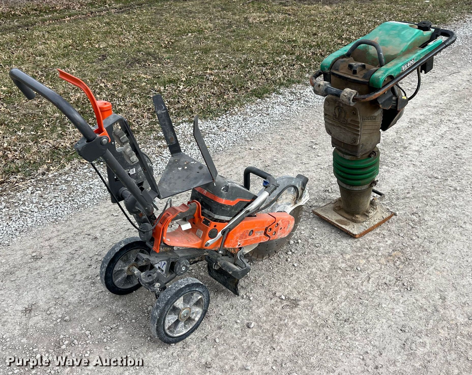 Purple Wave is selling a used Tools in Missouri. This item is a Tools with the following: Wacker BS600 walk behind compactor, Pad dimension: 13" x 11", Fuel type: Gas, Displacement: 80cc, Cylinders: Single, Husqvarna KV 970/1260 cart, Serial: 20191100150, Tire size 250/50-184, Husqvarna K970 saw, Cylinder: Single cylinder, Blade: 16", Possible bad cylinder