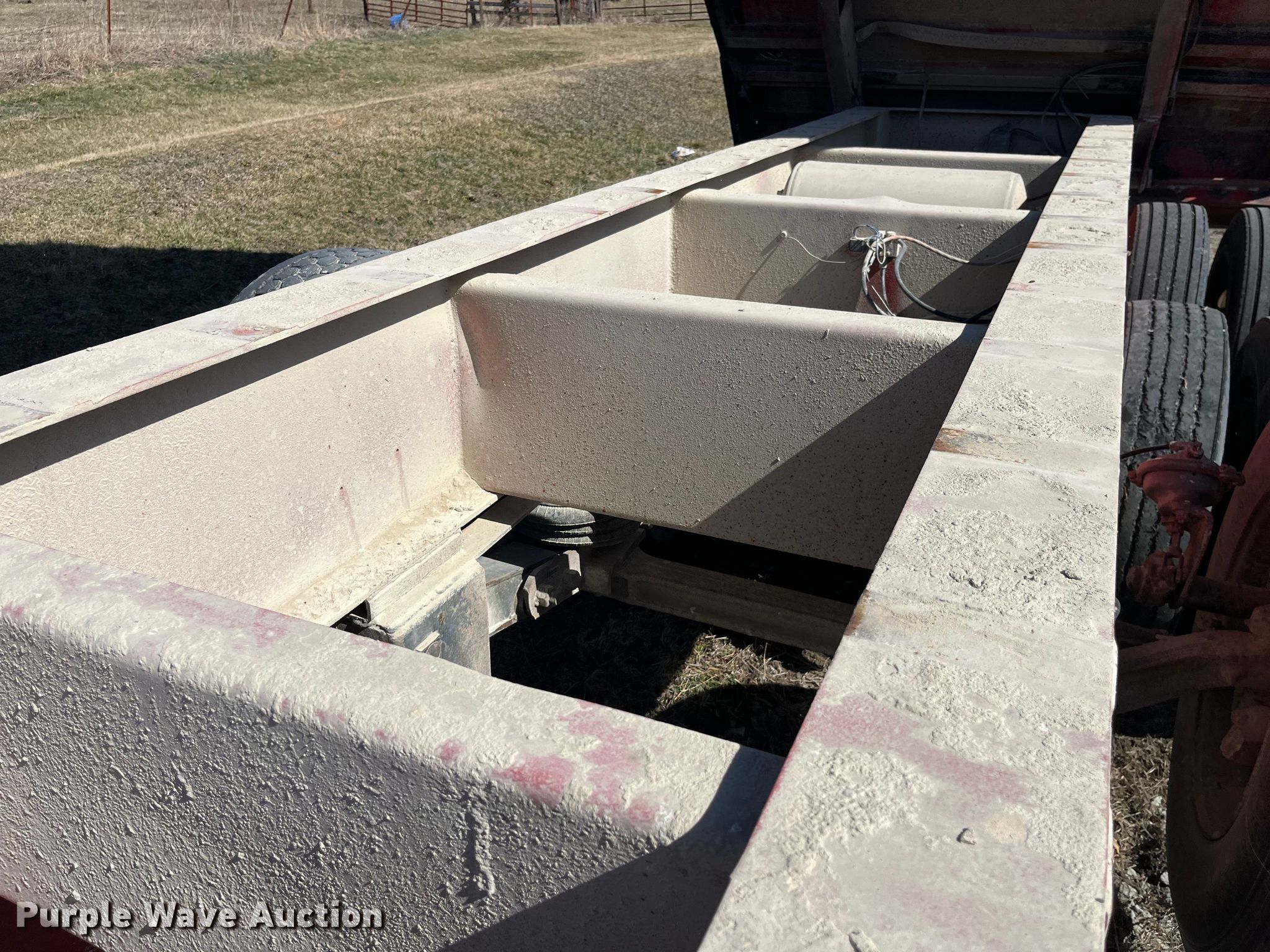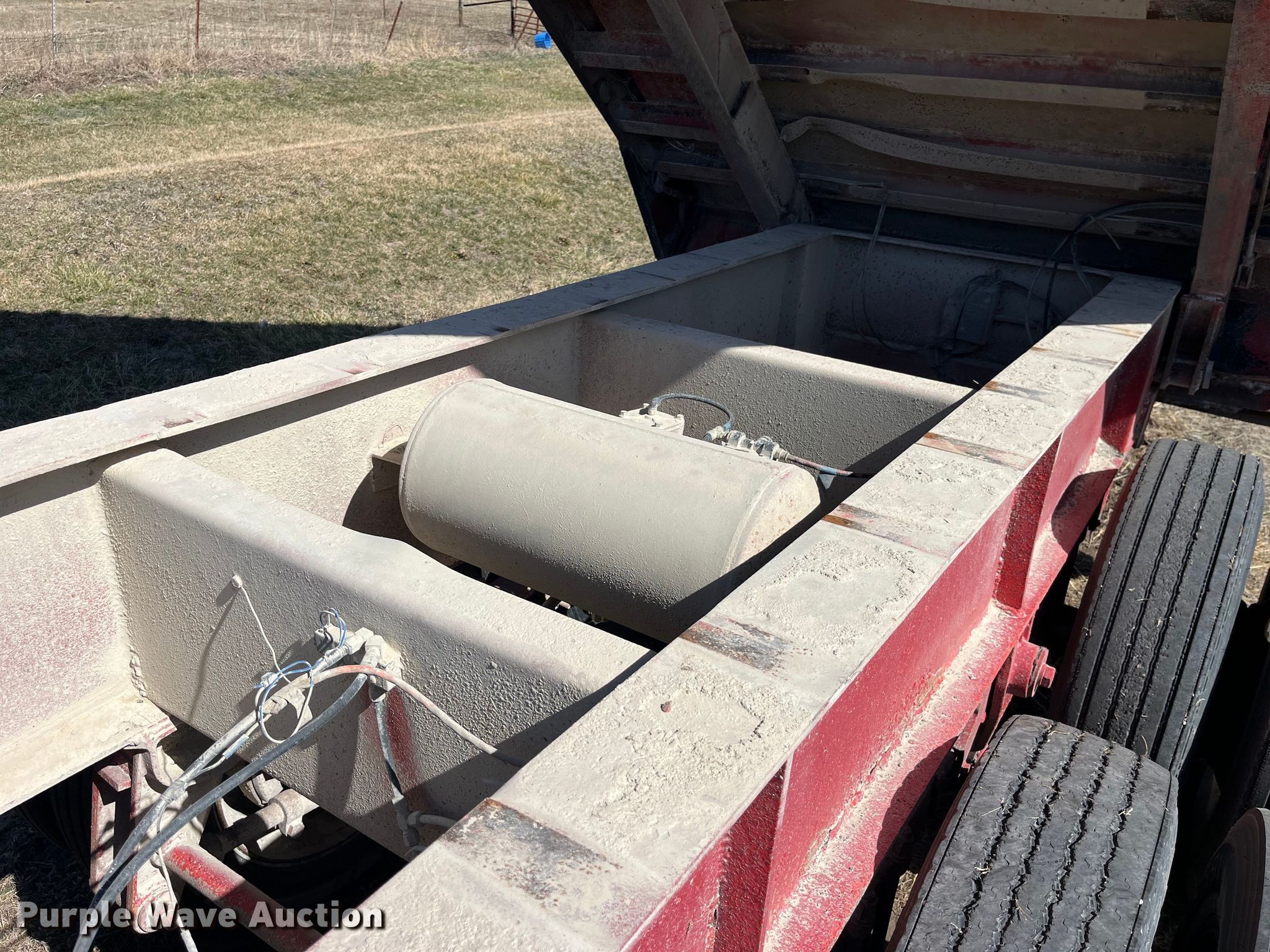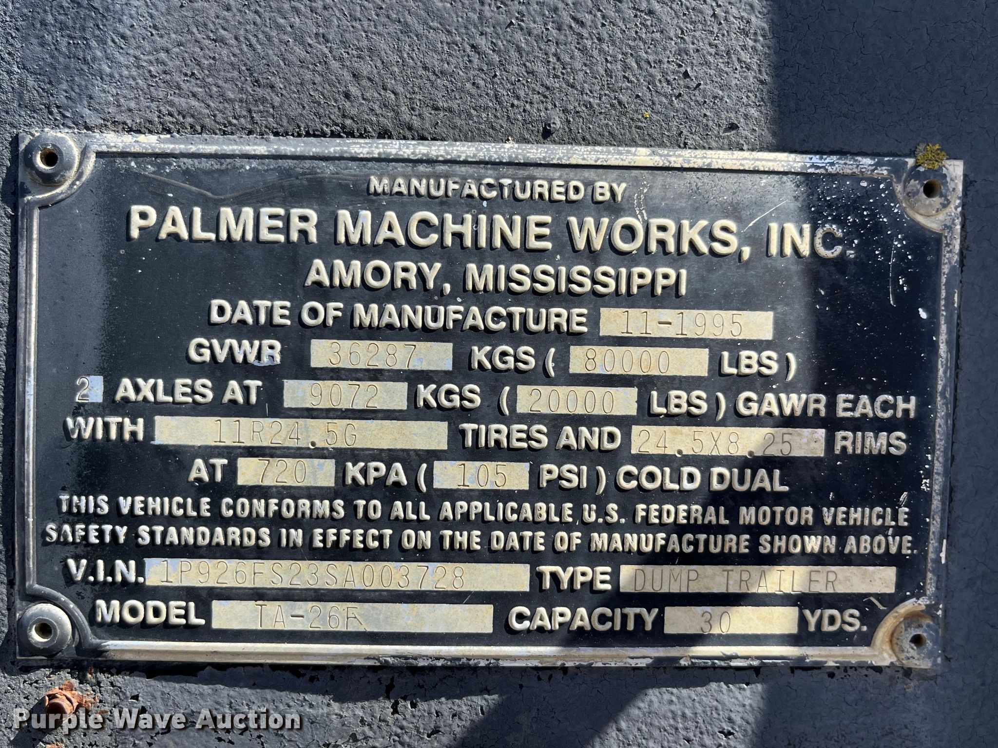 1995 Palmer TA-26F end dump trailer. VIN: 1P926FS23SA003728. Dimensions Overall: 27' 4" L x 98" W, Body: 26' L x 95" W, Side height: 4' 9". Features Cu. yd. capacity: 30, Body type: Steel, Ram: Single, Lift axel, End gate: Air operated Grain door. Chassis Landing gear: Dual, Suspension: Spring, Brakes: Air, Axles: Triple, GVWR: 80,000 lbs, GAWR: 20,000 lbs. Tires Size: 275/80R24.5, Size 285/75R24.5, Lift axle: 11R22.5. Notes Truck not included. Iowa title. Title distribution may be delayed up to 14 days from verification of funds. Schaefer Excavating Inc.. 1864 215th St. Mount Ayr, IA 50854