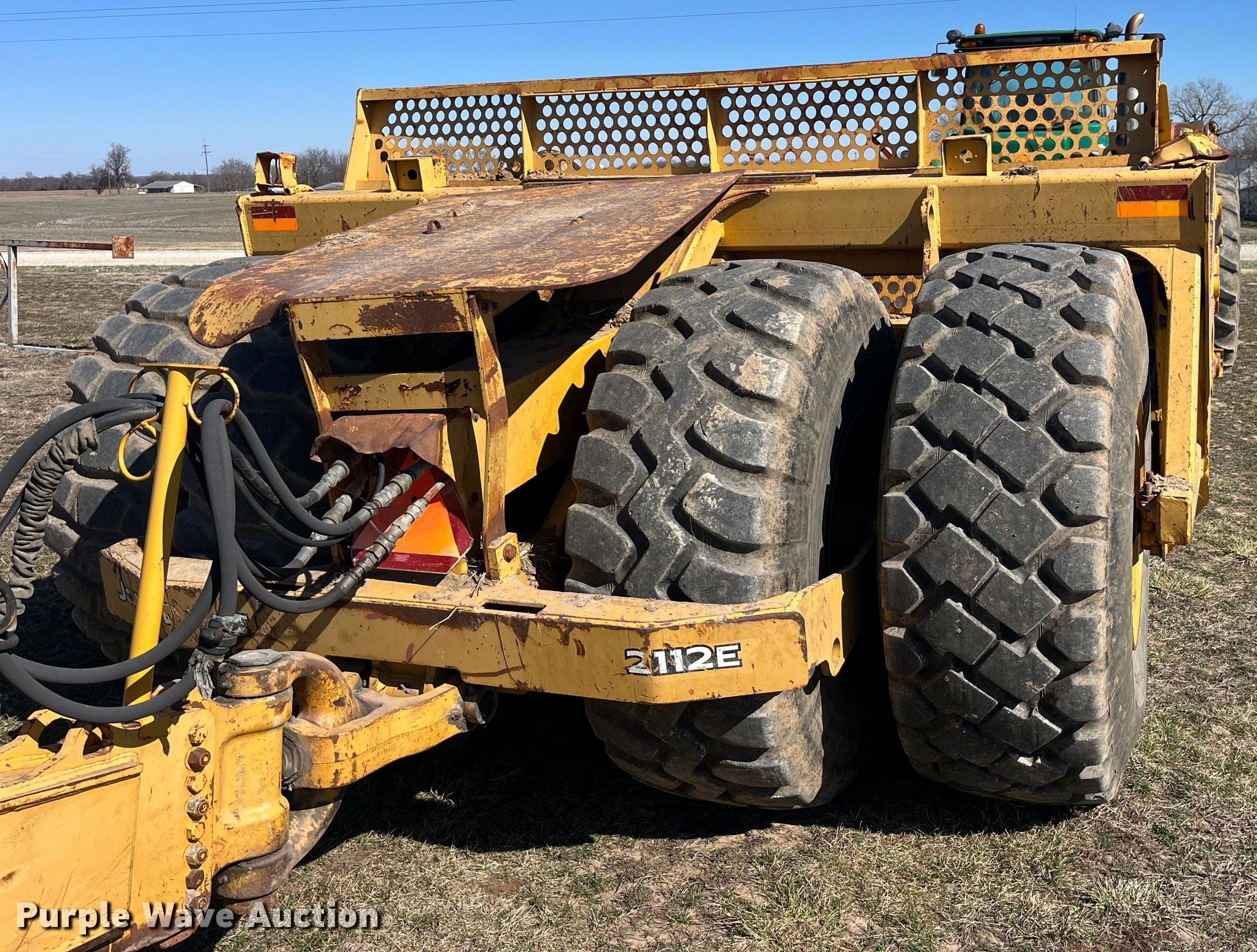 2005 John Deere 2112E scraper. Serial: T82112E050117. Features Bowl capacity: 21 cu.yd., Hydraulic lift, Hitch: Scraper, rear. Tires Size: 26.5R25. Notes Tractor not included. Klocke Incorporated. 3844 County Road 401. Palmyra, MO 63461