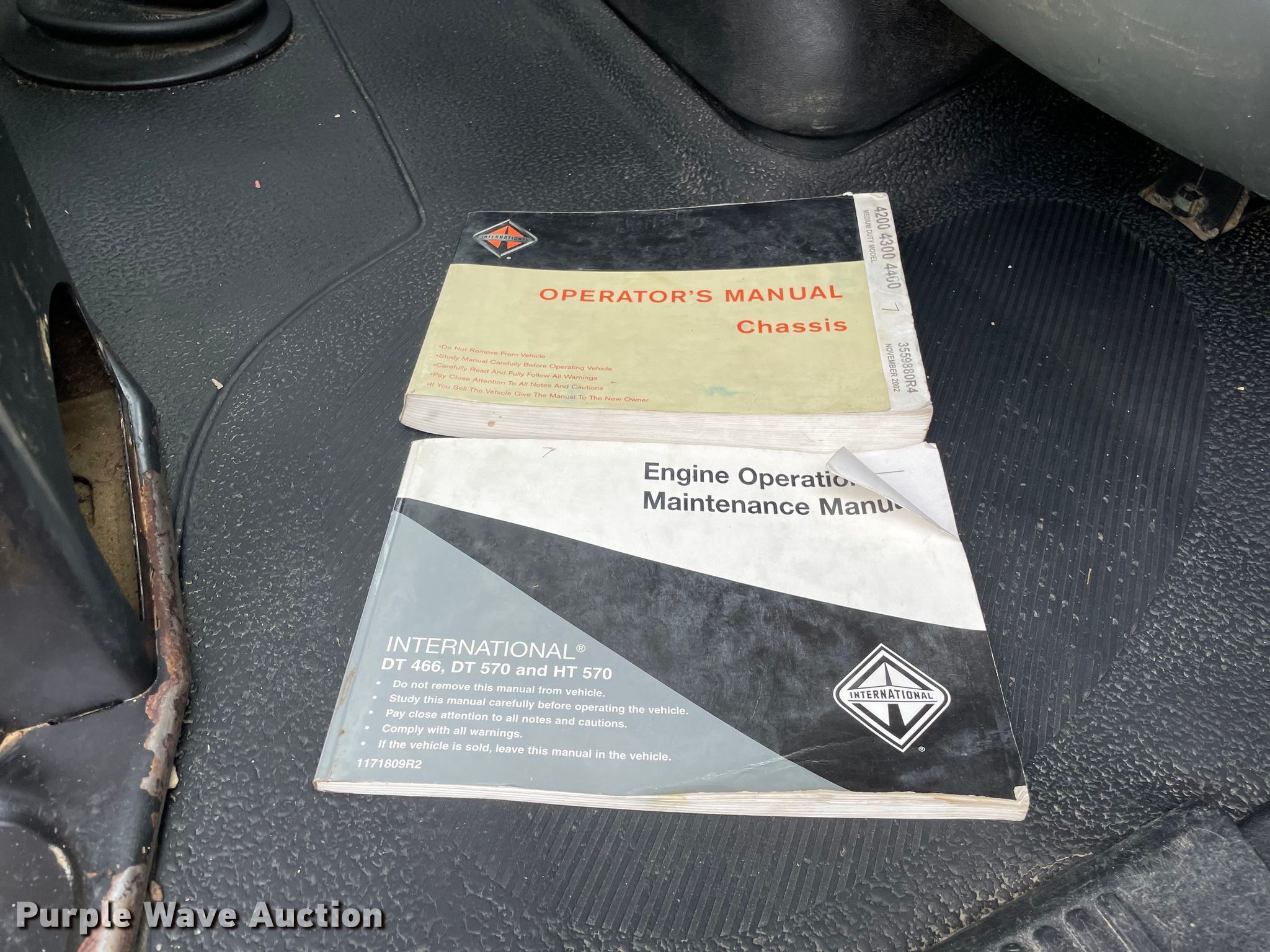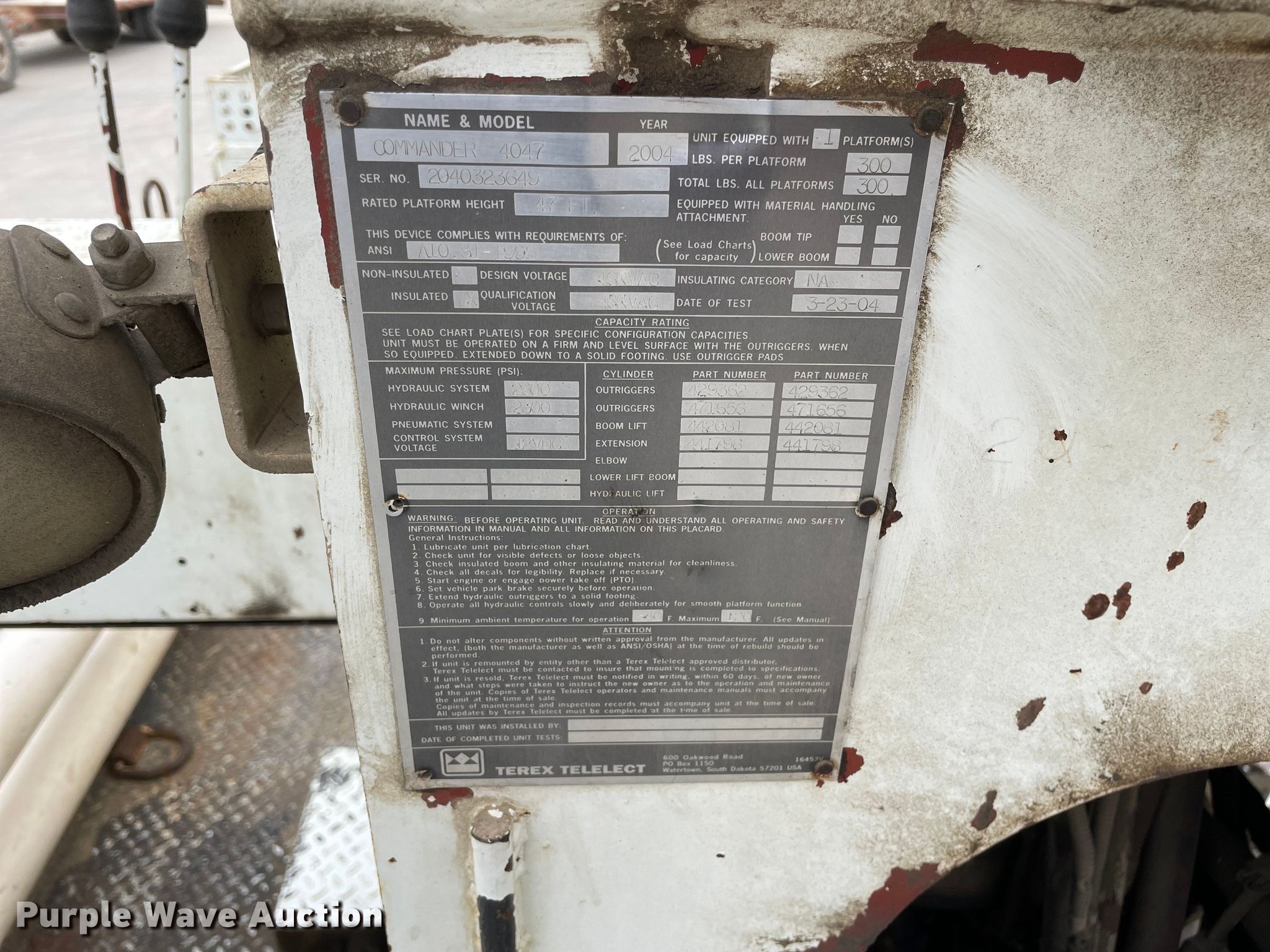 2005 International 4400 digger derrick truck. Miles: 195,960 on odometer, VIN: 1HTMKAAN25H694889, Unit #: 7. Engine International DT466, Displacement: 7.6L, Cylinders: 6, Fuel type: Diesel. Transmission Eaton Fuller, Manual, Speed: 6. Chassis Axles: Single, Suspension: Spring, Brakes: Air, PTO. Interior AC, Heat, Cruise control, Brake controller. Features Bed Terex Telelect, Serial: IN09193, 15' L x 95" W, Boom 2004 Terex Telelect Commander 4047, Serial: 2040323649, Mast height: 47', Maximum lift capacity: 300 lbs, Boom type: Insulated, Telescopic, Man basket, Boom controls Ground, Platform/ basket, Material handler, Pole guide, Auger Diameter: 18", Certification valid through: 06/2024. Tires Front: 11R22.5, Rear: Same. Notes Owners manual, Hydraulic leak at rear of truck. Illinois title. Title distribution may be delayed up to 14 days from verification of funds. Norris Electric CO-OP. 8543 Illinois 130. Newton, IL 62448