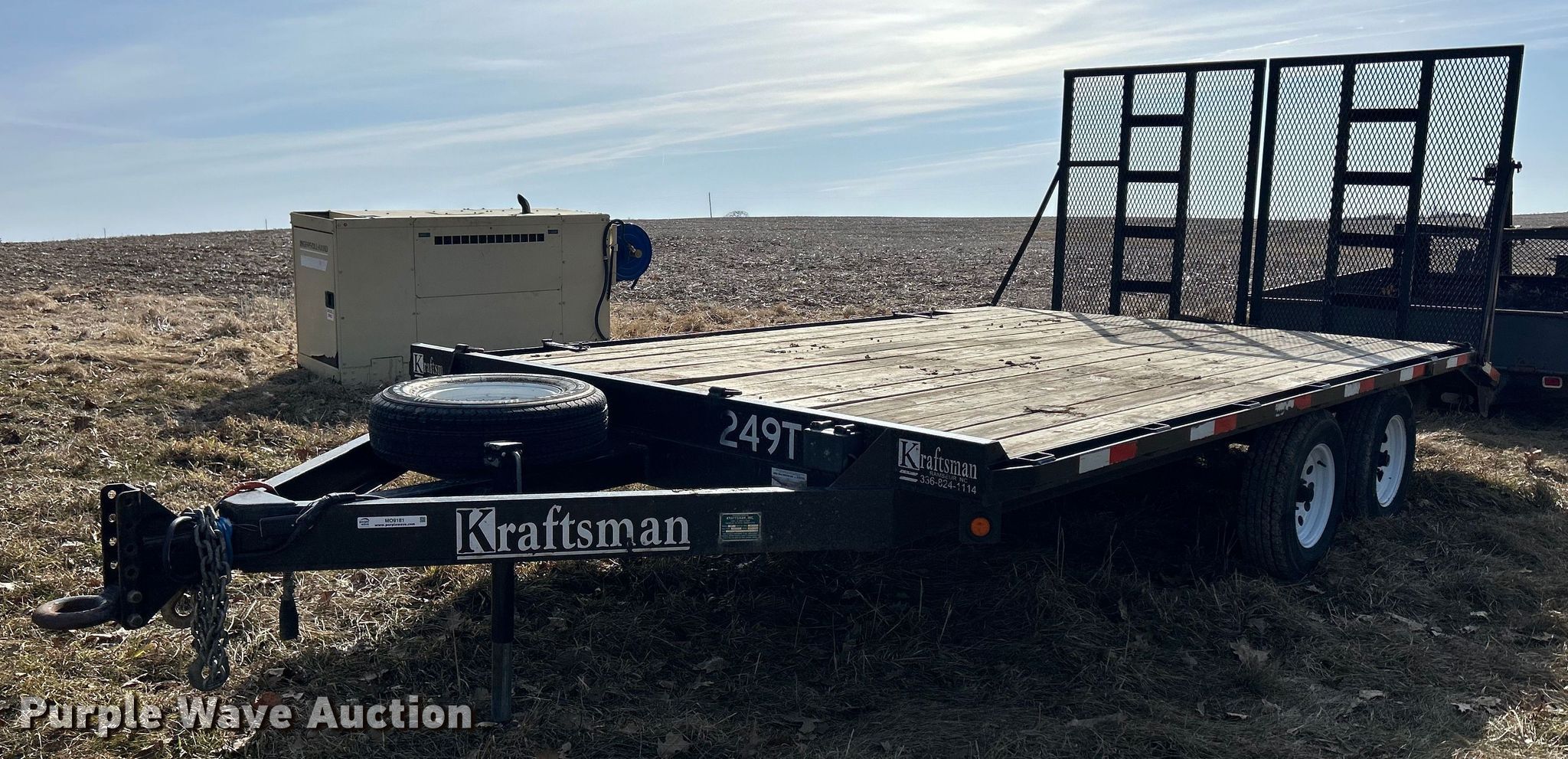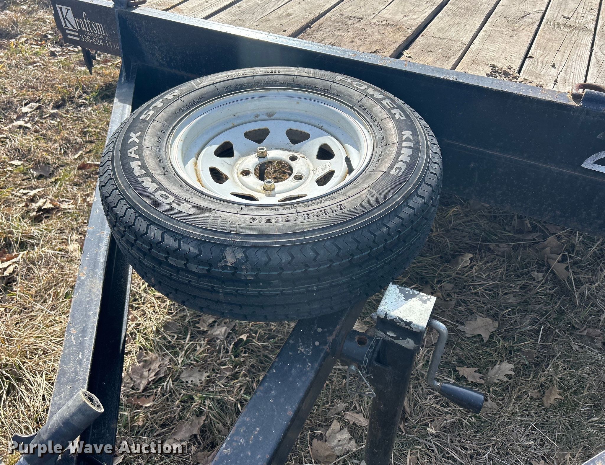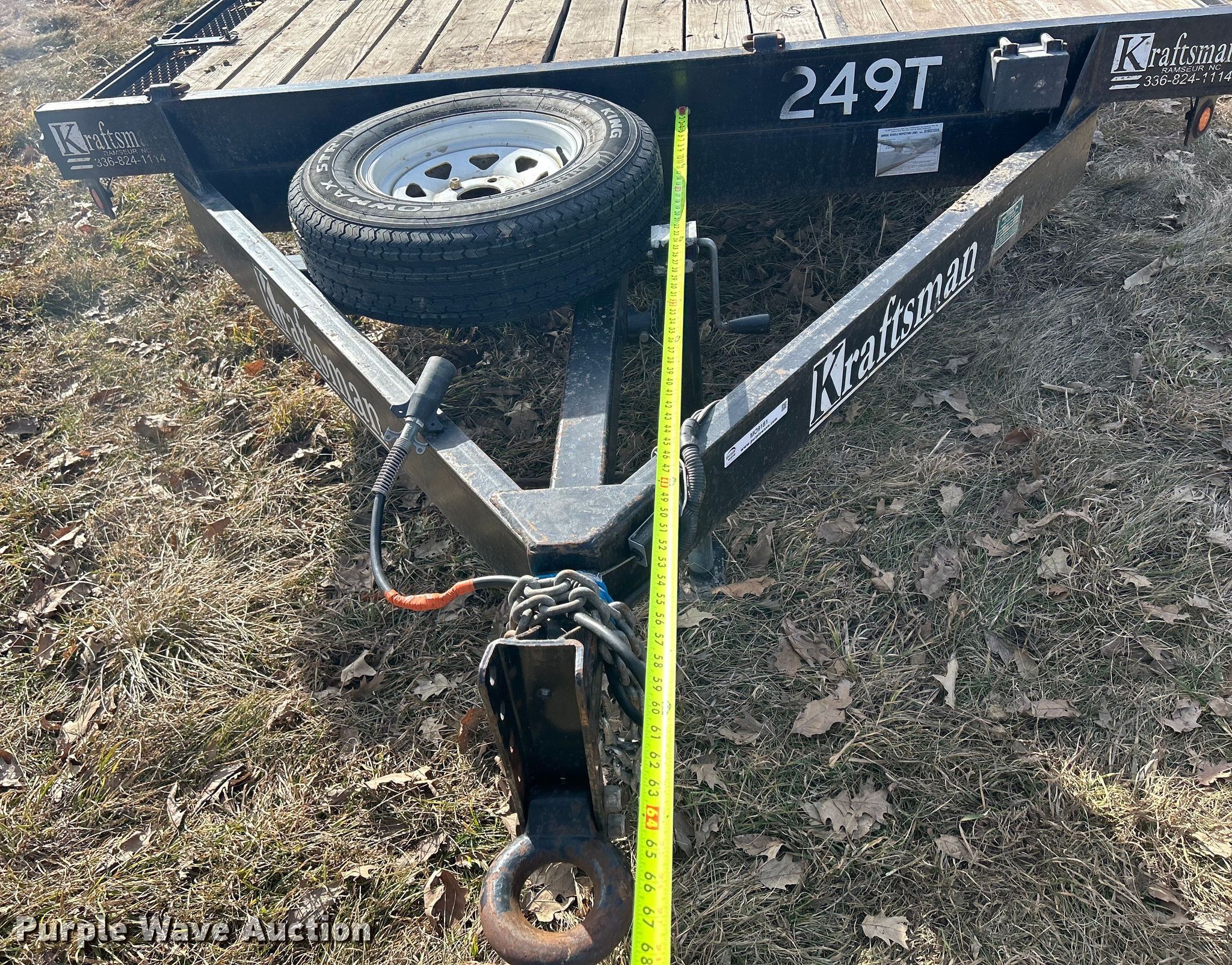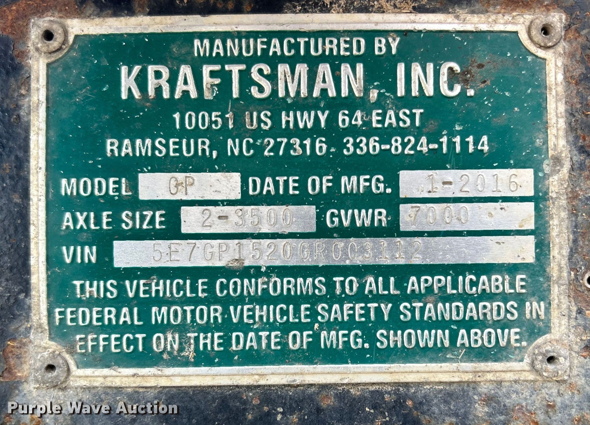 2016 Kraftsman GP utility trailer. VIN: 5E7GP1520GR003112. Dimensions Overall: 20' 5" L x 102" W, Deck: 12' 6" L x 96" W, Deck height: 30", Tail length: 2', Ramps: Manual Length: 5'. Features Deck type: Wood. Chassis Landing gear: Single, Suspension: Spring, Brakes: Electric, Axles: Tandem, GVWR: 7,000 lbs, Hitch: Pintle. Tires Steel wheels, Size: 205/75R14. Notes Additional wheel and tire included. Wisconsin title. Title distribution may be delayed up to 14 days from verification of funds. E6636 Belgium Ridge Road. Viroqua, WI 54665