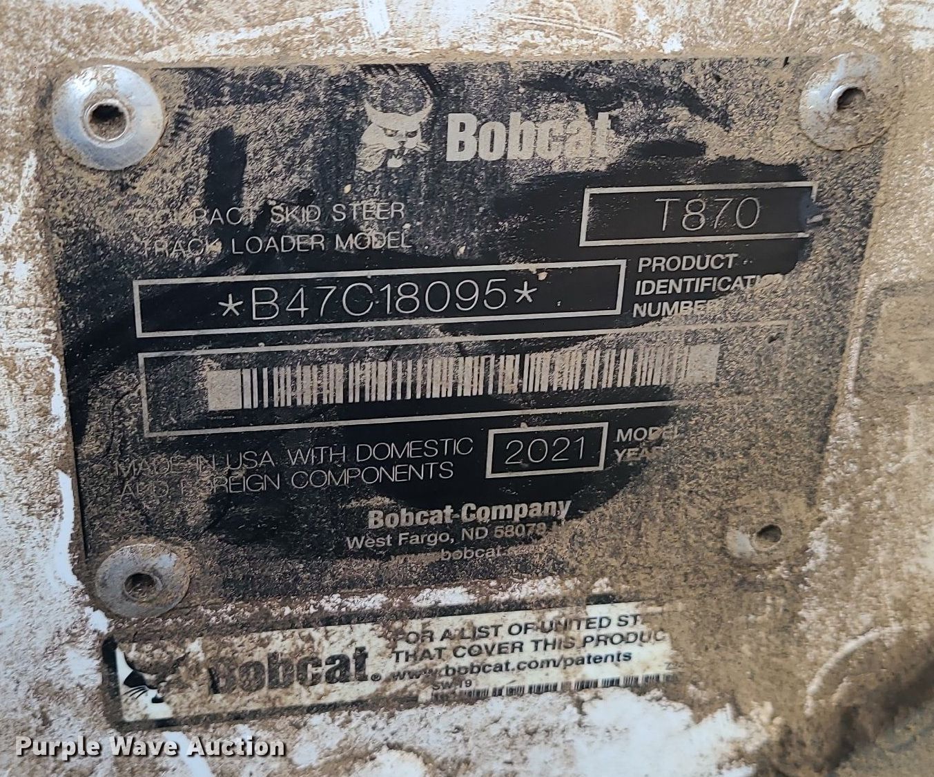 Purple Wave is selling a used Tracked Skid Steer Loader in Missouri. This item is a 2021 Bobcat T870 tracked skid steer loader with the following: Hours: 668 on meter, Serial: B47C18095
