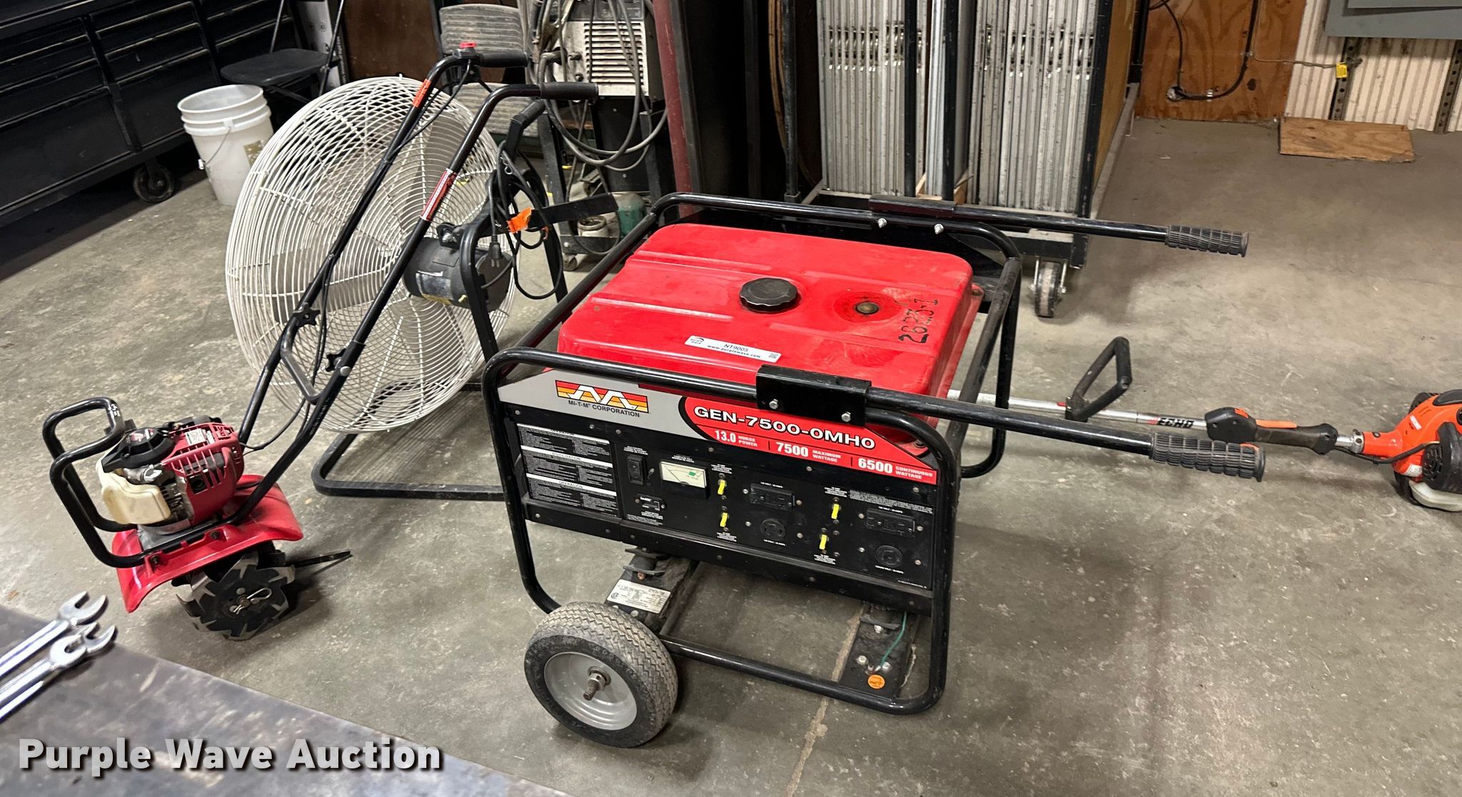 Purple Wave is selling a used Tools in Kansas. This item is a Tools with the following: Tiller, Honda GX25 engine, Fuel type: Gas, Echo edger, Mi-T-M corporation generator, Watts: 7500, HP: 13.5, Fan, Lawn roller, Width: 23", Cement mixer