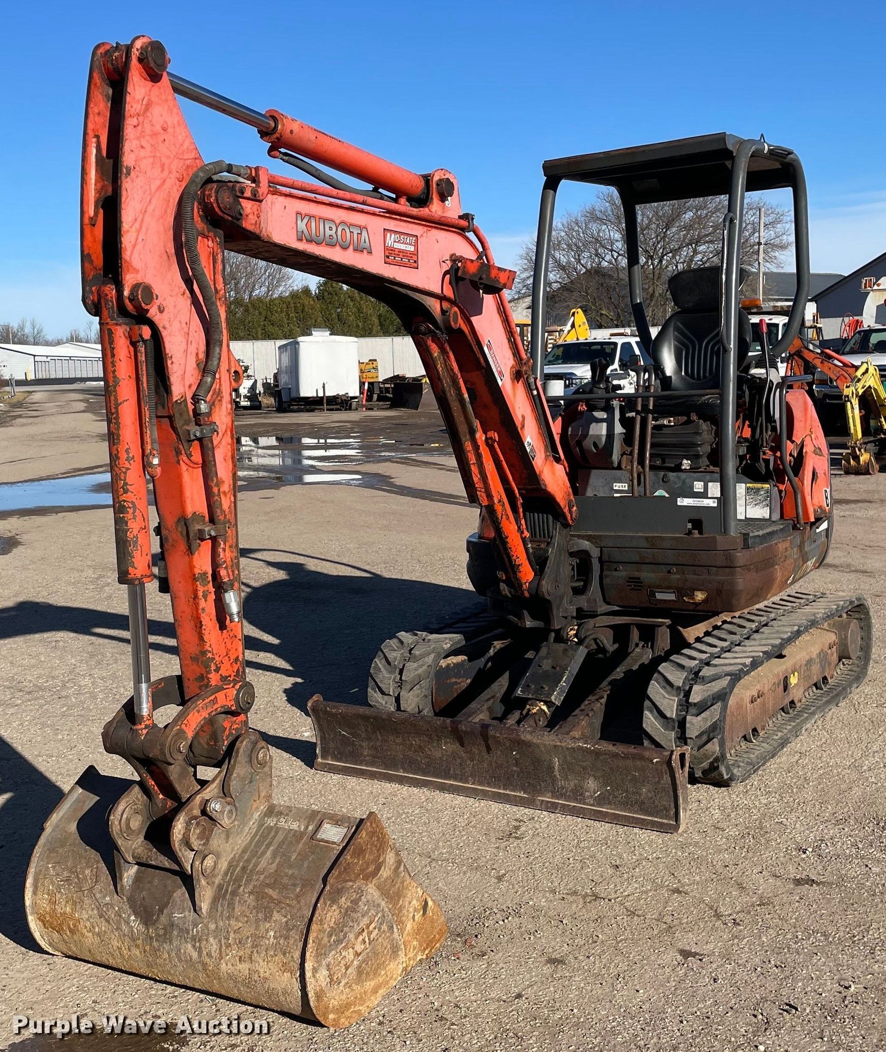 2011 Kubota KX71-3S mini excavator. Hours: 4,602 on meter, Serial: JKUK0713K01H12543, Unit #: B29. Engine Kubota V1505, Cylinders: 4, Fuel type: Diesel. Transmission Hydrostatic, Two speed travel. Operators station OROPS, Pattern changer. Features Auxiliary hydraulics, Backfill blade Width: 59", Boom Swing, Stick Stick length: 53", Quick coupler: Mechanical, Bucket Width: 36", Bucket Width: 12", Teeth: 3. Tracks Width: 11.5", Rubber. Ken Becker & Sons - Open Inspection March 20. W197N7555 F and West Court. Lannon, WI 53046