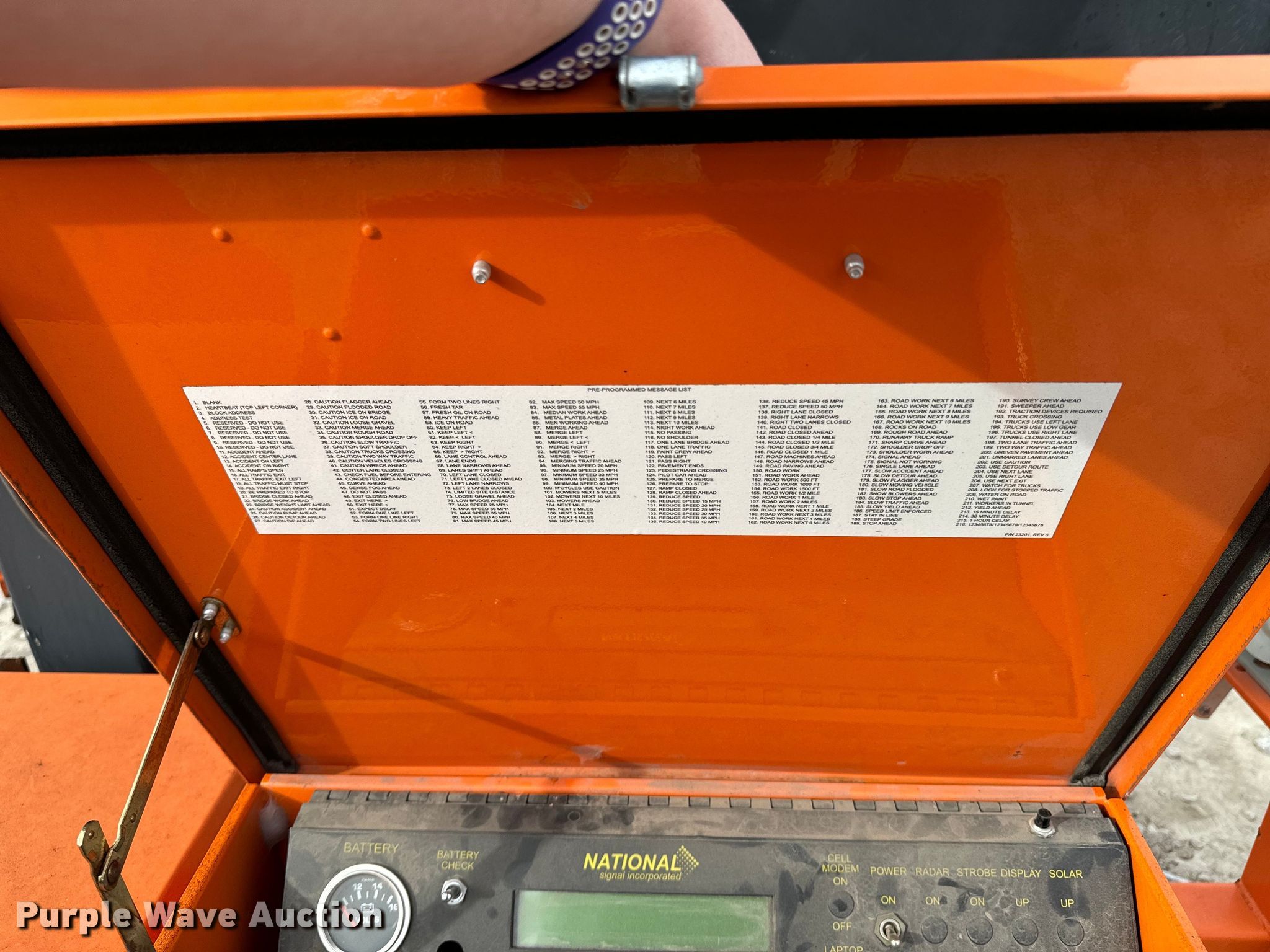 Purple Wave is selling a used Road Safety Equip. in Oklahoma. This item is a 2017 National Signal Sunray message board trailer with the following: VIN: 1N9MT1115HF272350, Serial: F272350