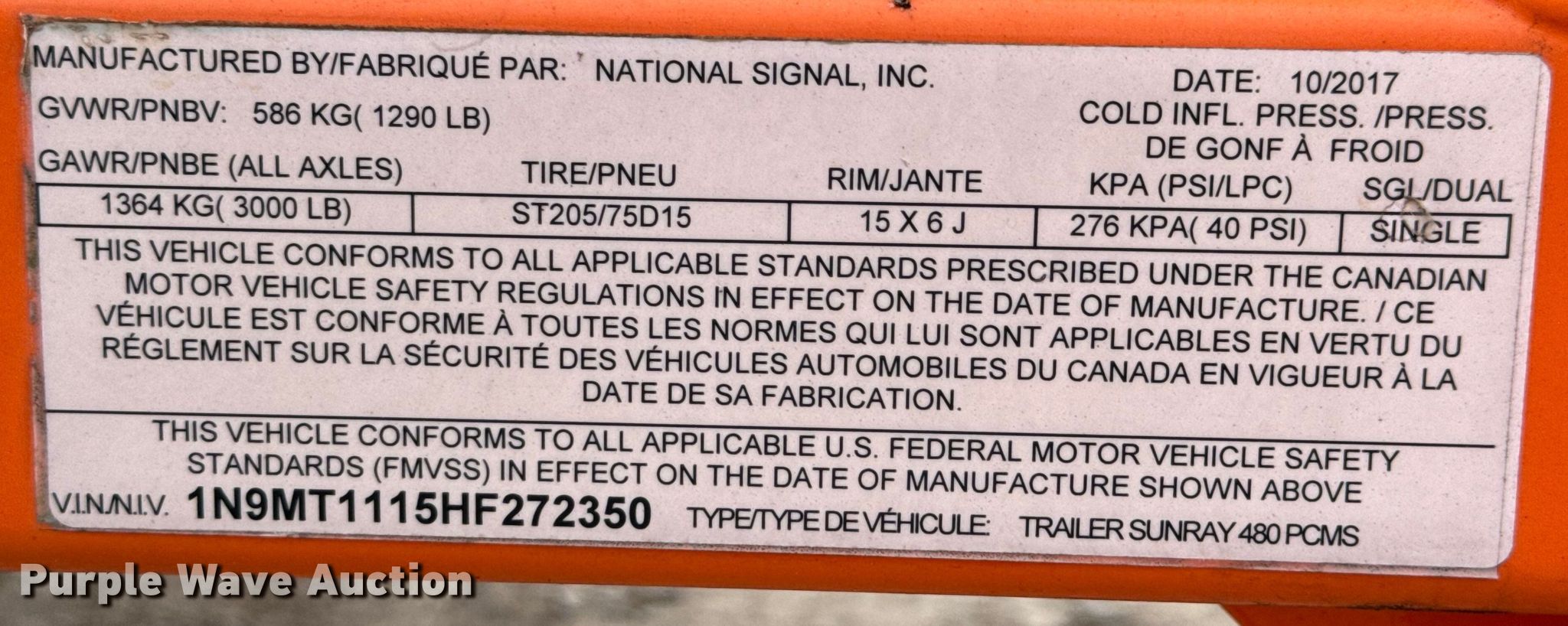 2017 National Signal Sunray message board trailer. VIN: 1N9MT1115HF272350, Serial: F272350. Features VAC: 108-132, Dimensions: 11' L x 74" W, Hitch: 2" ball, GVWR: 1,290 lbs. Tires Size: ST205/75D15, Steel wheels. Notes No batteries, Unknown operating condition. This is worksite support equipment and will not come with a title. Transfer of ownership documentation will be a bill of sale. Chouteau, OK 74337