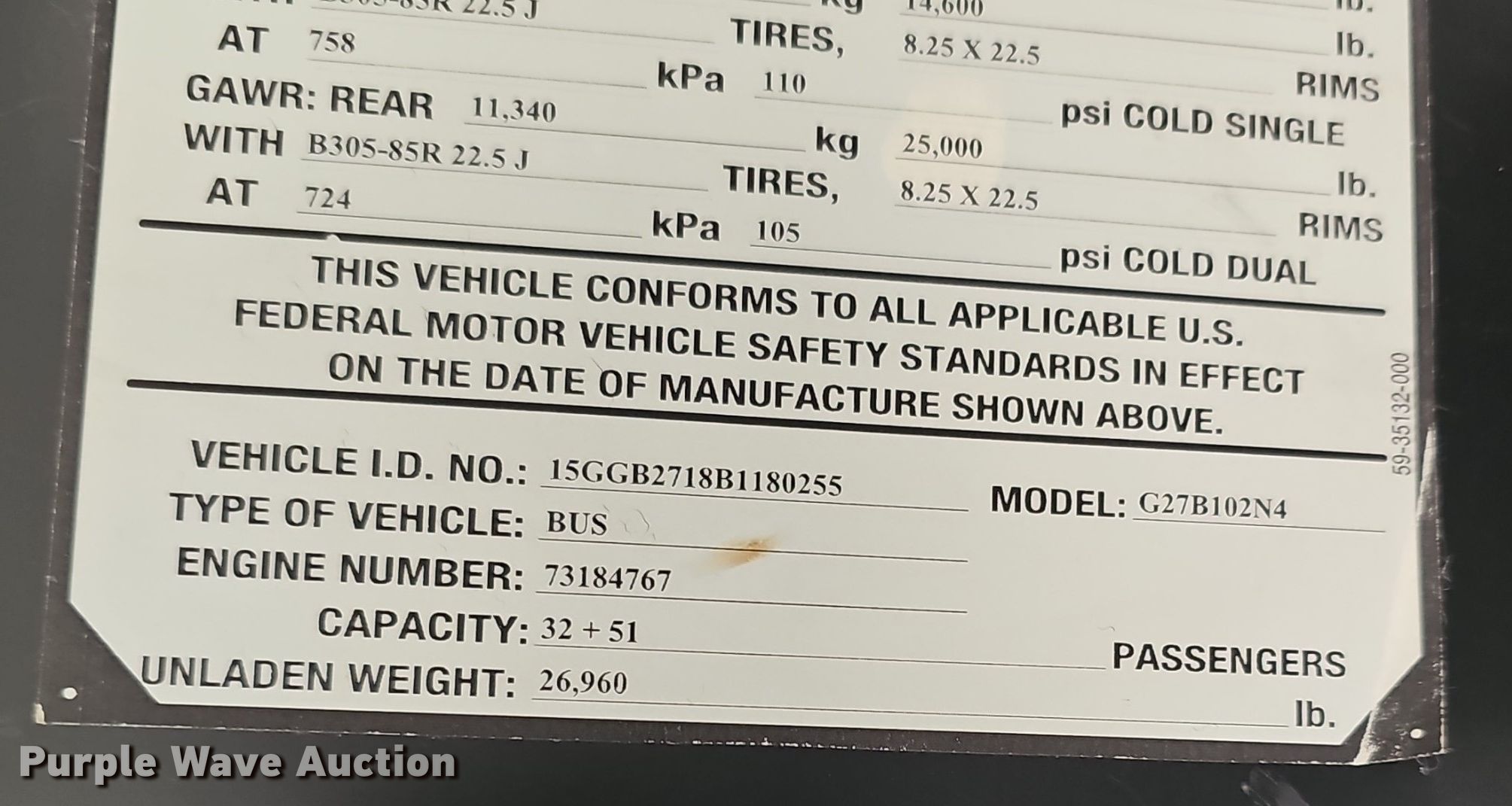 2011 Gillig G27B102N4 transit bus. Miles: 432,772 on odometer, VIN: 15GGB2718B1180255. Engine Cummins, Serial: 73184767, Displacement: 8.9L, Cylinders: 6, Fuel type: Diesel. Transmission Automatic. Chassis Axles: Single, Suspension: Air, Brakes: Air, GVWR: 39,600 lbs, Wheelbase: 232". Interior AC, Heat, Heated mirrors, Electric passenger sliding door, Passengers: 32. Features Wheelchair lift. Tires Size: B305/85R22.5, Brand: Goodyear. Kansas title. Title distribution may be delayed up to 14 days from verification of funds. Topeka, KS 66619