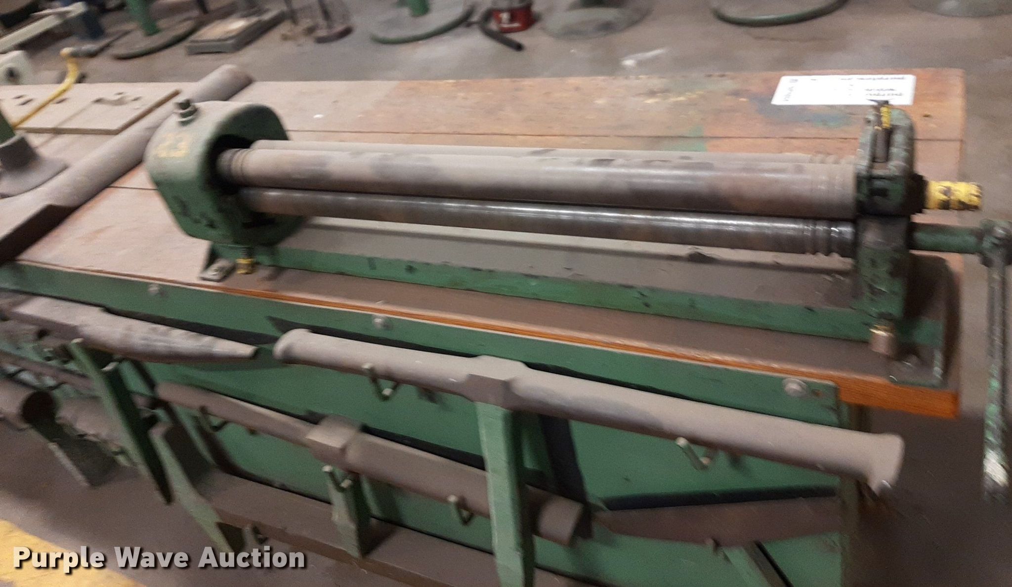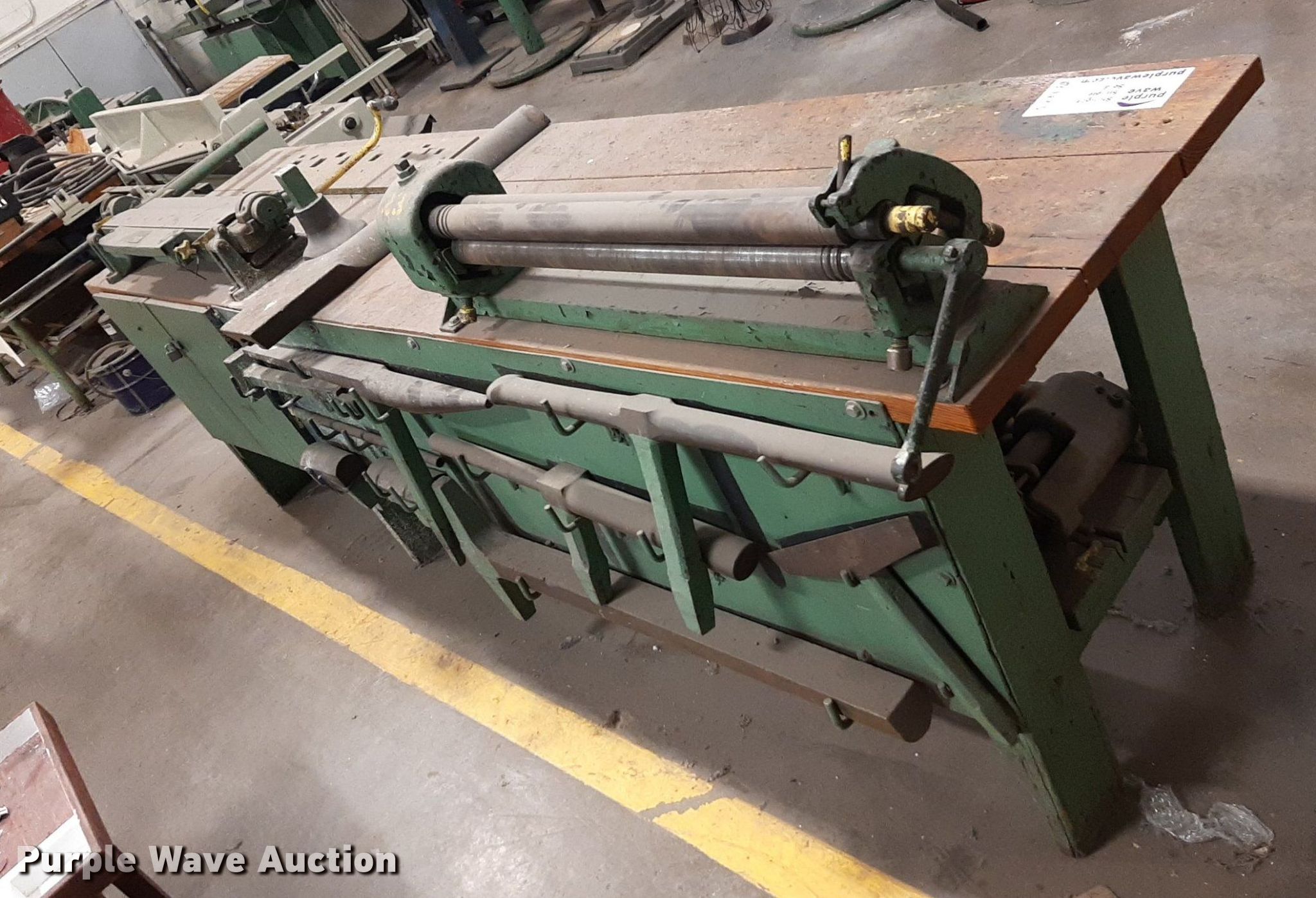 Purple Wave is selling a used Tools in Kansas. This item is a Tools with the following: Peck Stow and Wilcox 63-H 30" sheet metal brake, Capacity: 22 gauge, 30" sheet metal roller, (10) anvil attachments, Table, 9' 10" L x 28" W