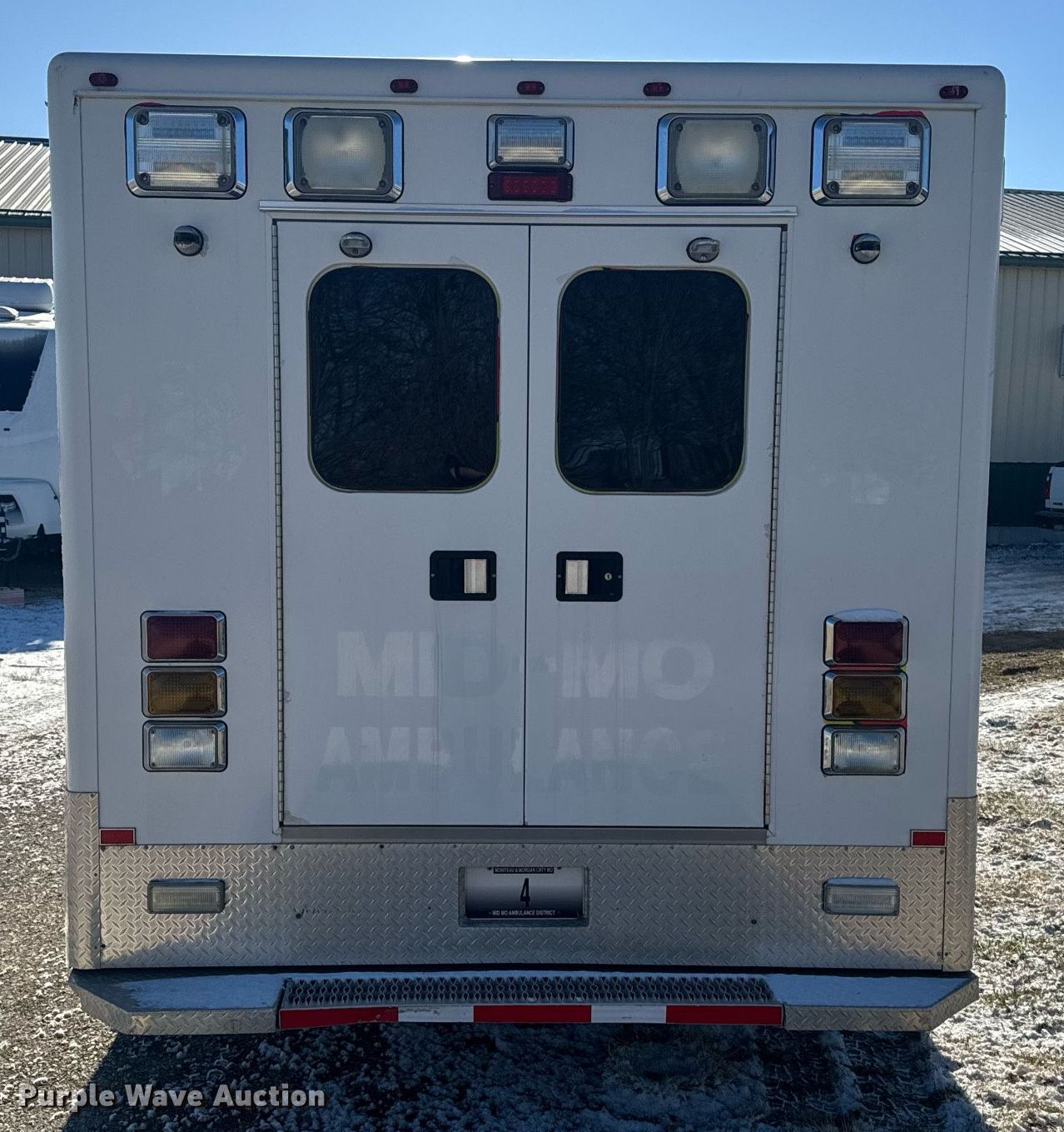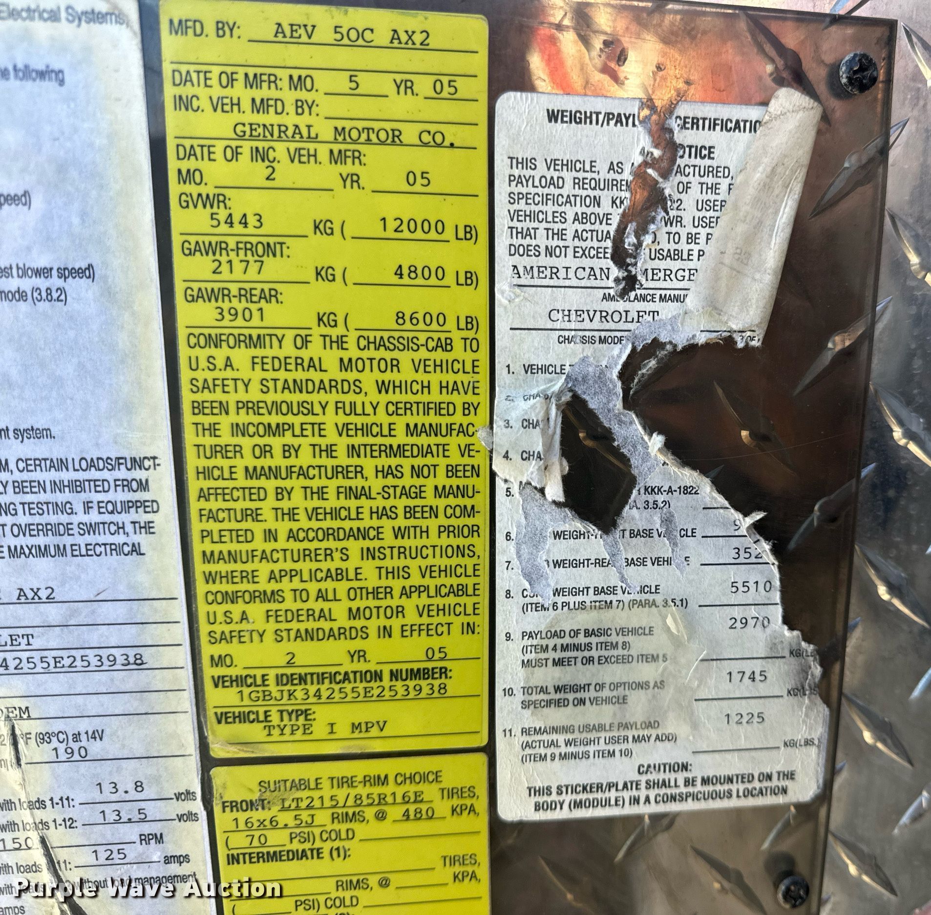 2005 Chevrolet Silverado 3500 ambulance. Miles: 197,601 on odometer, VIN: 1GBJK34255E253938. Engine Displacement: 6.6L V8 OHV, Cylinders: 8, Fuel type: Diesel. Transmission Automatic. Chassis Four wheel drive, Axles: Single, Suspension: Spring, Brakes: Hydraulic, GVWR: 12,000 lbs. Interior AC, Heat, Power windows, Power locks, Cruise control. Features Ambulance body AEV 50C AX2 Type I. Tires Size: LT225/75R16. Notes Possible head gasket issue, uses coolant. Kansas title. Title distribution may be delayed up to 14 days from verification of funds. Mid-Mo Ambulance District. 17530 Highway T. Versailles, MO 65084