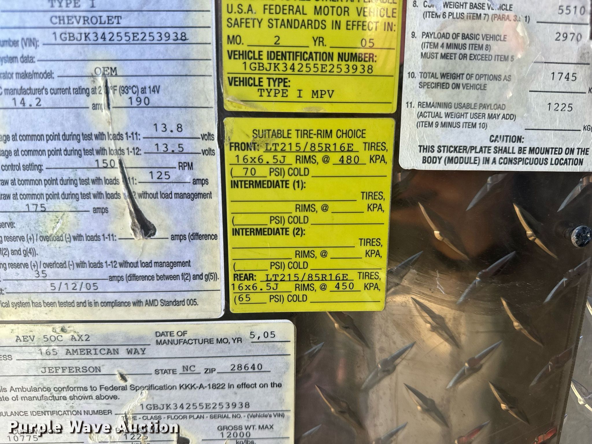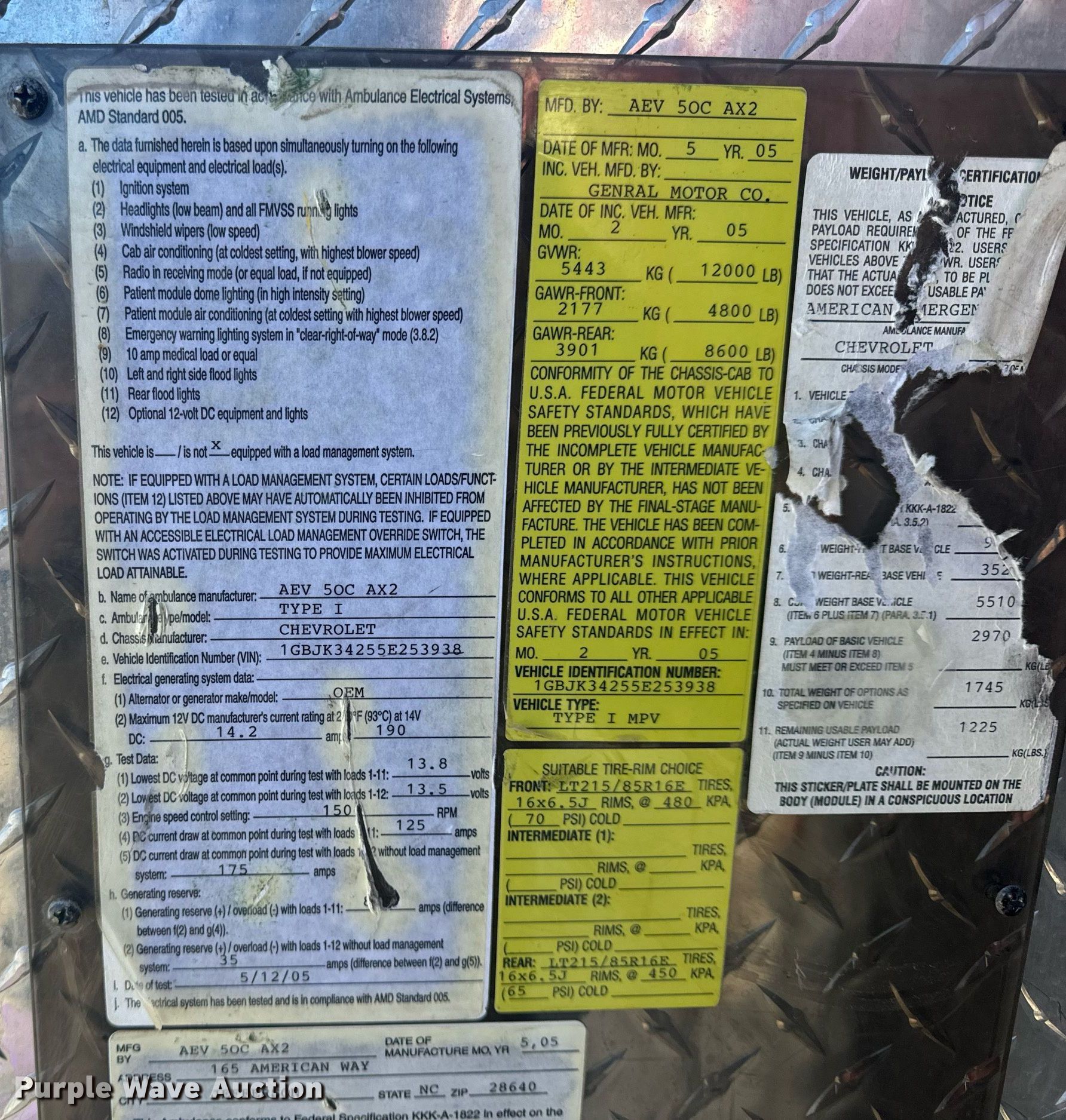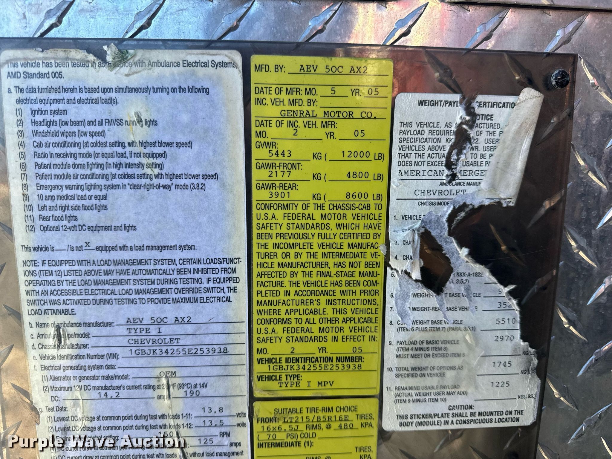 Purple Wave is selling a used Fire Truck or Emergency Vehicle in Missouri. This item is a 2005 Chevrolet Silverado 3500 ambulance with the following: Miles: 197,601 on odometer, VIN: 1GBJK34255E253938
