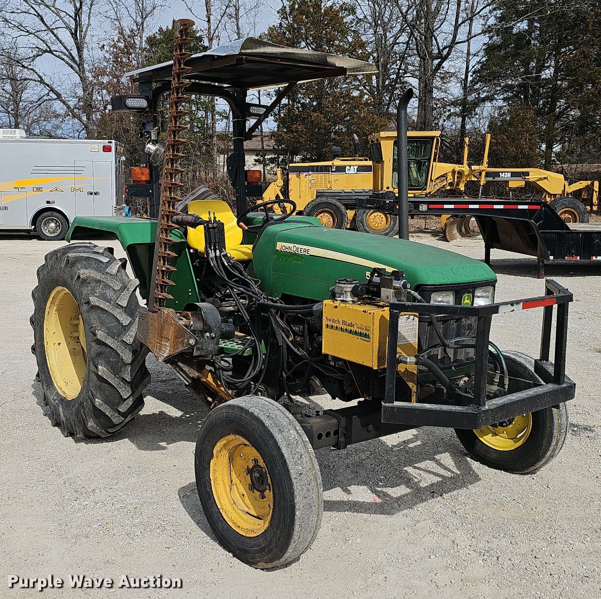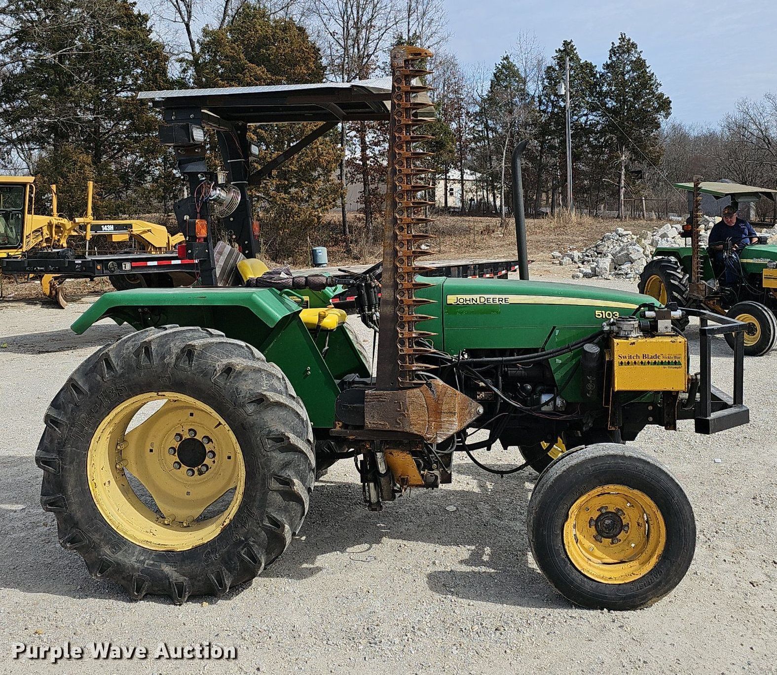 2004 John Deere 5103 tractor. Hours: 3,138 on meter, Serial: PY5103U03386. Engine John Deere, Displacement: 2.9L, Cylinders: 3, Fuel type: Diesel. Transmission Synchro, 9F - 3R, Differential lock. Features PTO: 540, Three point, Hydraulic remote sets Front: 2, Switch Blade Sickle mower 5'. Tires Front: 7.50-16, Rear: 14.9-28. Notes Three point arms missing, Unknown operating condition of PTO, control missing. Taney County, MO. 20058 Us Hwy 160. Kisse Mills, MO 65680