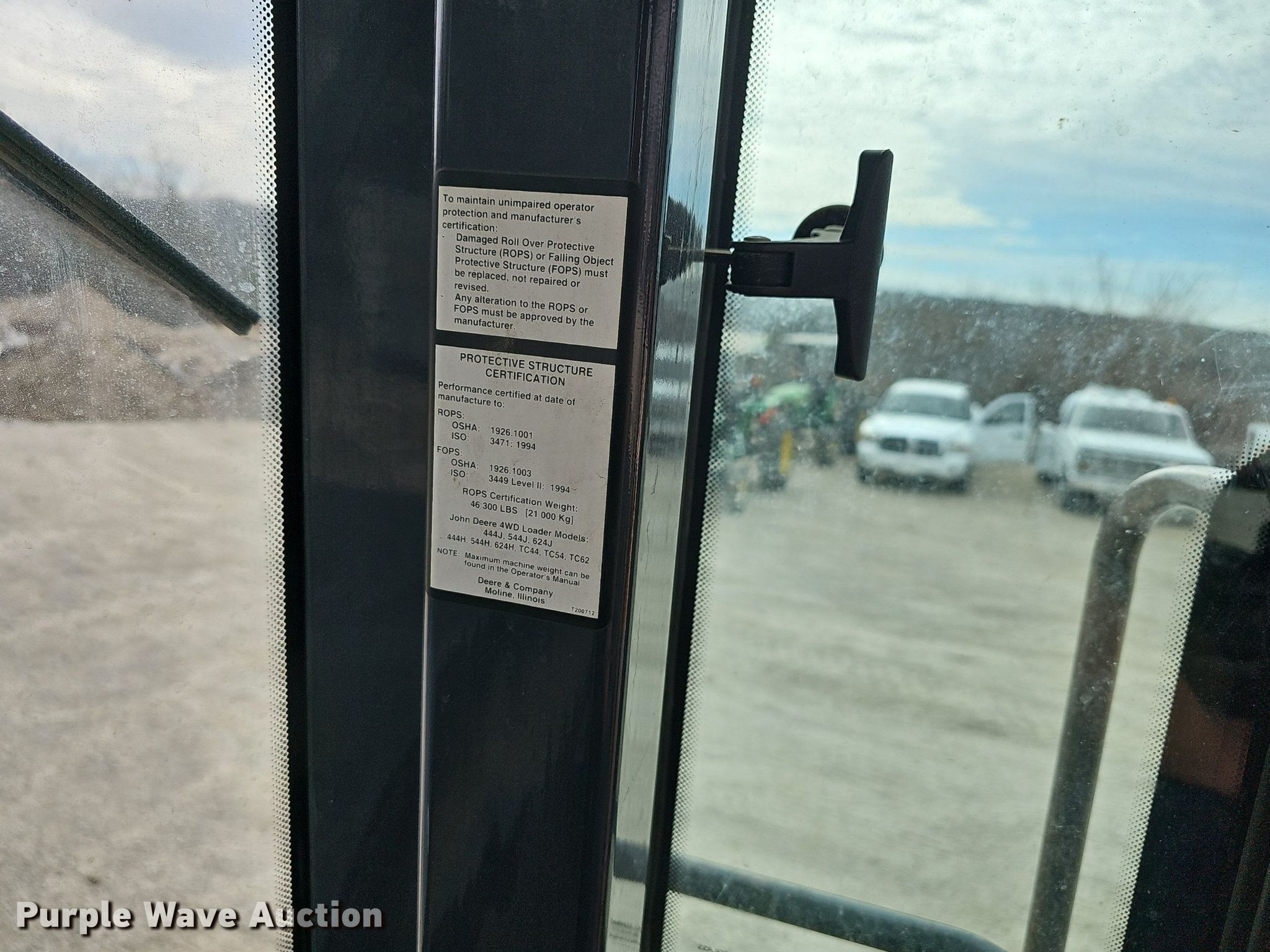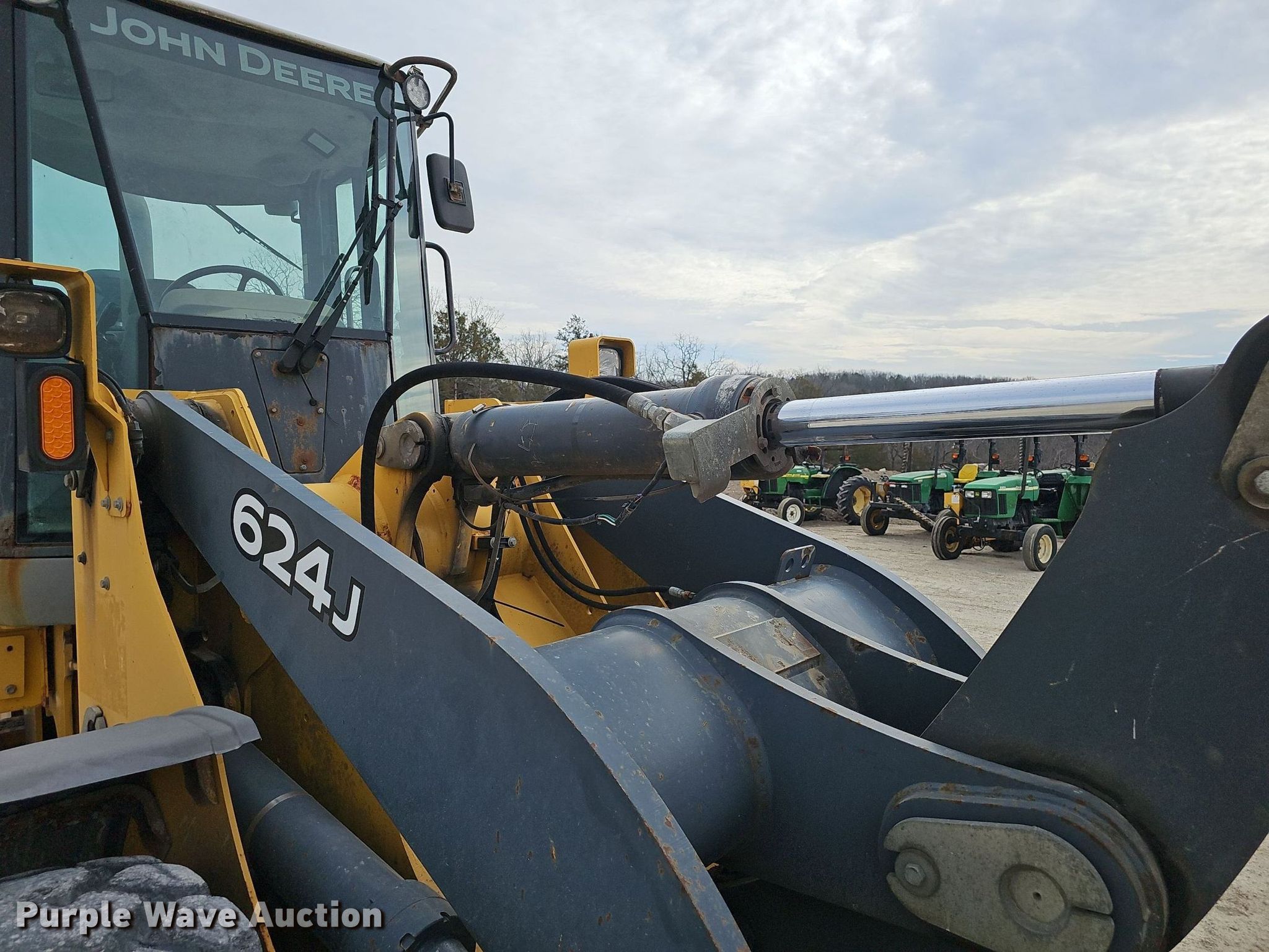2005 John Deere 624J wheel loader. Hours: 3,250 on meter, Serial: DW624JZ599213. Engine John Deere, Serial: PE6068H477172, Displacement: 414 C.I.D., Cylinders: 6, Fuel type: Diesel. Transmission Powershift, 4F - 4R. Chassis Differential lock: Front. Operators station Enclosed cab, AC, Heat, Bucket controls: Joystick. Features Bucket John Deere, Width: 104", Cutting edge: Bolt-on, Forks JRB, Length: 60". Tires Size: 20.5R25. Taney County, MO. 20058 Us Hwy 160. Kisse Mills, MO 65680