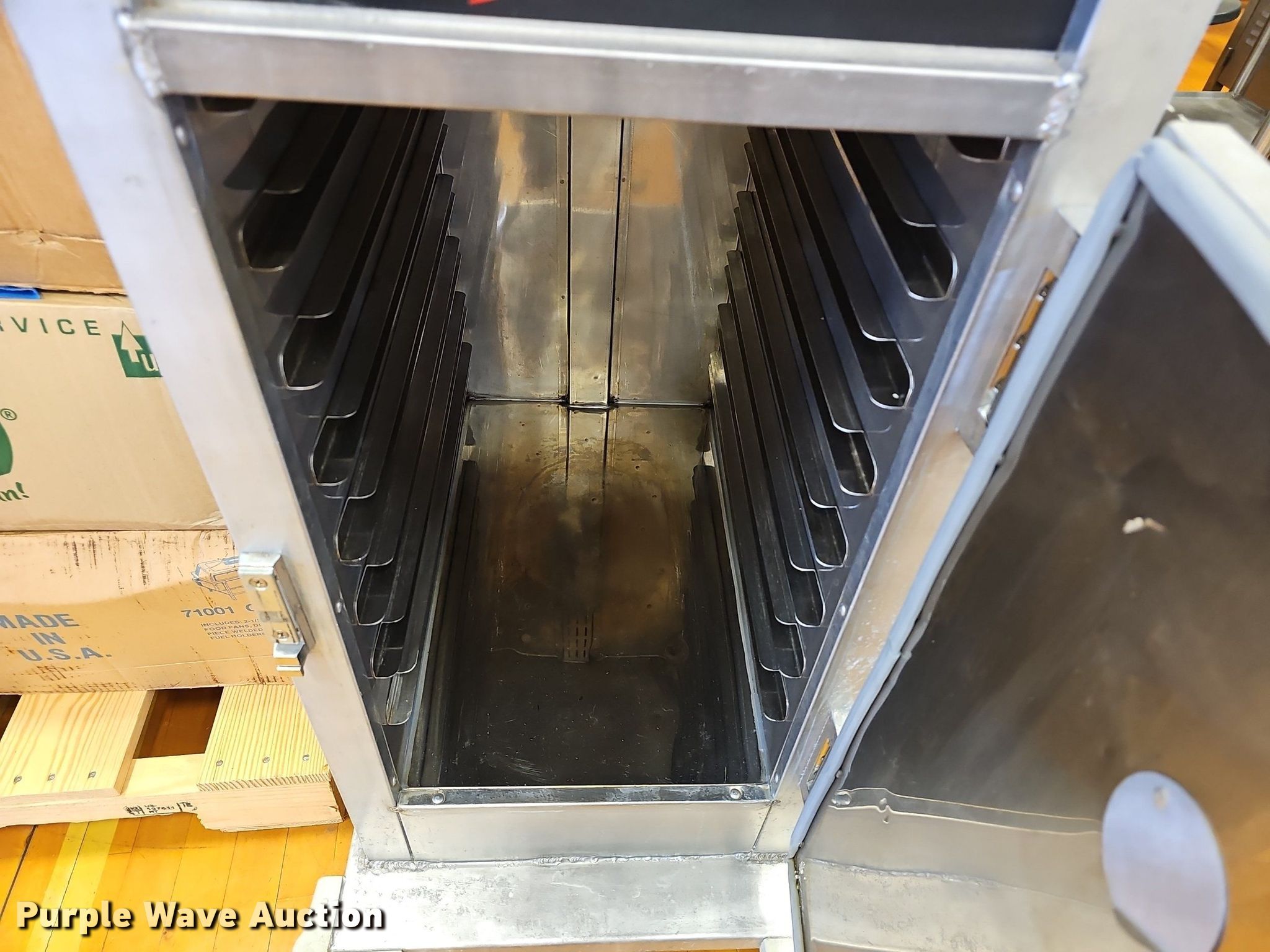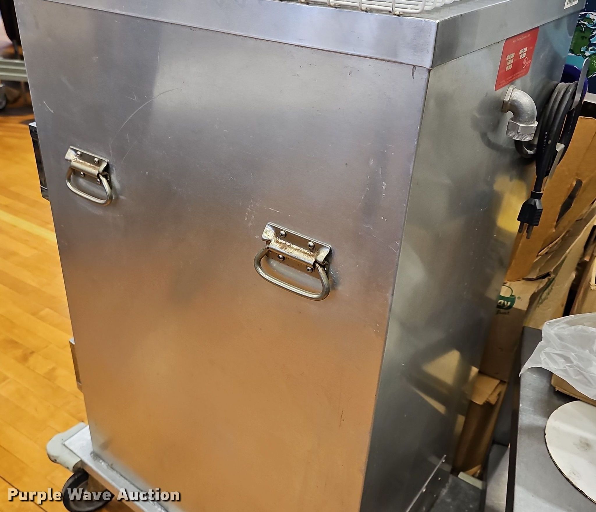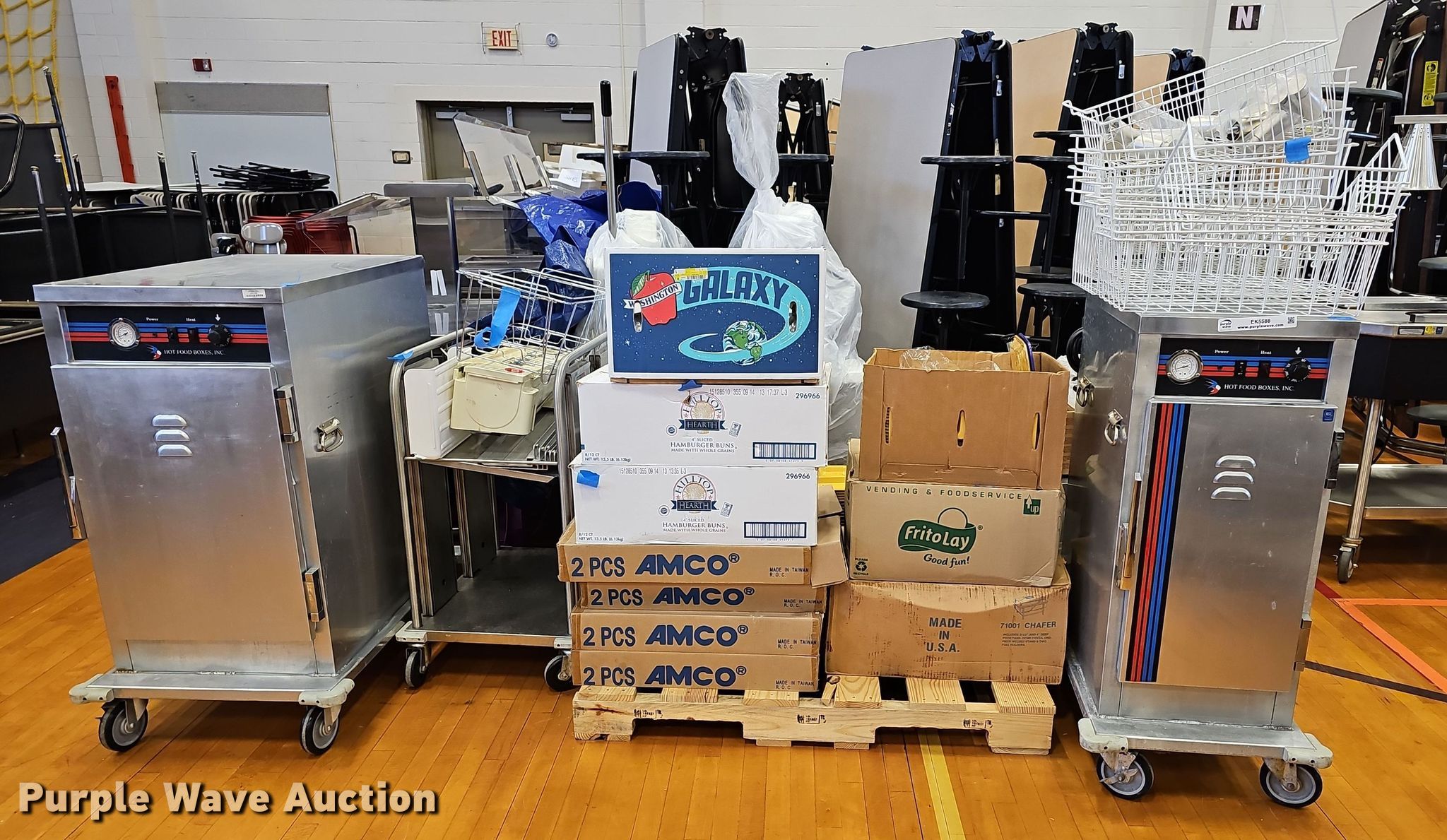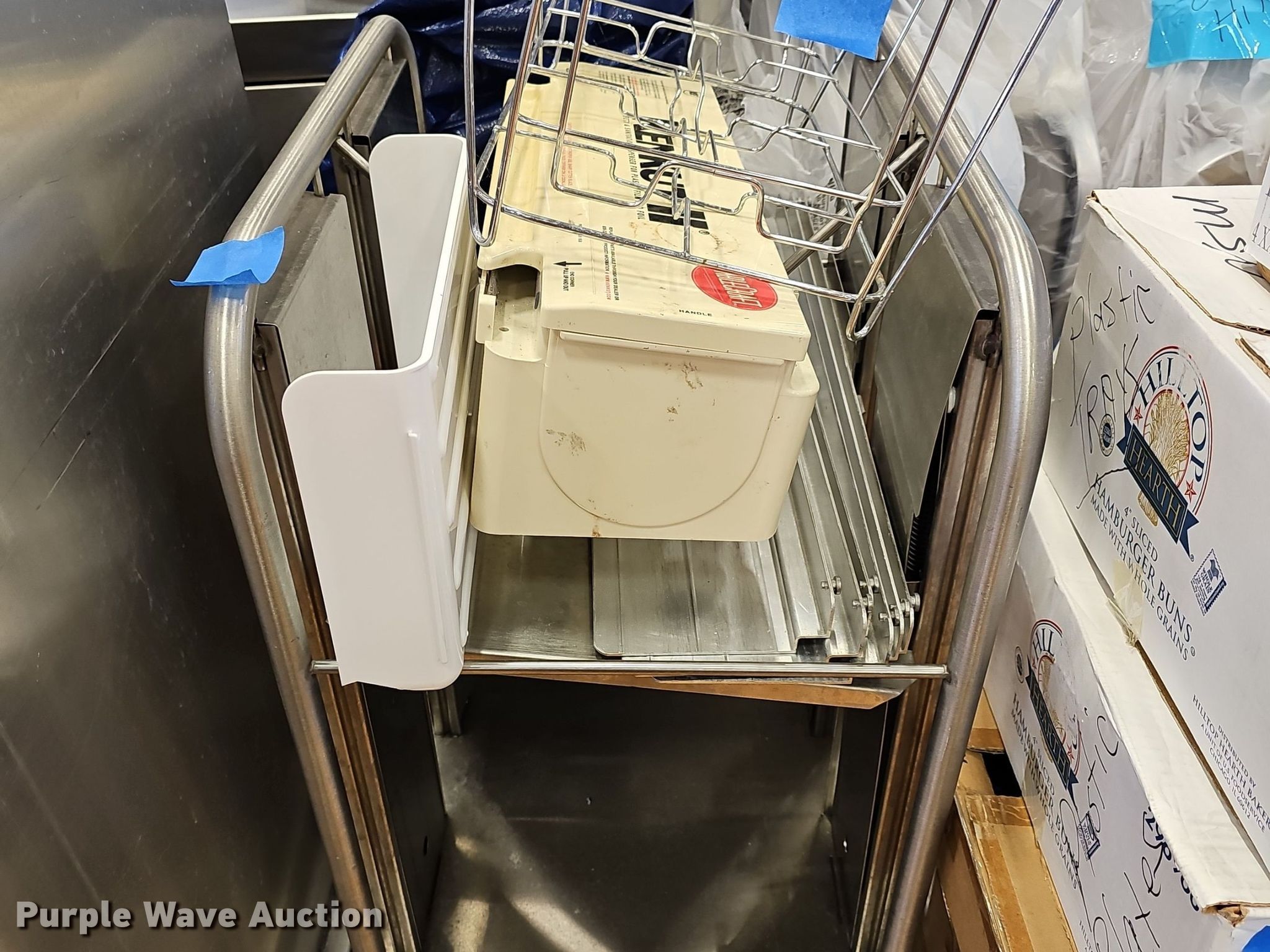 Purple Wave is selling a used Restaurant Equip. in Kansas. This item is a Kitchen equipment with the following: (2) hot food boxes, Food trays, Condiment dispensers, Wire racks, Kenkut II Foil/plastic wrap dispenser, Scale and more