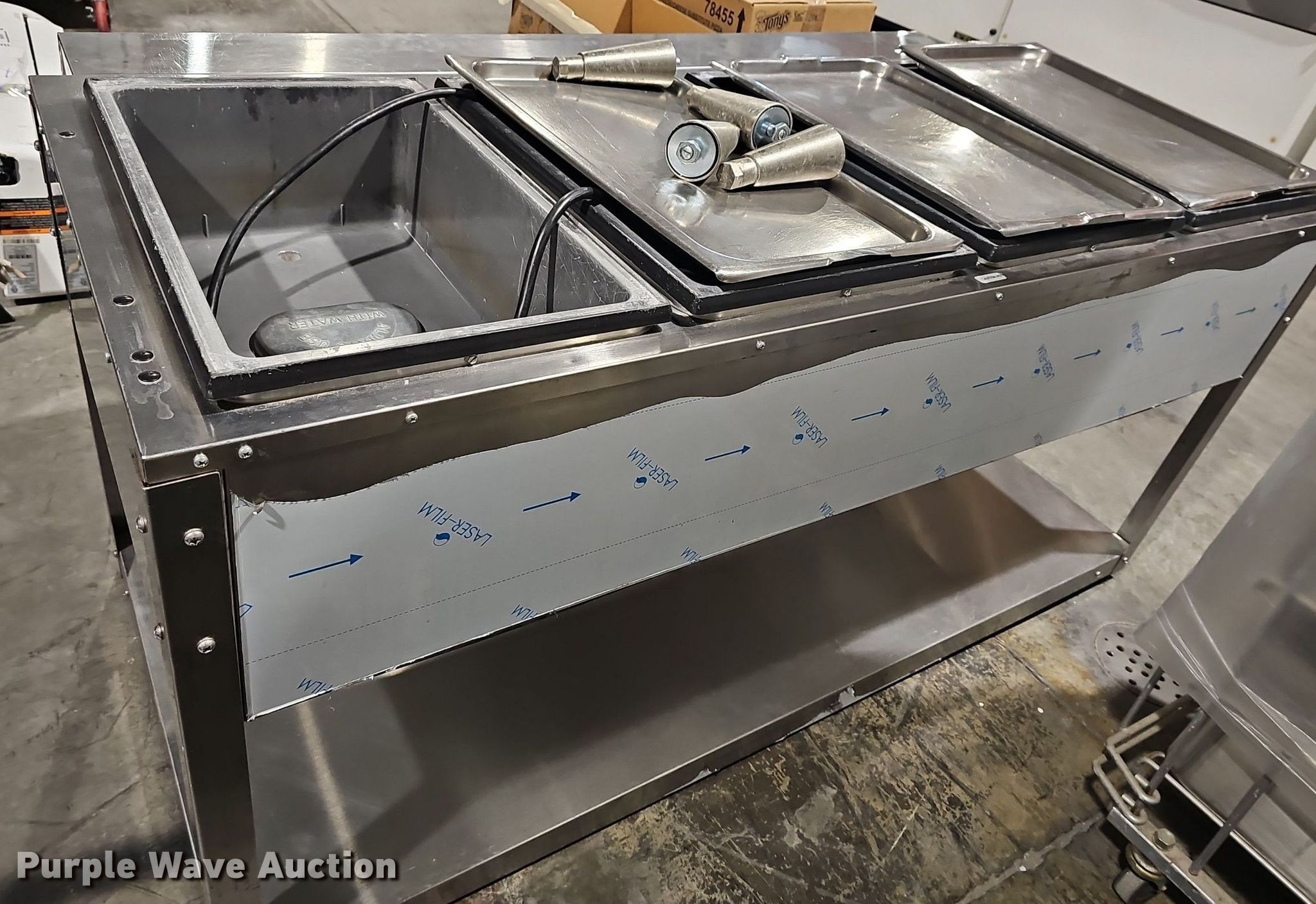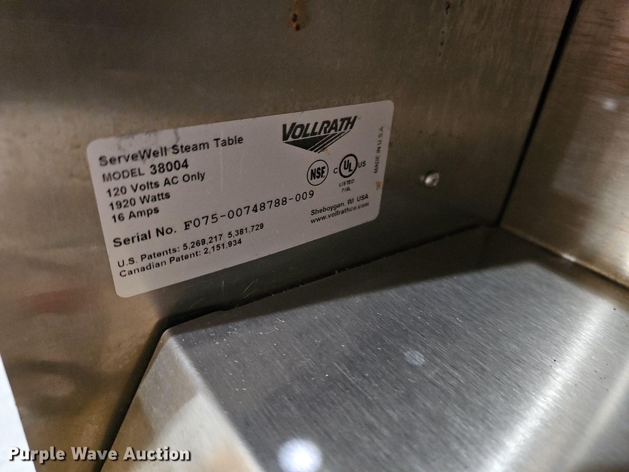 Purple Wave is selling a used Restaurant Equip. in Kansas. This item is a Restaurant equipment with the following: Vollrath ServeWell steam table, Serial: F075-00748788-009, Volts: 120, Containers, Dimensions: 61" x 33" x 38", Approx. 100 lunch trays