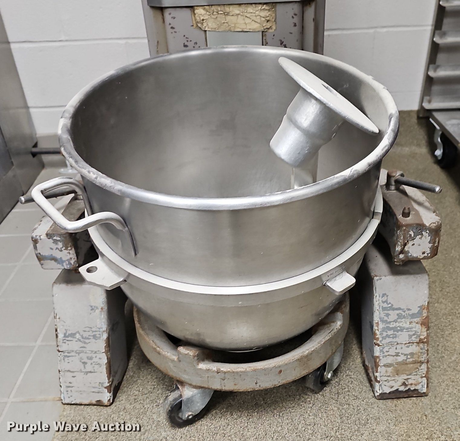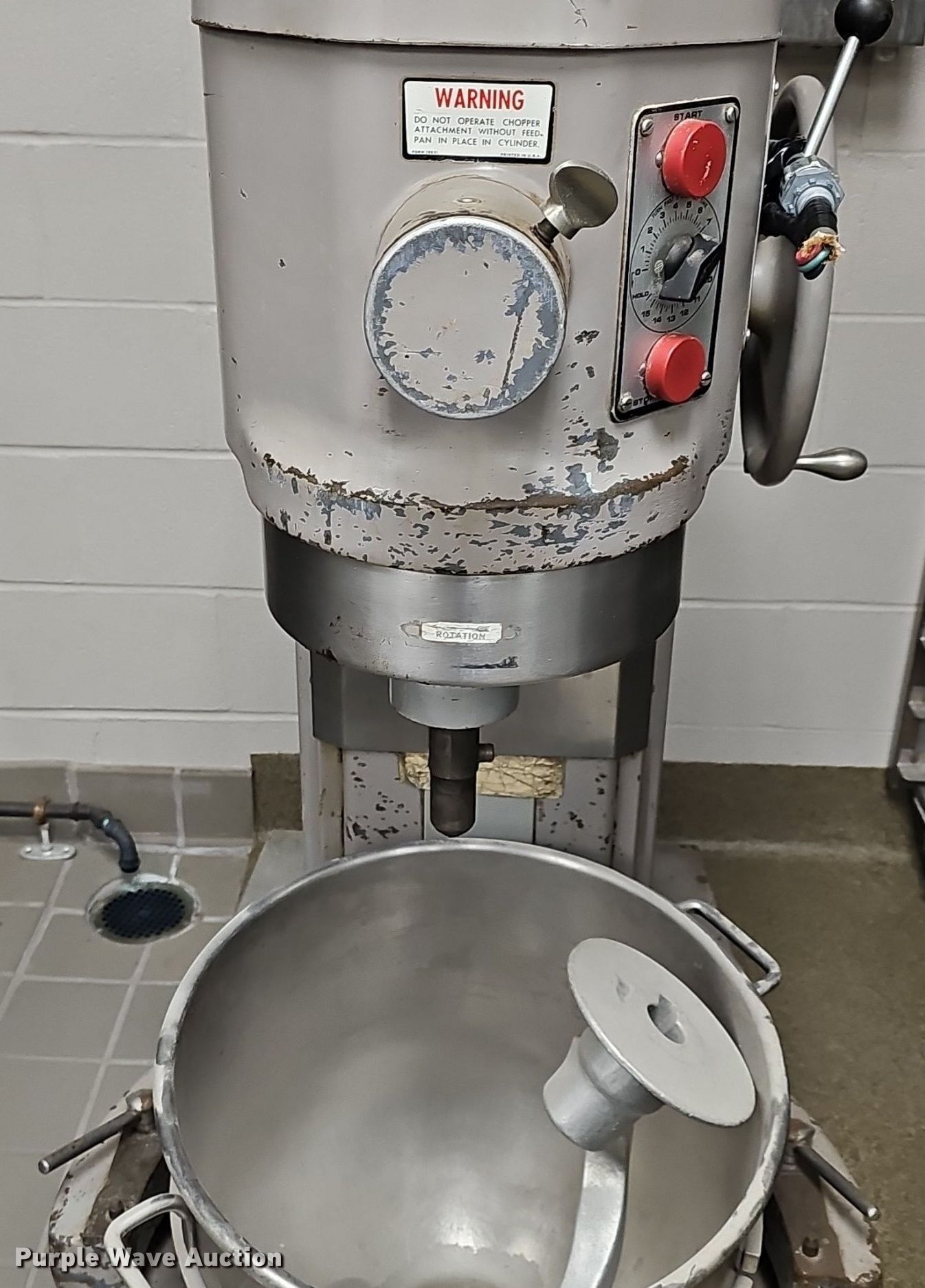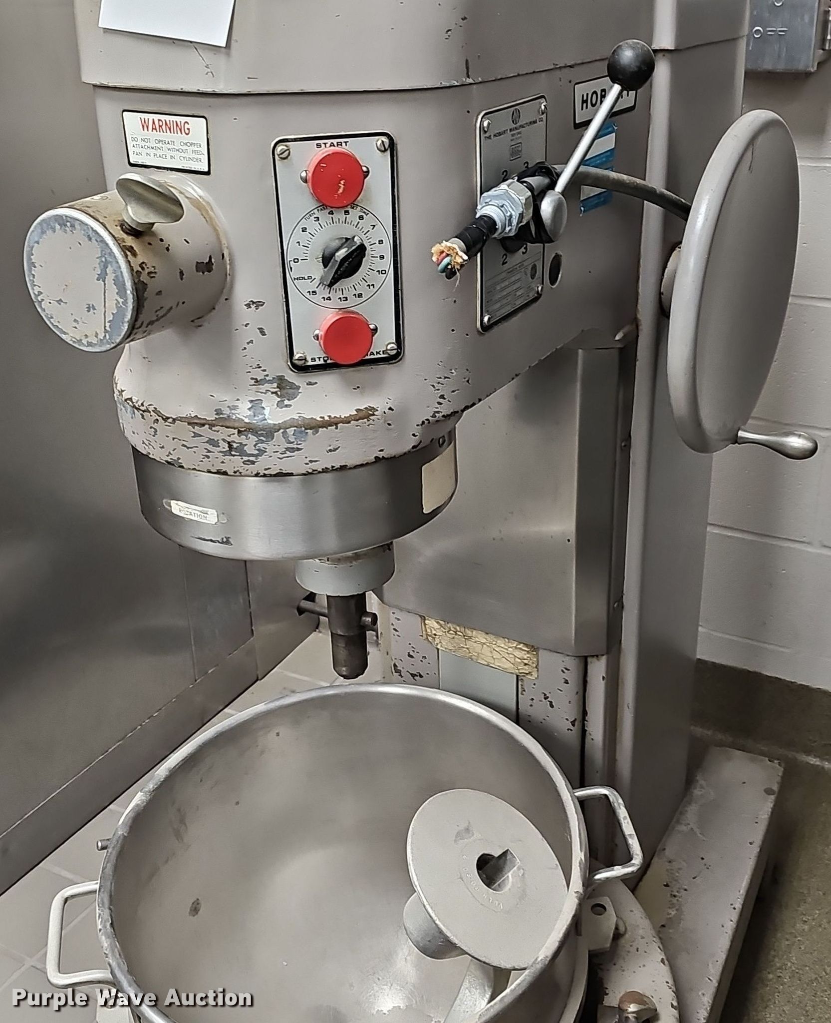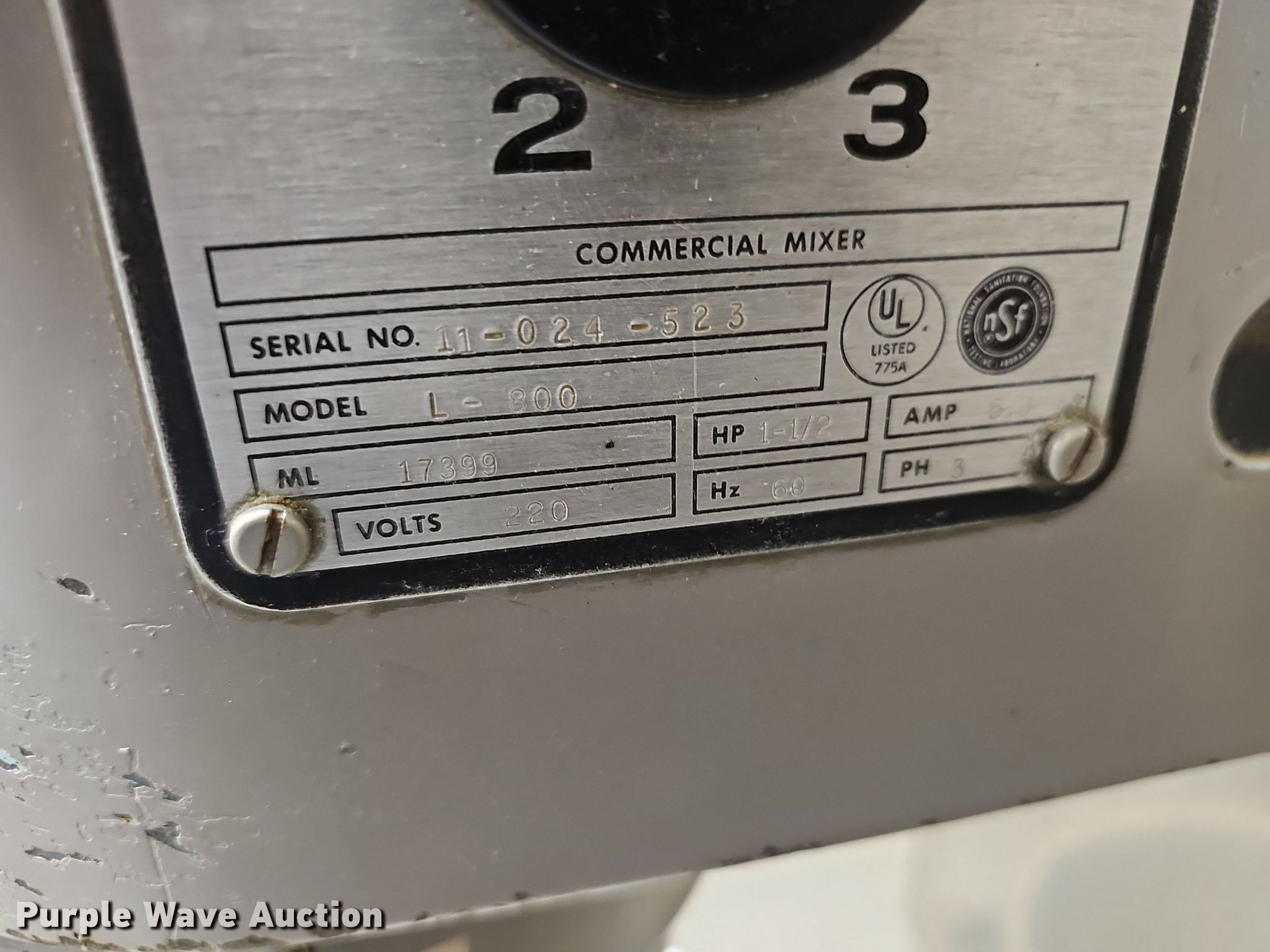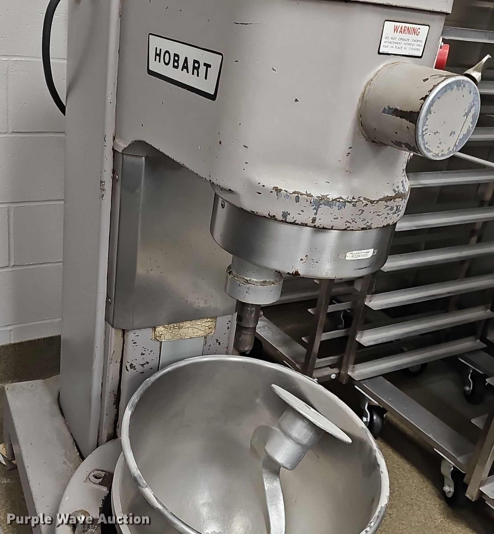 Purple Wave is selling a used Restaurant Equip. in Kansas. This item is a Hobart L800 mixer with the following: Serial: 11-024-523, Volts: 220, HP: 1.5, Phase: Three, Bread hook, Bowl with caster dolly, Missing plug end