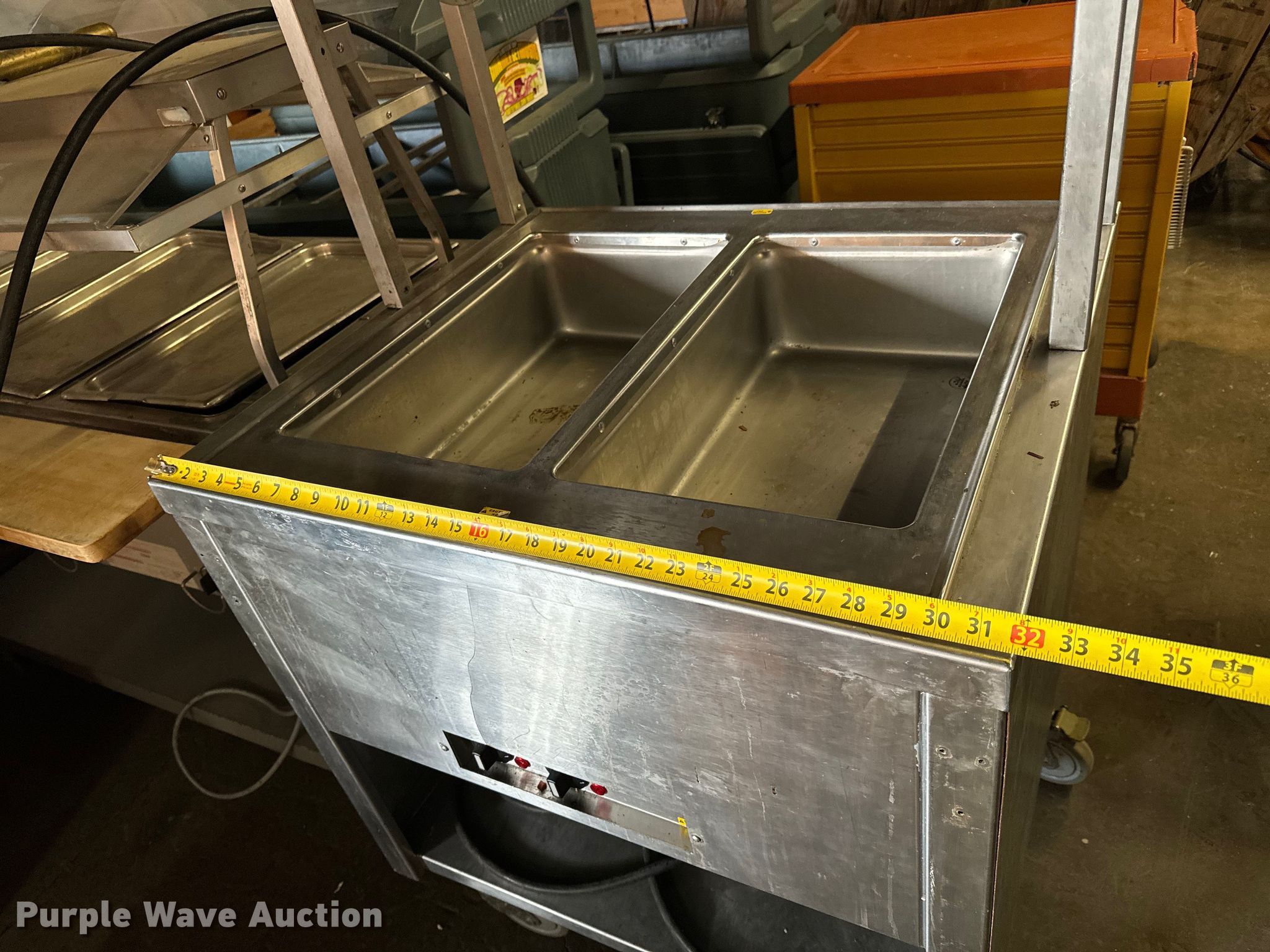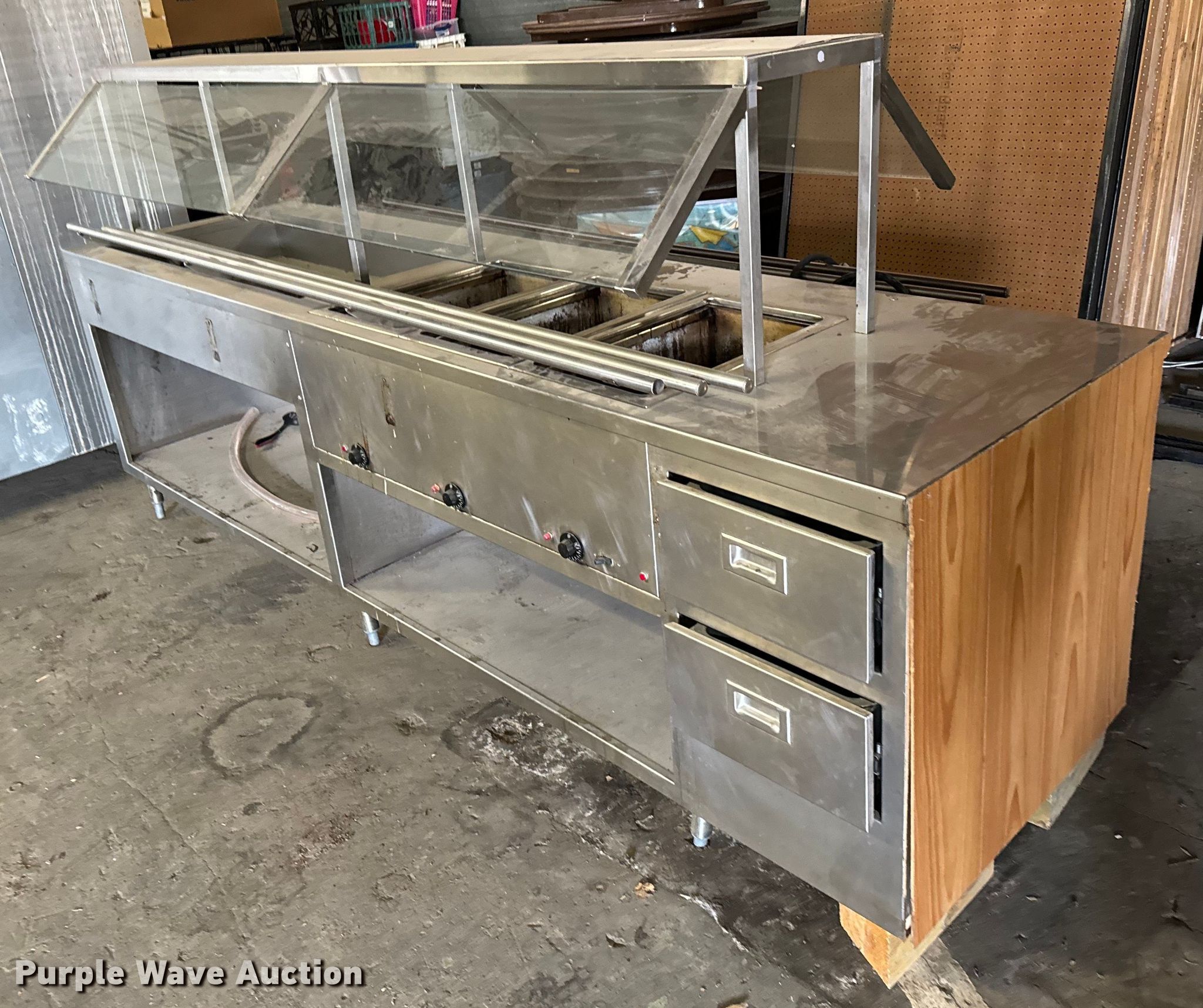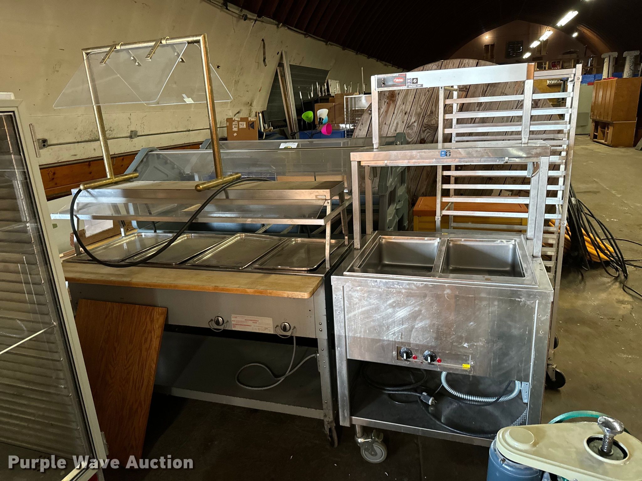 Purple Wave is selling a used Restaurant Equip. in Kansas. This item is a Restaurant equipment with the following: (3) warming stations, (2) Vantco warming racks, (2) salad bars, (2) tray racks, Shaved ice machine, Dining table, Prep table