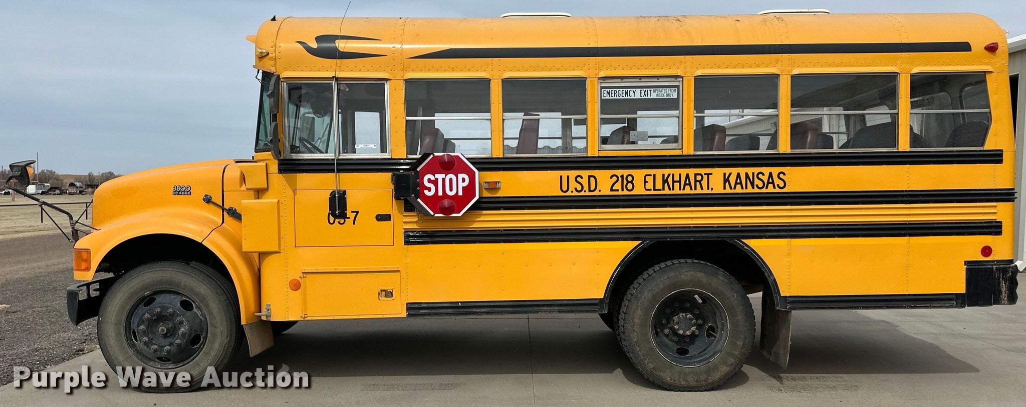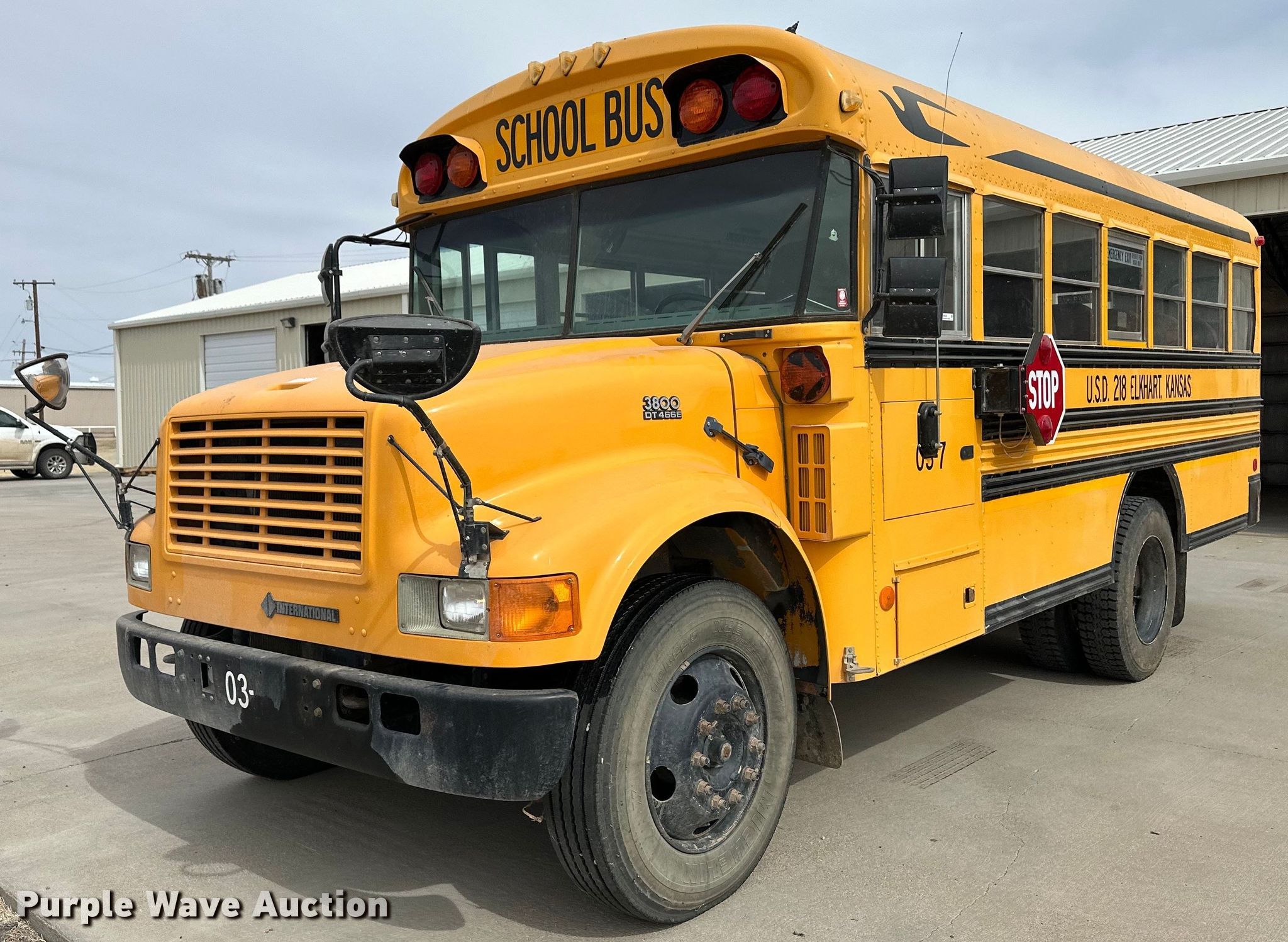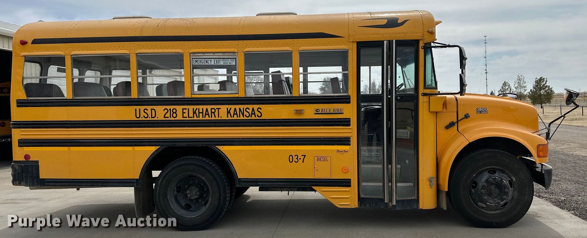2004 Blue Bird school bus. Miles: 88,066 on odometer, Hours: 3,714 on meter, VIN: 1HVBBAAM93H578124. Engine International DT466E, Displacement: 7.6L, Cylinders: 6, Fuel type: Diesel. Transmission Automatic. Chassis Axles: Single, Suspension: Spring, Brakes: Hydraulic. Interior Heat, Passengers: 35, Child safety seats: 4. Tires Size: 10R22.5. Notes Power steering leak. Kansas title. Title distribution may be delayed up to 14 days from verification of funds. USD 218 Elkhart KS. 150 Wildcat Ave. Elkhart, KS 67950