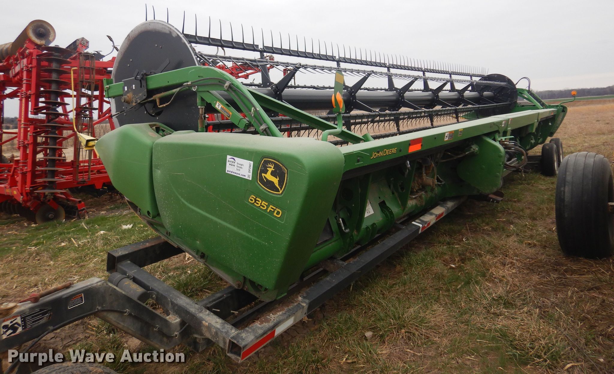 John Deere 635FD flex draper head. Features. Width: 35', Reel: Finger Hydraulic fore/aft, Hydraulic reel height control, Drivelines: Single. Notes Trailer not included. KC Farms. 3473 2100 Rd. Fredonia, KS 66736