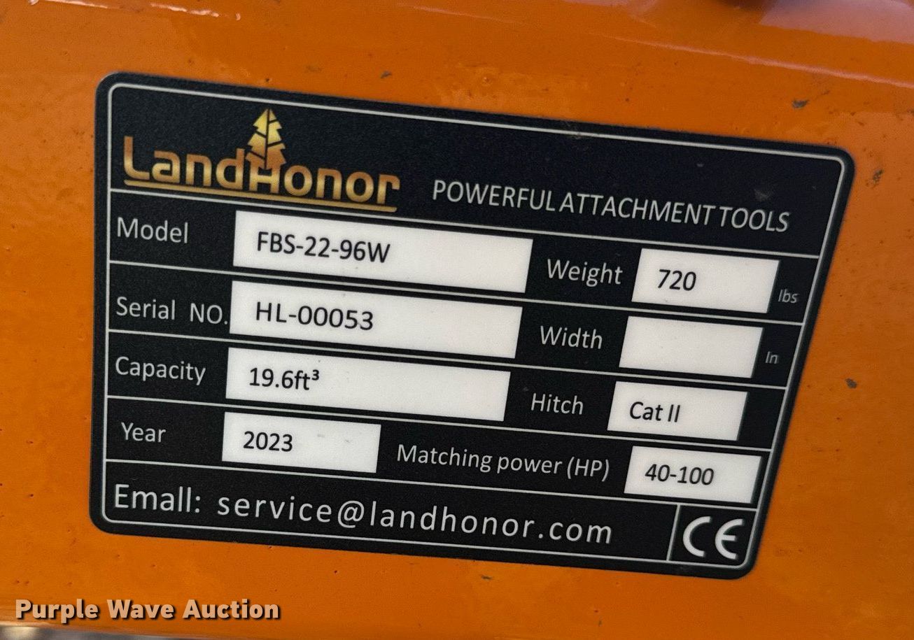 2023 LandHonor FBS-22-96W box blade. Serial: HL-00053. Features Width: 96", Capacity: 19.6 cu. ft., Cutting edge: Bolt on. Notes Unused. T&R Equipment. 8267 Old Highway 54. New Bloomfield, MO 65080