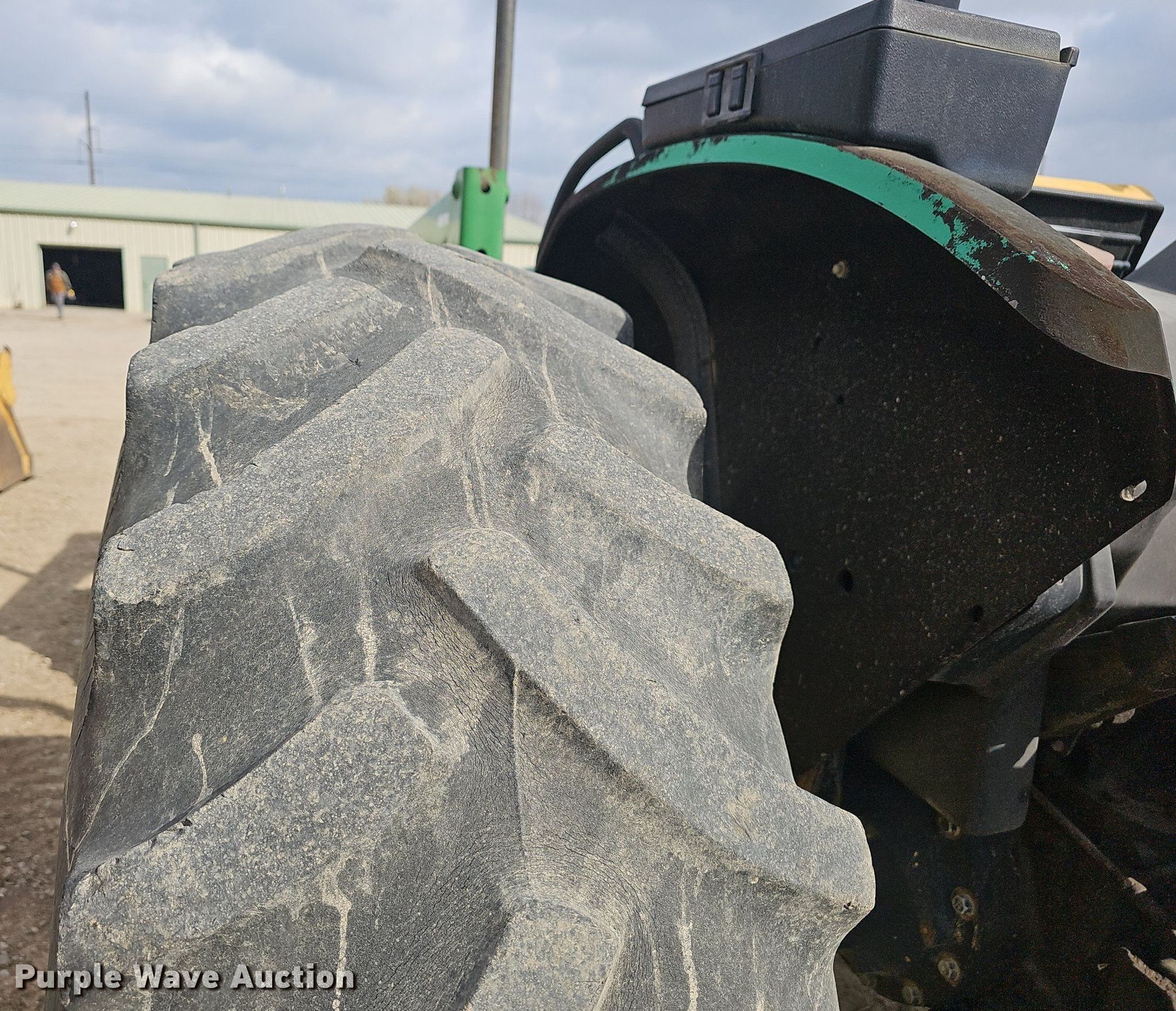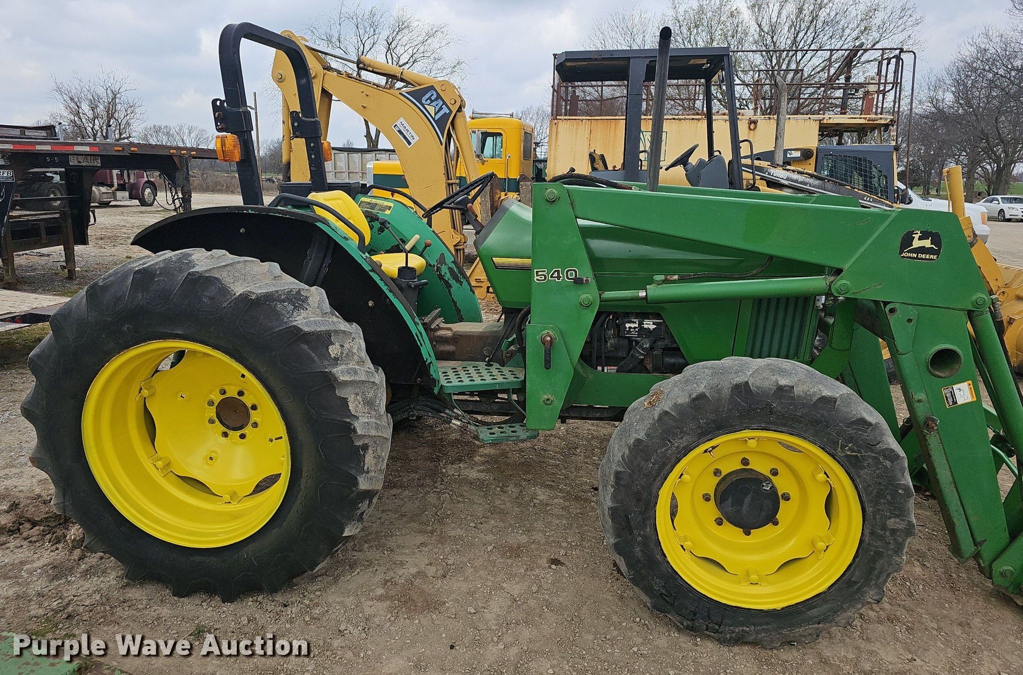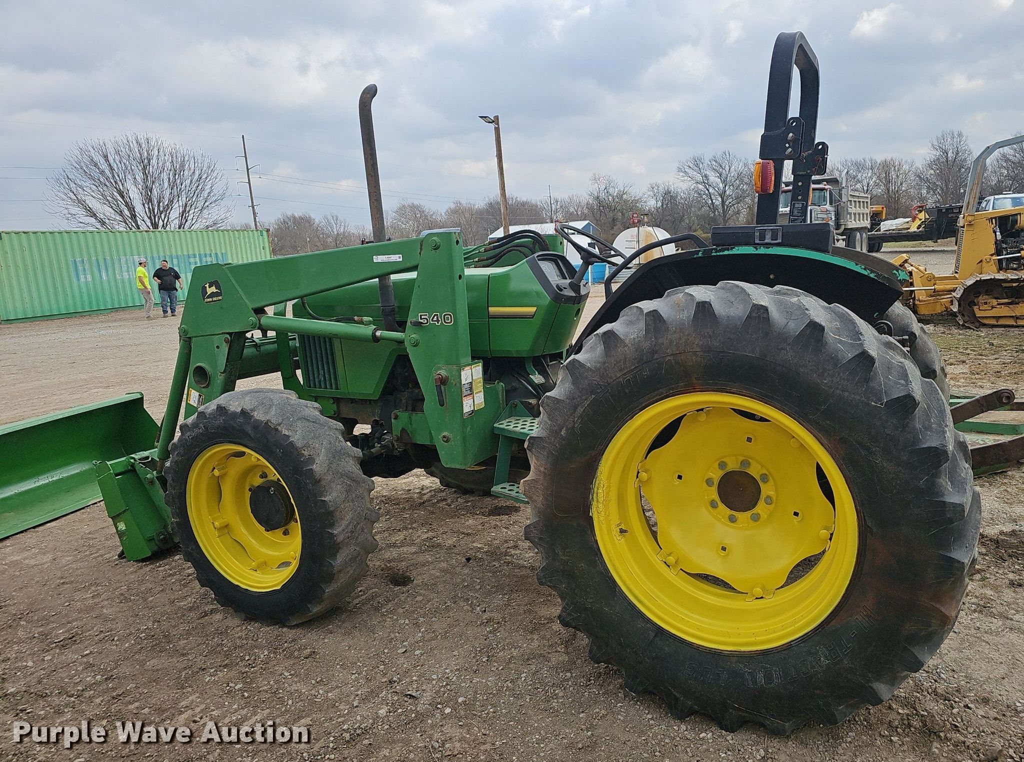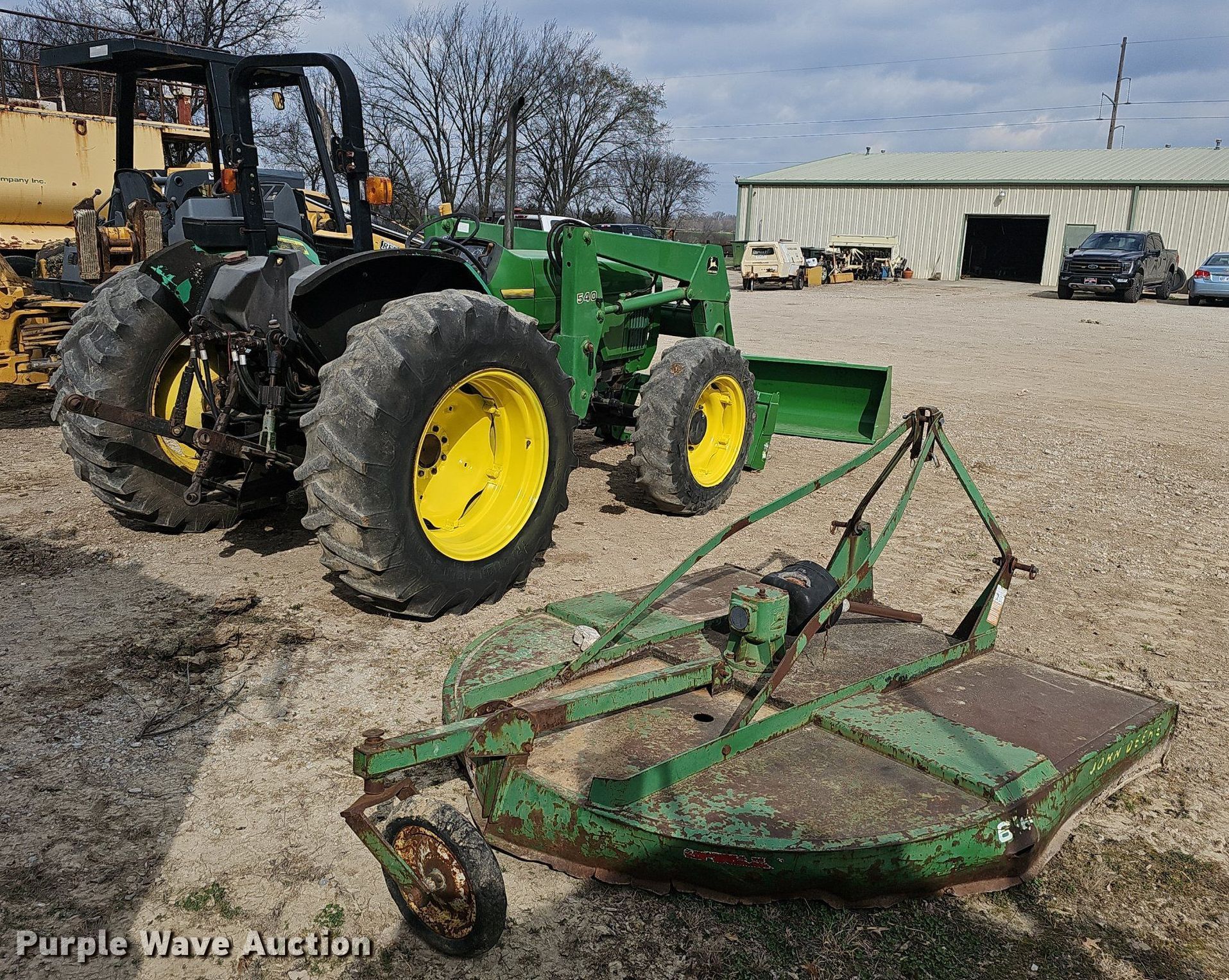 1993 John Deere 5400 MFWD tractor. Hours: 4,980 on meter, Serial: LV5400D241395. Engine Cylinders: 4, Fuel type: Diesel. Transmission Synchro, 9F - 3R, Differential lock. Features PTO: 540, Three point Top link, Loader John Deere 504, Bale spear, Controls: Joystick, Bucket Width: 74", Rotary mower John Deere, Cutting width: 72", PTO half shaft missing. Tires Front: 11.2-24, Rear: 16.9-30. Notes Glass cracked. RFB Construction. 565 E 520th Ave. Pittsburg, KS 66762
