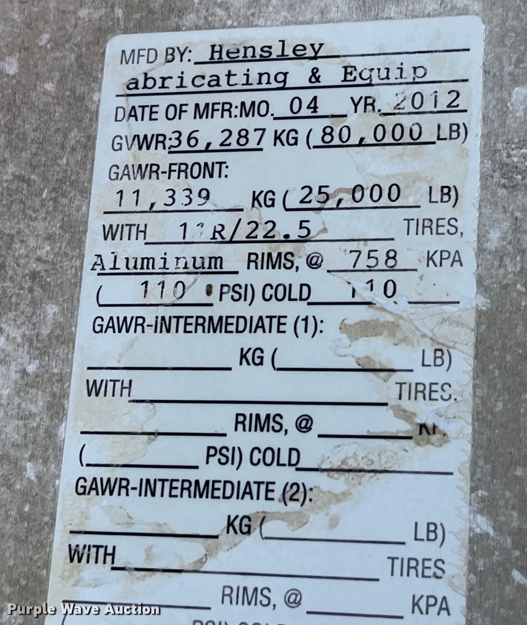 2012 Hensley ATLW-36-32-8 feed delivery trailer. VIN: 1H9BA4028CT289705, Unit #: 3833. Dimensions Overall: 41' 3" L x 105.25" W. Features Body type: Aluminum, Discharge auger Length: 28'. Chassis Landing gear: Dual, Suspension: Air, Brakes: Air, Axles: Tandem, GVWR: 80,000 lbs. Tires Aluminum wheels, Size: 11R22.5. Notes Front air tank leak, rusted. Missouri title. Title distribution may be delayed up to 14 days from verification of funds. Smithfield. 17656 Finch Ave. Princeton, MO 64673