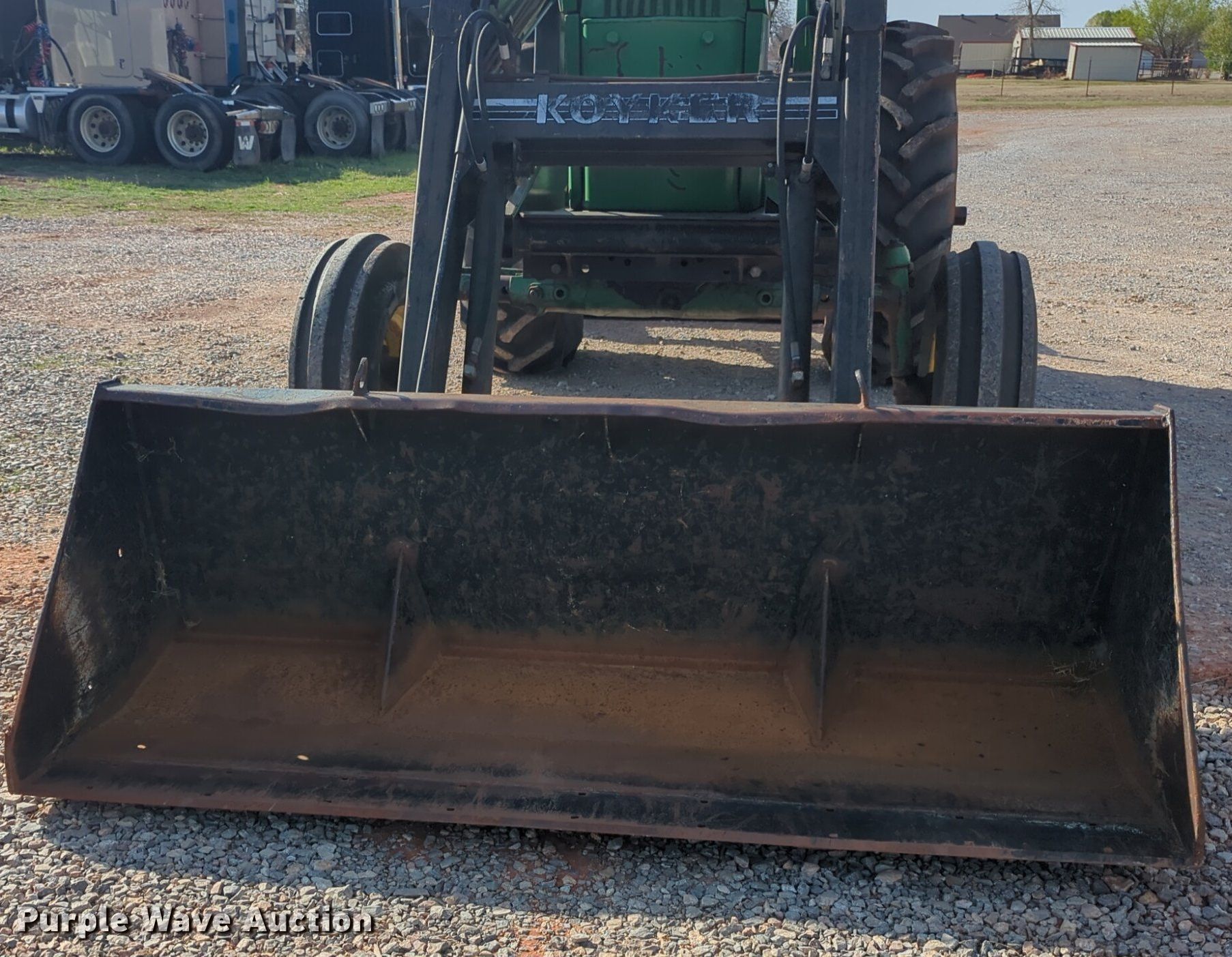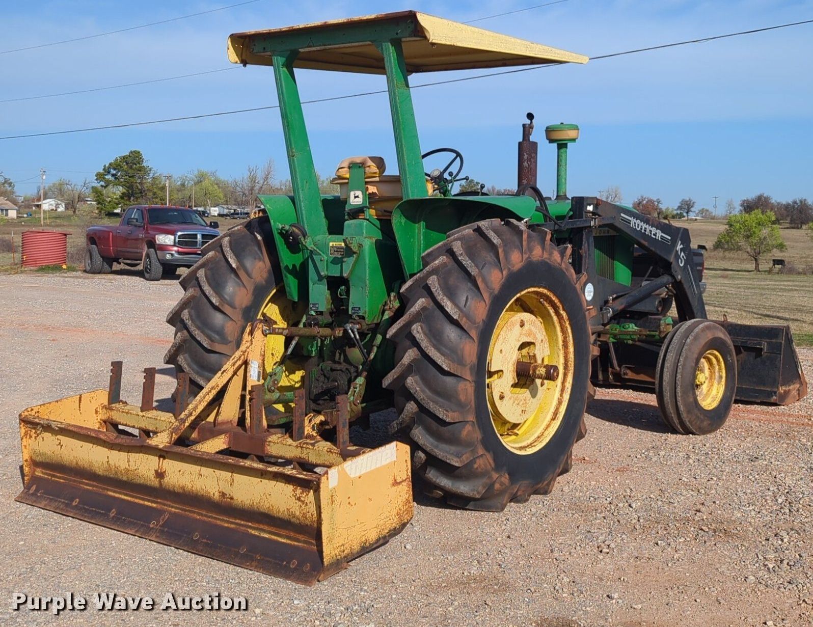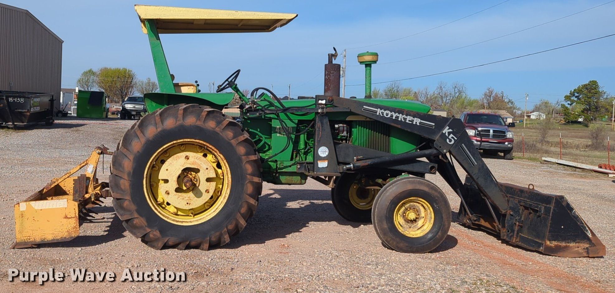 1969 John Deere 4020 tractor. Hours: 1,134 on meter, Serial: T213R222131R. Engine John Deere, Cylinders: 6, Fuel type: Diesel. Transmission Synchro, 8F - 2R. Features PTO: 540, Three point Top link, Hydraulic remote sets Rear: 2, Loader Koyker K5, Controls: Joystick, Bucket Width: 84", Box blade Tufline, Width: 84". Tires Front: 10.00-15, Rear: 18.4-34, Wheel weights: 6. DW Diesel Performance & Repair. 700 South Sara Road. Tuttle, OK 73089