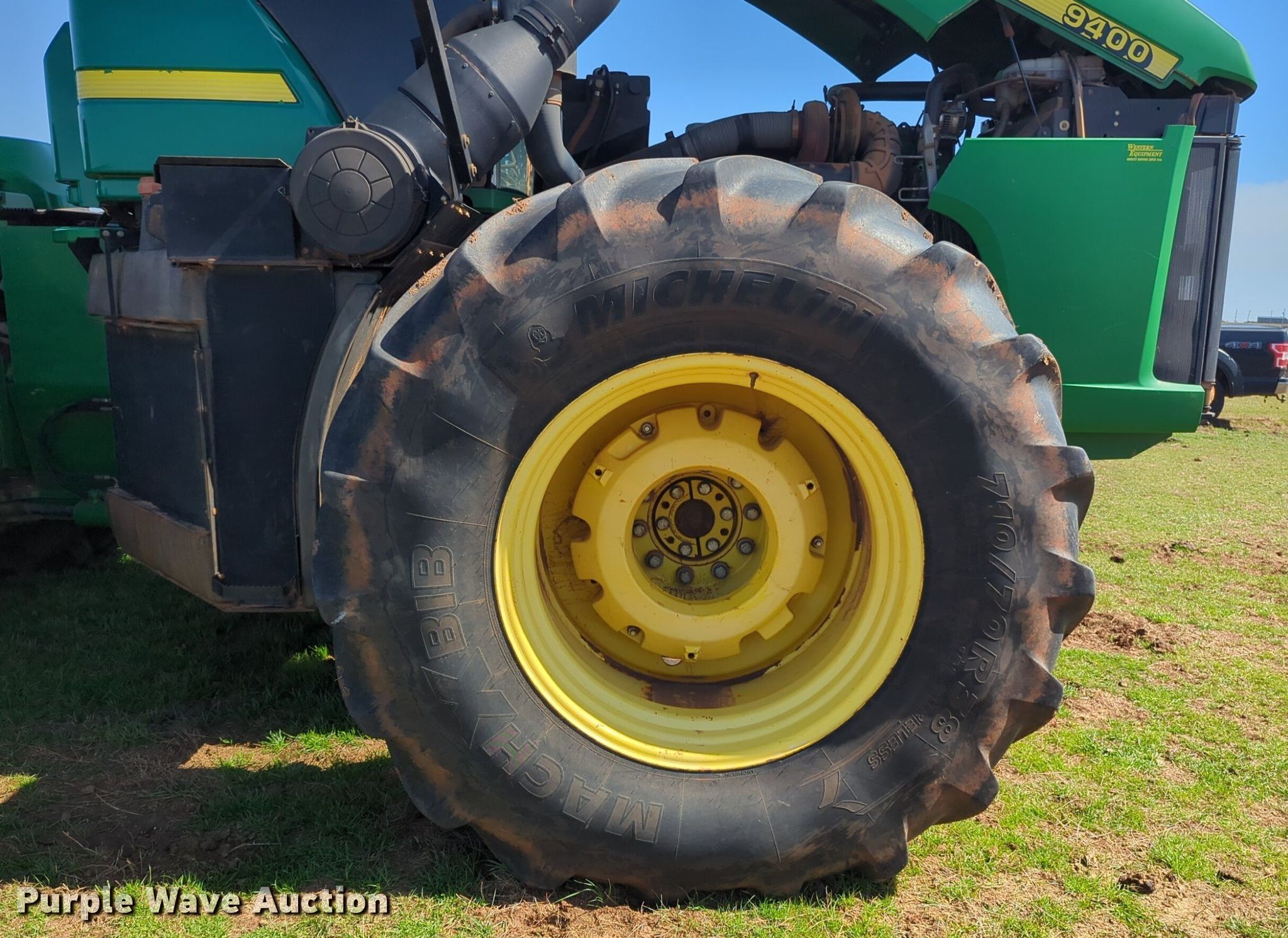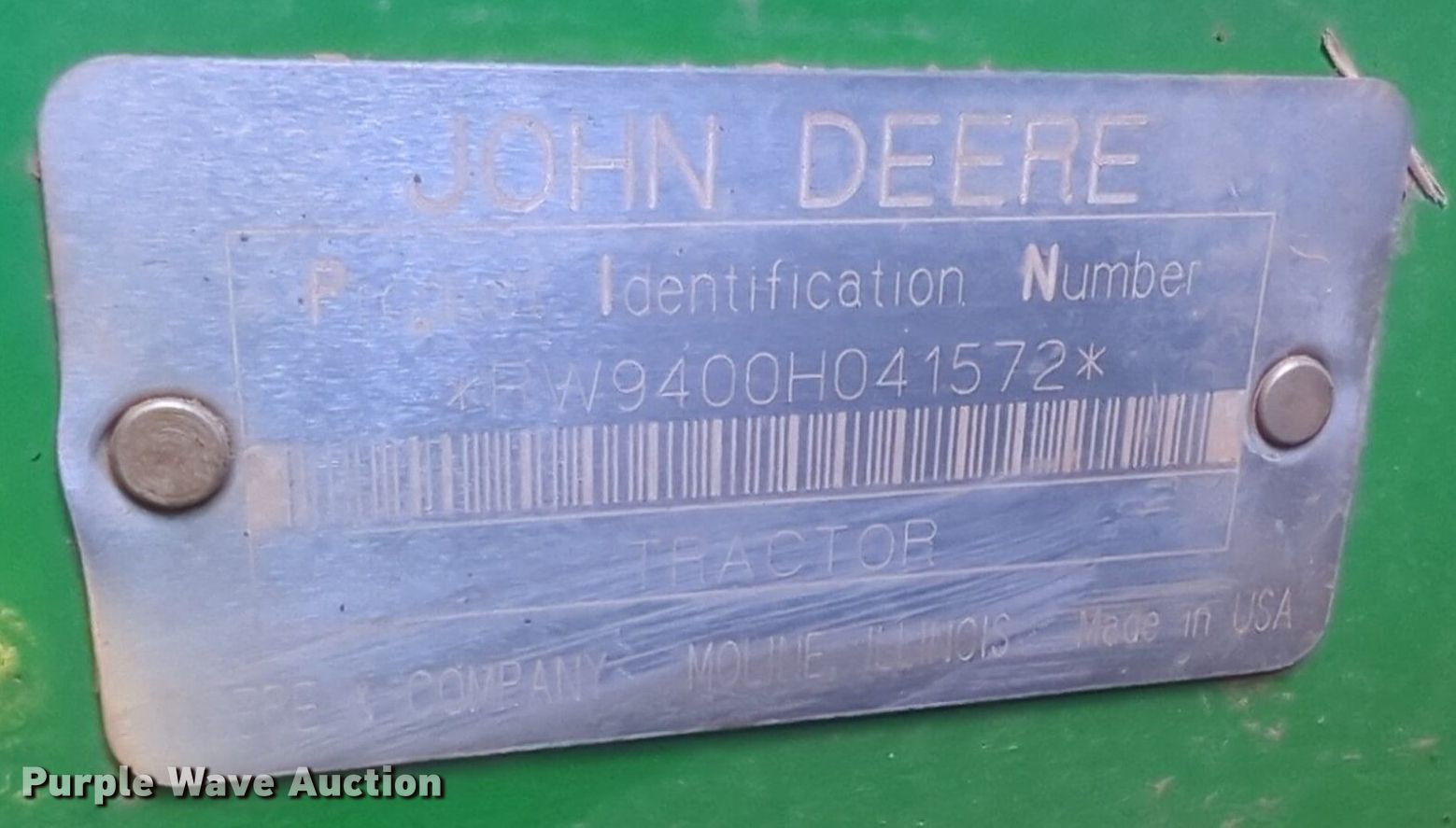2001 John Deere 9400 4WD tractor. Hours: 2,880 on meter, Serial: RW9400H041572, Claim #: 3-821281. Engine John Deere PowerTech, Displacement: 12.5L, Cylinders: 6, Fuel type: Diesel. Transmission Powershift, 12F - 2R. Operators station AC, Heat. Features Seven pin outlet, Hydraulic remote sets Rear: 4, Suitcase weights: 20. Tires Front: 710/70R38, Wheel weights: 4, Duals, Front duals. Notes Hydraulic system issues, Non-operational unit. Insurance salvage unit. Oklahoma Farm Bureau Insurance. 5905 Moffat Road Northwest. Piedmont, OK 73078