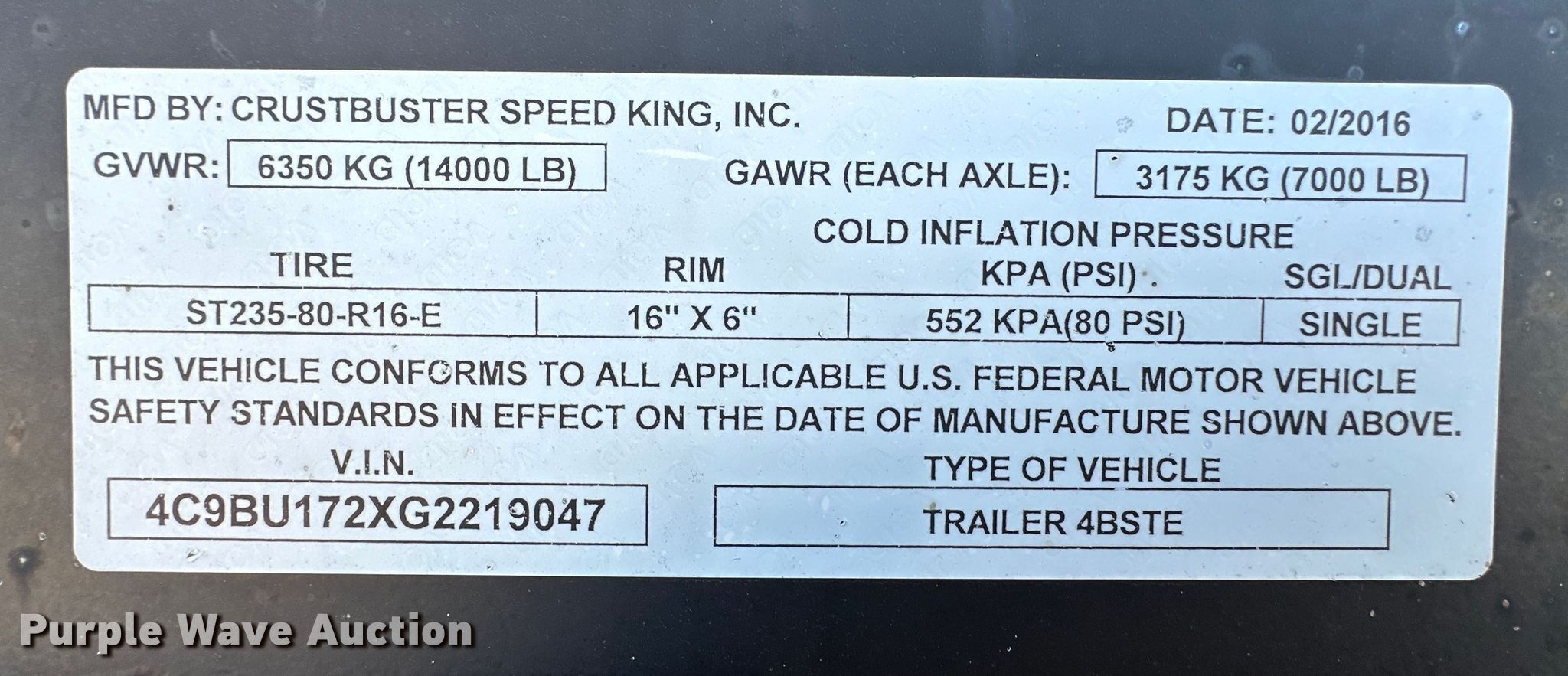 2016 Crustbuster 4BSTE seed tender. VIN: 4C9BU172XG2219047. Engine Honda GX160, Cylinders: 1, Fuel type: Gas. Features Conveyor width: 8". Tires Size: 235/80R16. Blew Farms. 11711 115 Road. Dodge City, KS 67801