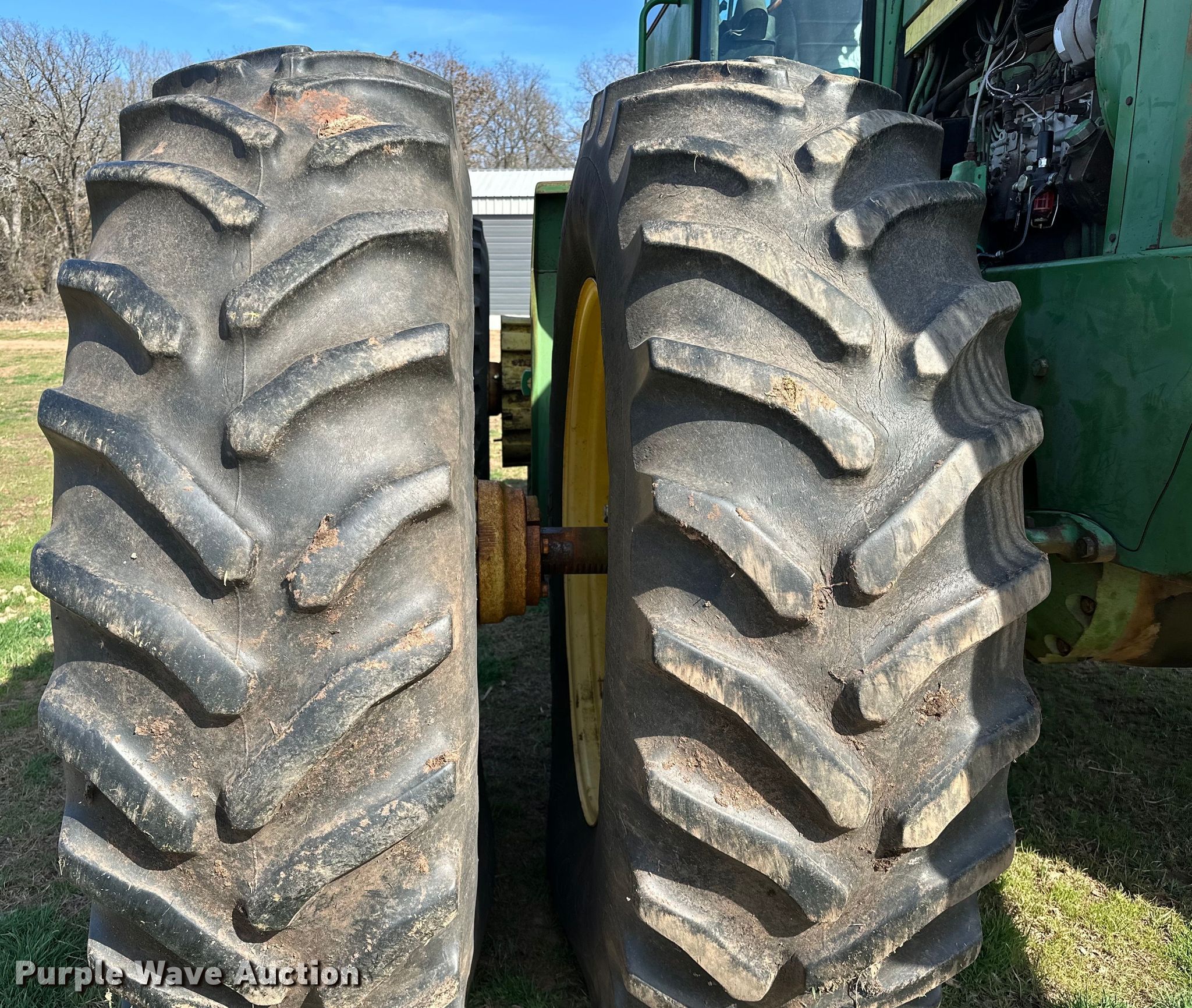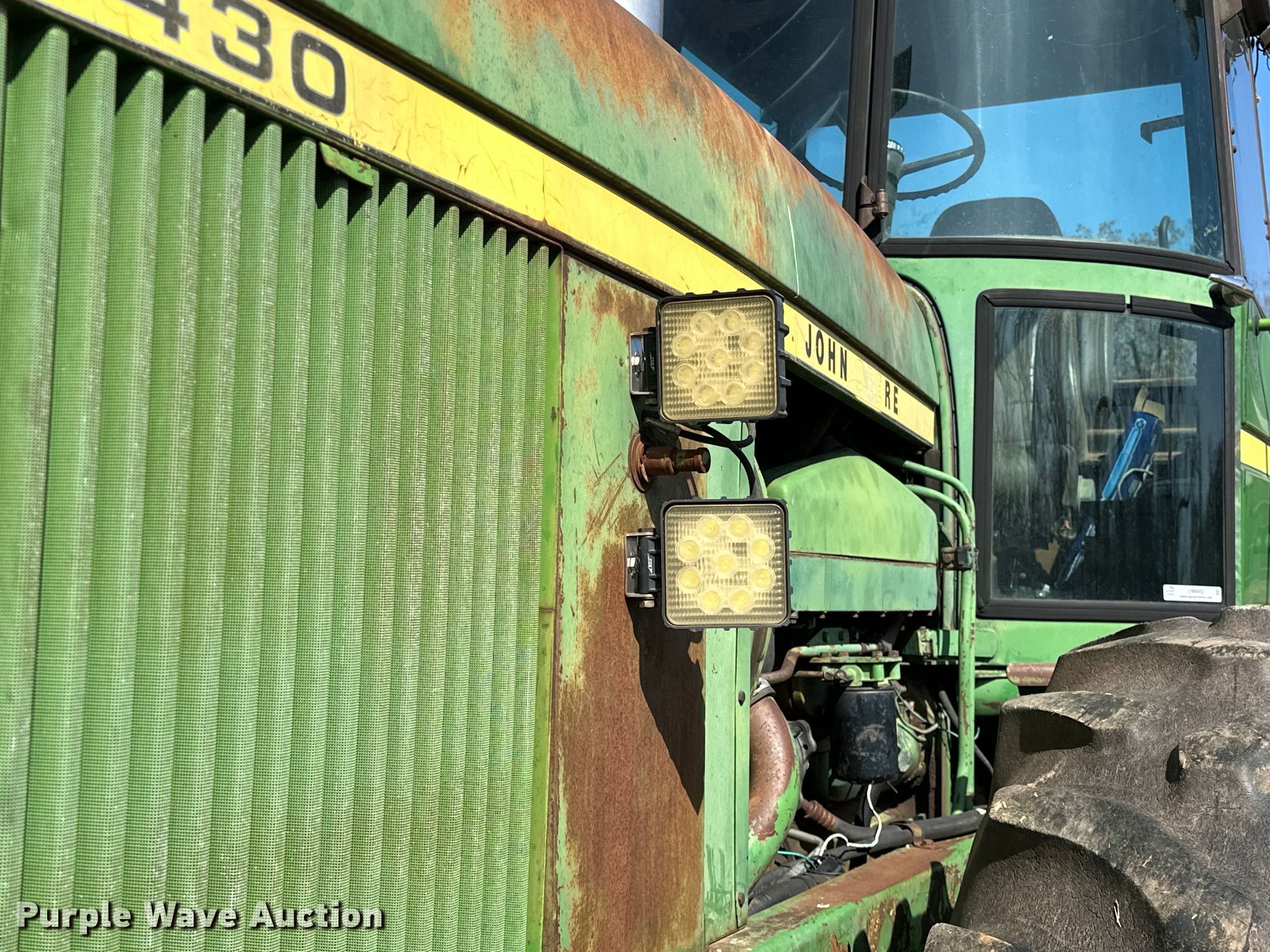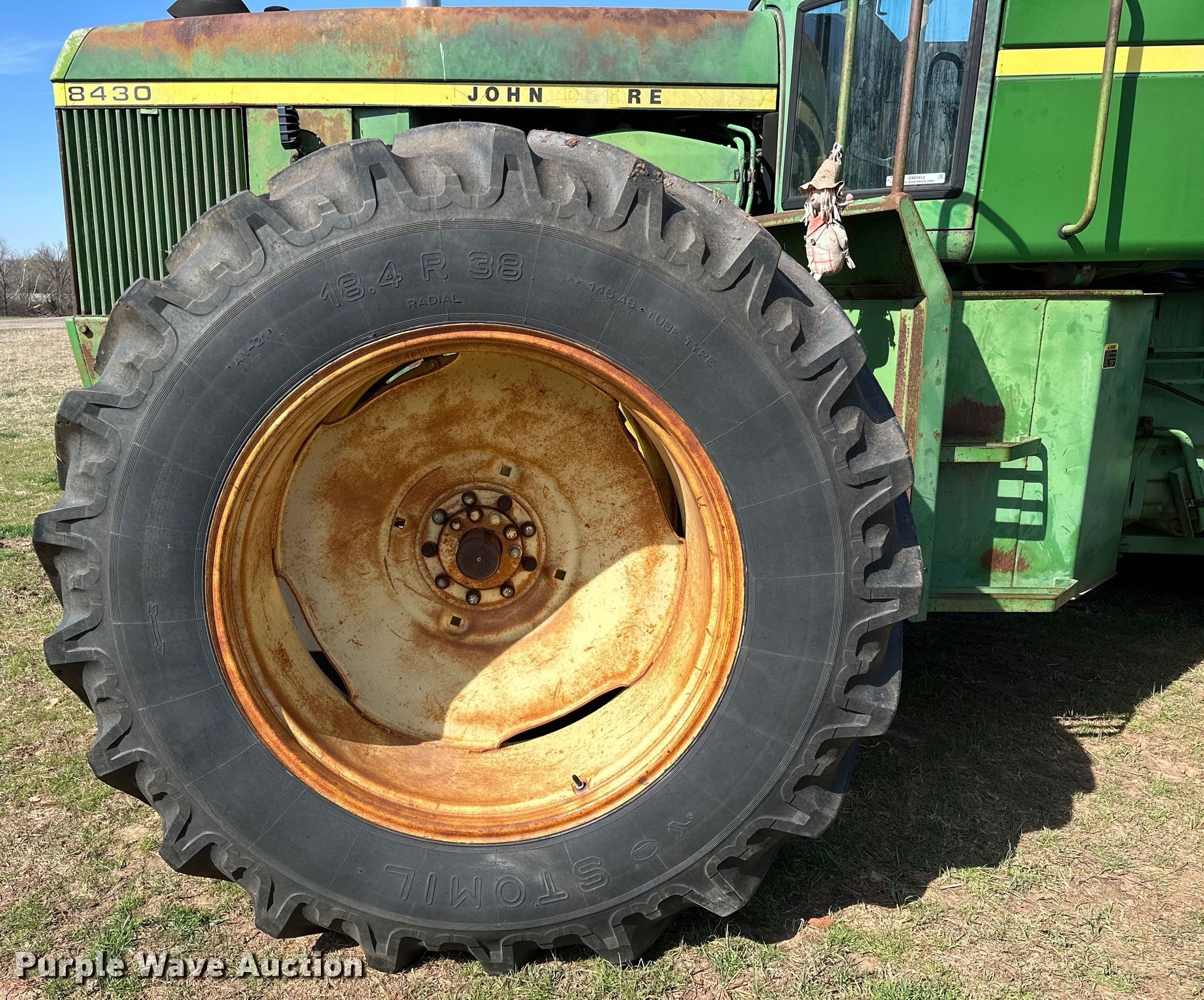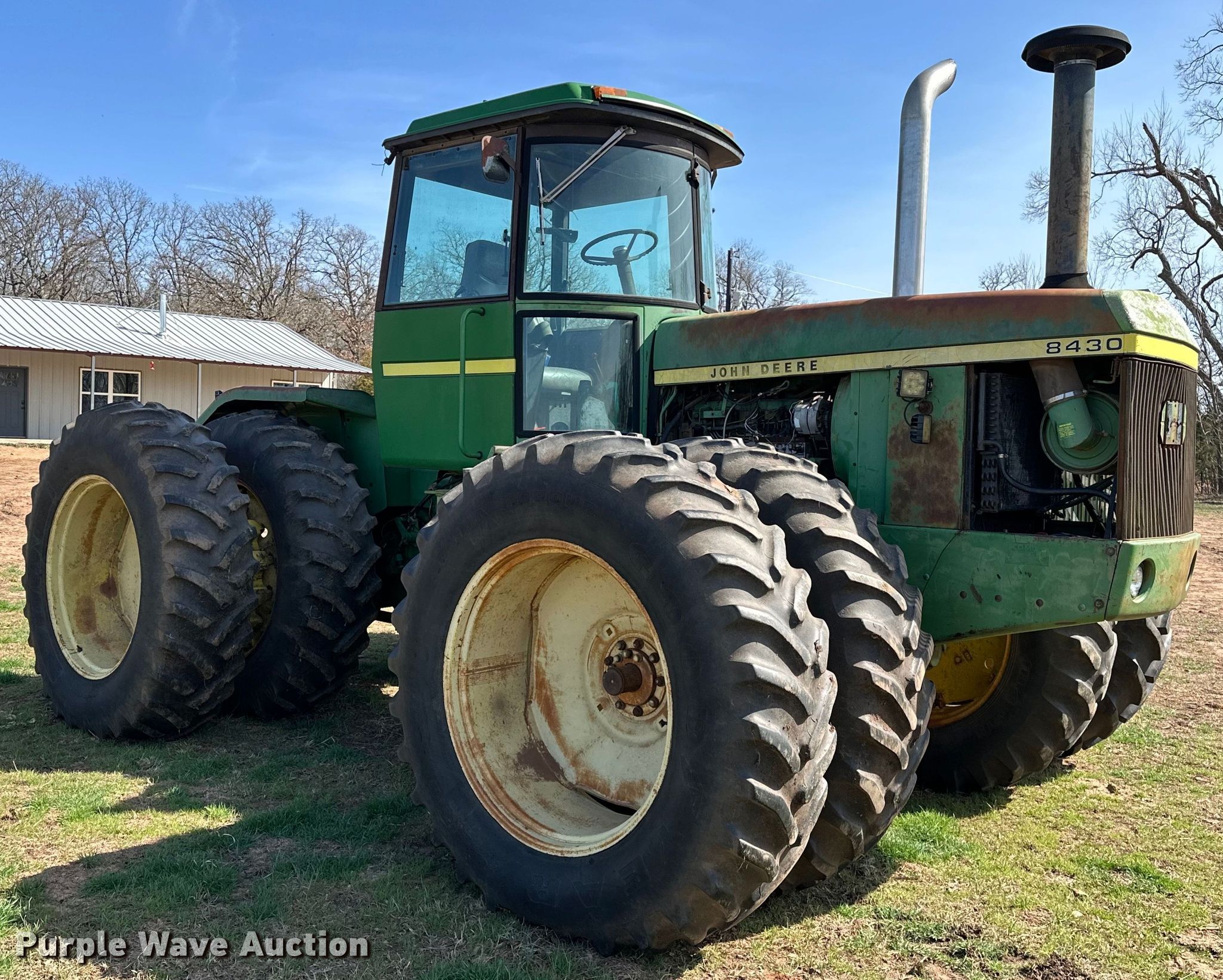 1978 John Deere 8430 4WD tractor. Serial: 006532R. Engine John Deere, Cylinders: 6, Fuel type: Diesel. Transmission Quad-range, 16F - 6R, Differential lock. Operators station AC, Heat. Features PTO: 1000, Three point, Hydraulic remote sets Rear: 3. Tires Front: 18.4R38, Rear: 18.4-38, Wheel weights: 2, Duals. Notes Unknown operating condition of AC. 29351 Independence. Glencoe, OK 74032