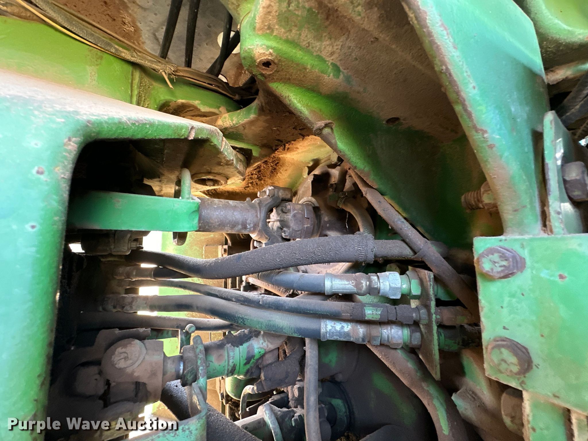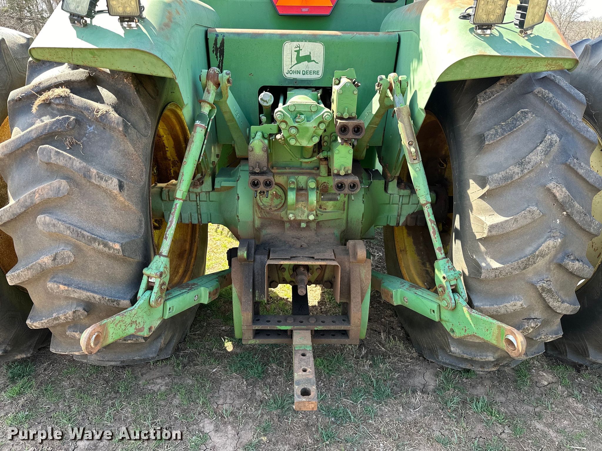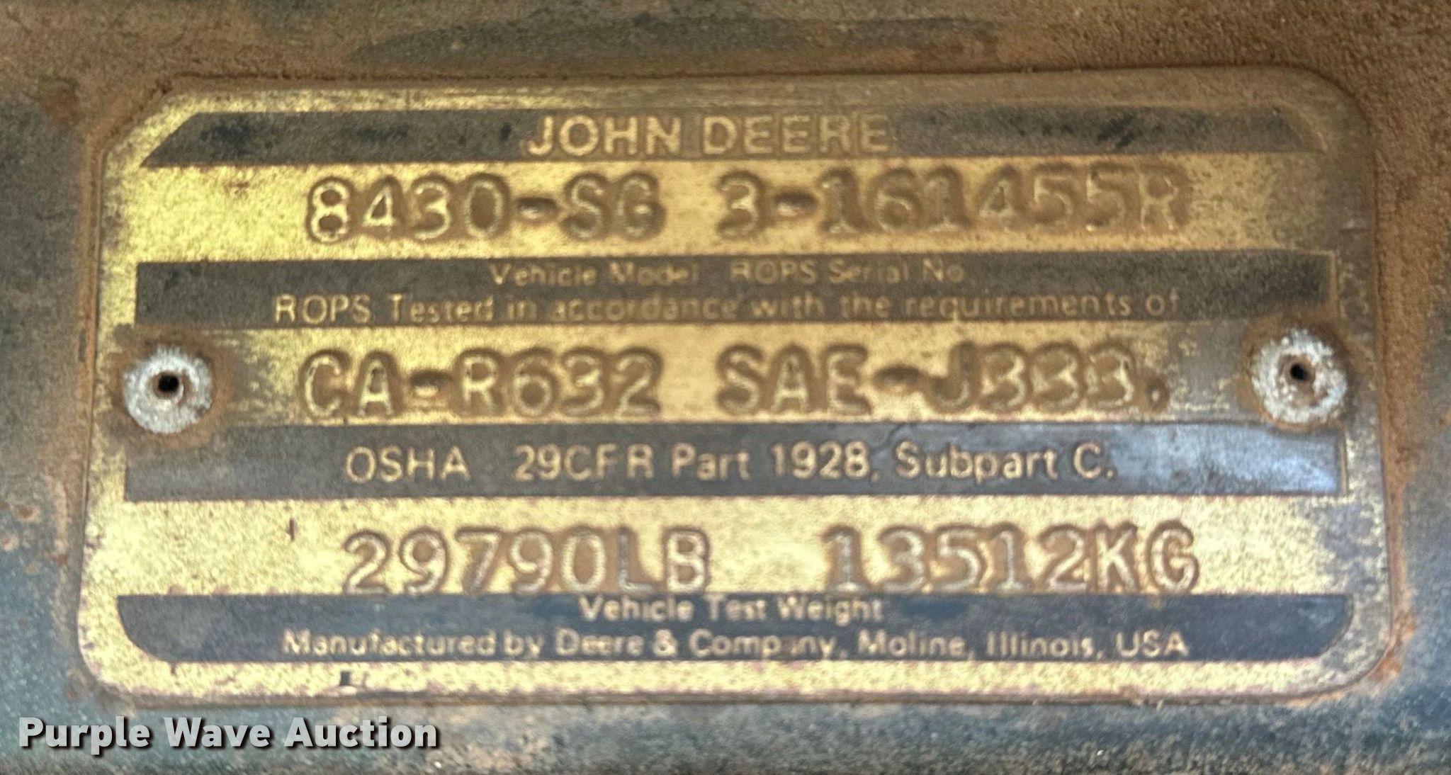 1978 John Deere 8430 4WD tractor. Serial: 006532R. Engine John Deere, Cylinders: 6, Fuel type: Diesel. Transmission Quad-range, 16F - 6R, Differential lock. Operators station AC, Heat. Features PTO: 1000, Three point, Hydraulic remote sets Rear: 3. Tires Front: 18.4R38, Rear: 18.4-38, Wheel weights: 2, Duals. Notes Unknown operating condition of AC. 29351 Independence. Glencoe, OK 74032