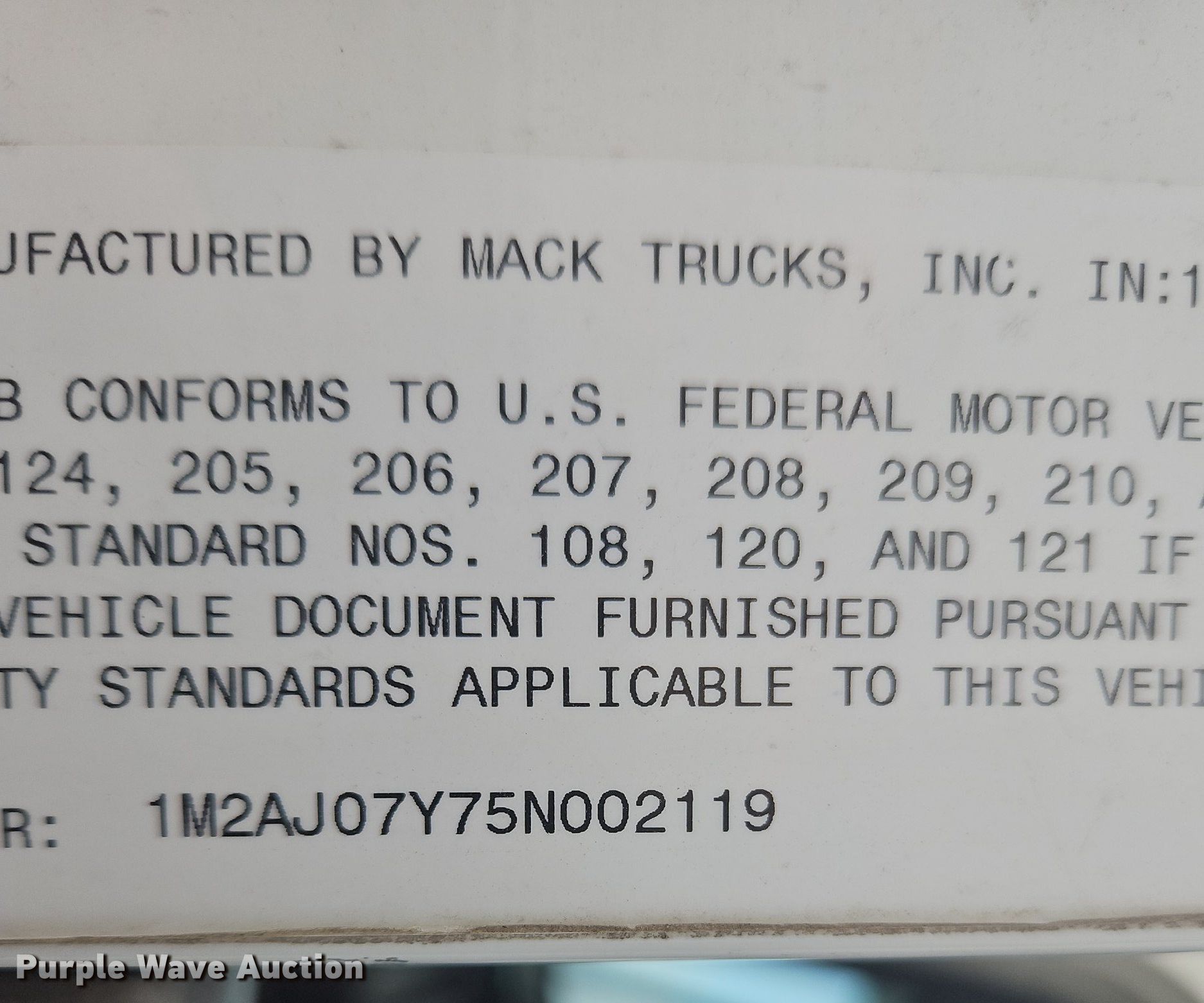 Purple Wave is selling a used Truck Tractor in Indiana. This item is a 2005 Mack CHN613 semi truck with the following: Miles: 769,397 on odometer, Hours: 24,054 on meter, VIN: 1M2AJ07Y75N002119