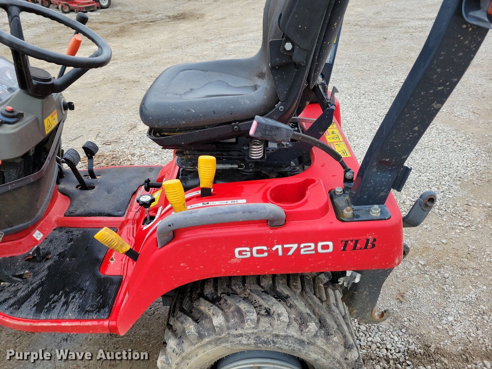2018 Massey Ferguson GC1720 tractor. Hours: 84 on meter, Serial: AG3MGC200JJH00609. Engine Iseki, Cylinders: 3, Fuel type: Diesel. Features Three point Top link. Tires Front: 305 60-12, Rear: 215 50-10. Notes Tire off bead, Engine needs replaced, hole in block, Non-operational unit. Greenscapes Lawn and Garden, LLC. 866 NW MO-13. Warrensburg, MO 64093