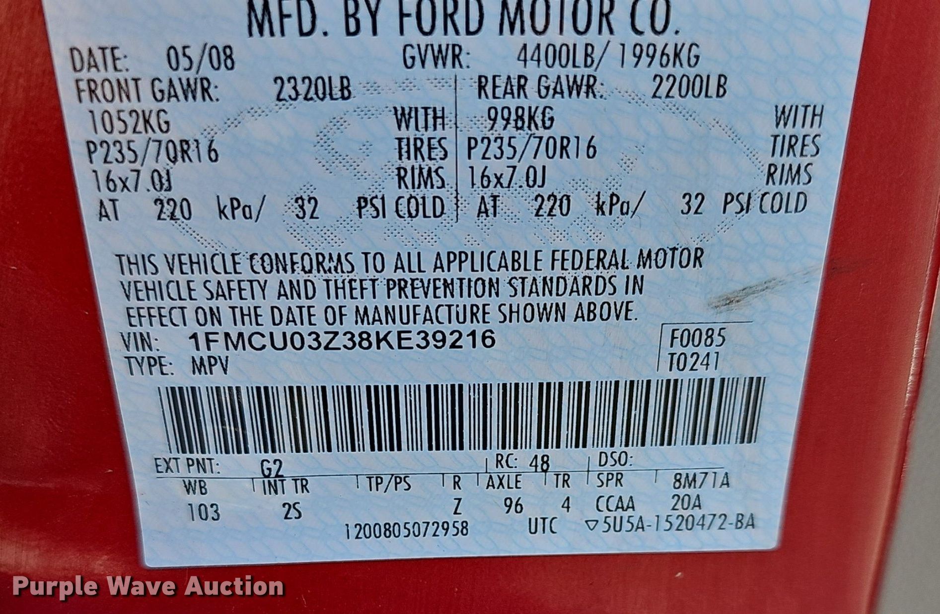 Purple Wave is selling a used Passenger Vehicle in Kansas. This item is a 2008 Ford Escape XLT SUV with the following: Miles: 130,239 on odometer, VIN: 1FMCU03Z38KE39216, Unit #: 8171