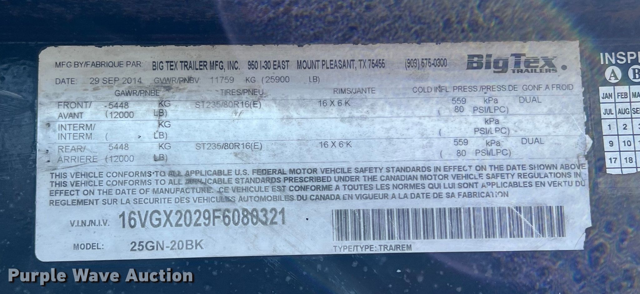 Purple Wave is selling a used Flat or Drop Deck Trailer in Texas. This item is a 2015 Big Tex 25GN HD flatbed trailer with the following: VIN: 16VGX2029F6080321