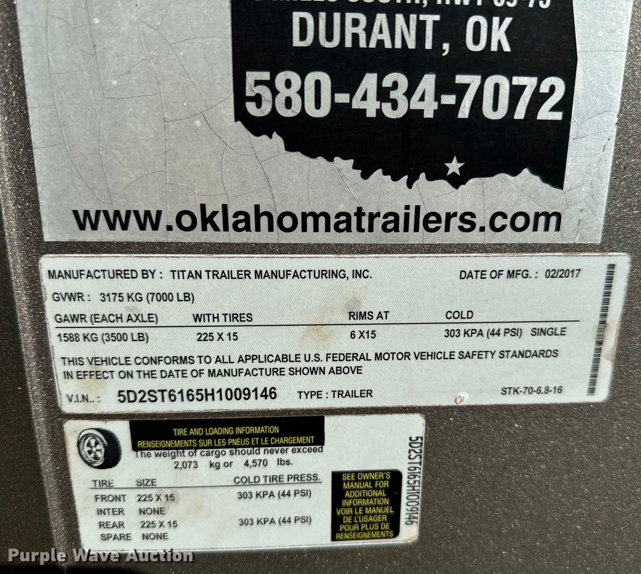 Purple Wave is selling a used Livestock Trailer in Oklahoma. This item is a 2017 Titan livestock trailer with the following: VIN: 5D2ST6165H1009146
