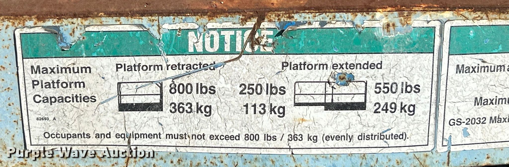 Genie GS-2032 scissor lift. Hours: 312 on meter. Features Maximum lift capacity: 800 lbs, Maximum lift height: 20', Platform: 89" L x 31" W, AC power outlet, Controls: Ground, Platform extensions: Manual. Tires Tire size: 15x5x11.25in, Solid. Notes Bad batteries, Unknown operating condition. Concrete Strategies, LLC. St. Louis, MO 63147