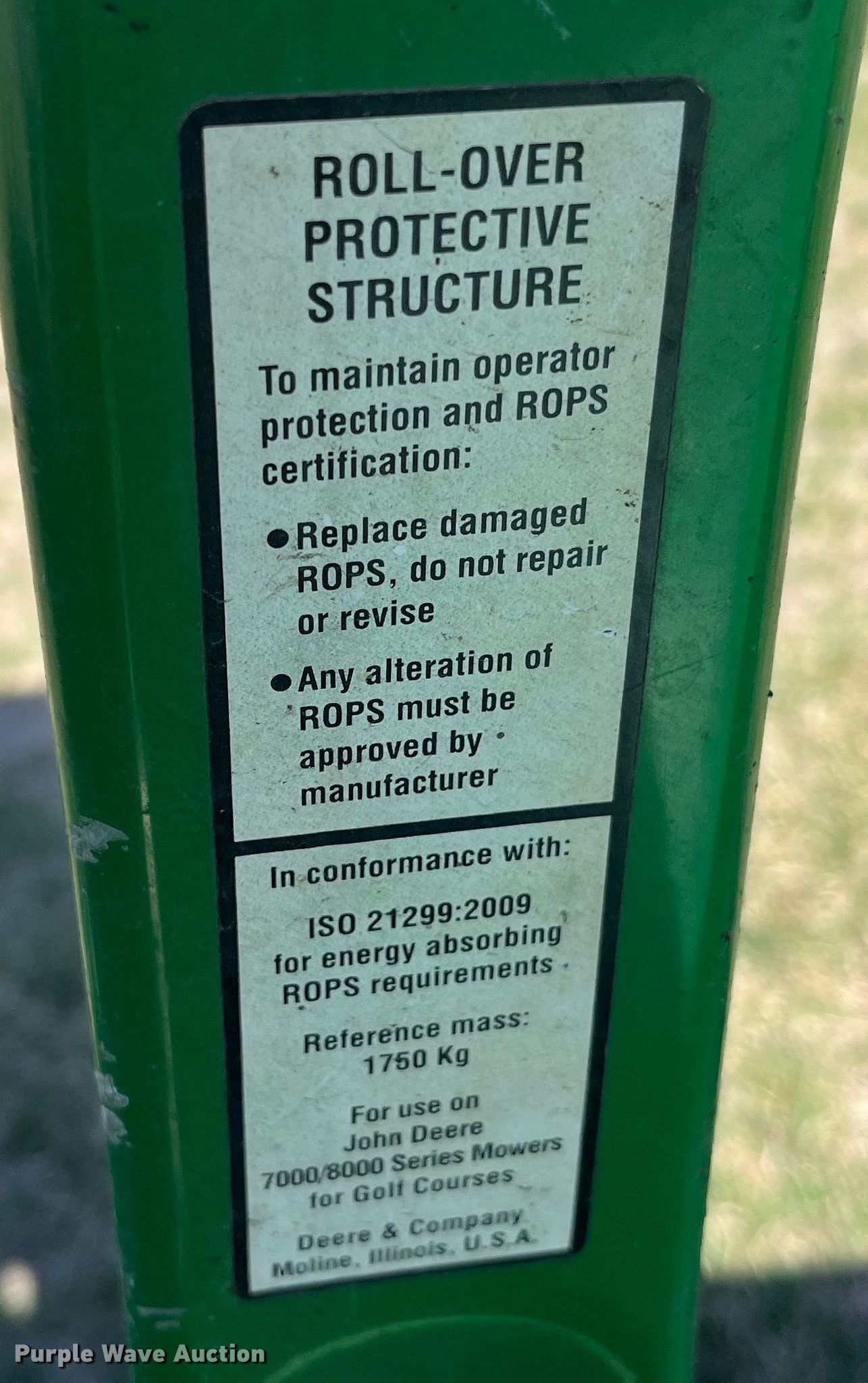 2010 John Deere 8800 TC RM lawn mower. Hours: 3,927 on meter, Cutting width: 85", Serial: TC8800X030114. Engine Yanmar 3JHMAB, Displacement: 1.496L, Cylinders: 3, Fuel type: Diesel. Transmission Hydrostatic. Operators station OROPS. Features Hydraulic deck lift. Tires Front: 26x12.00B12, Rear: 20x10.00-8. Stanberry Golf Club. Pineview Drive. Stanberry, MO 64489