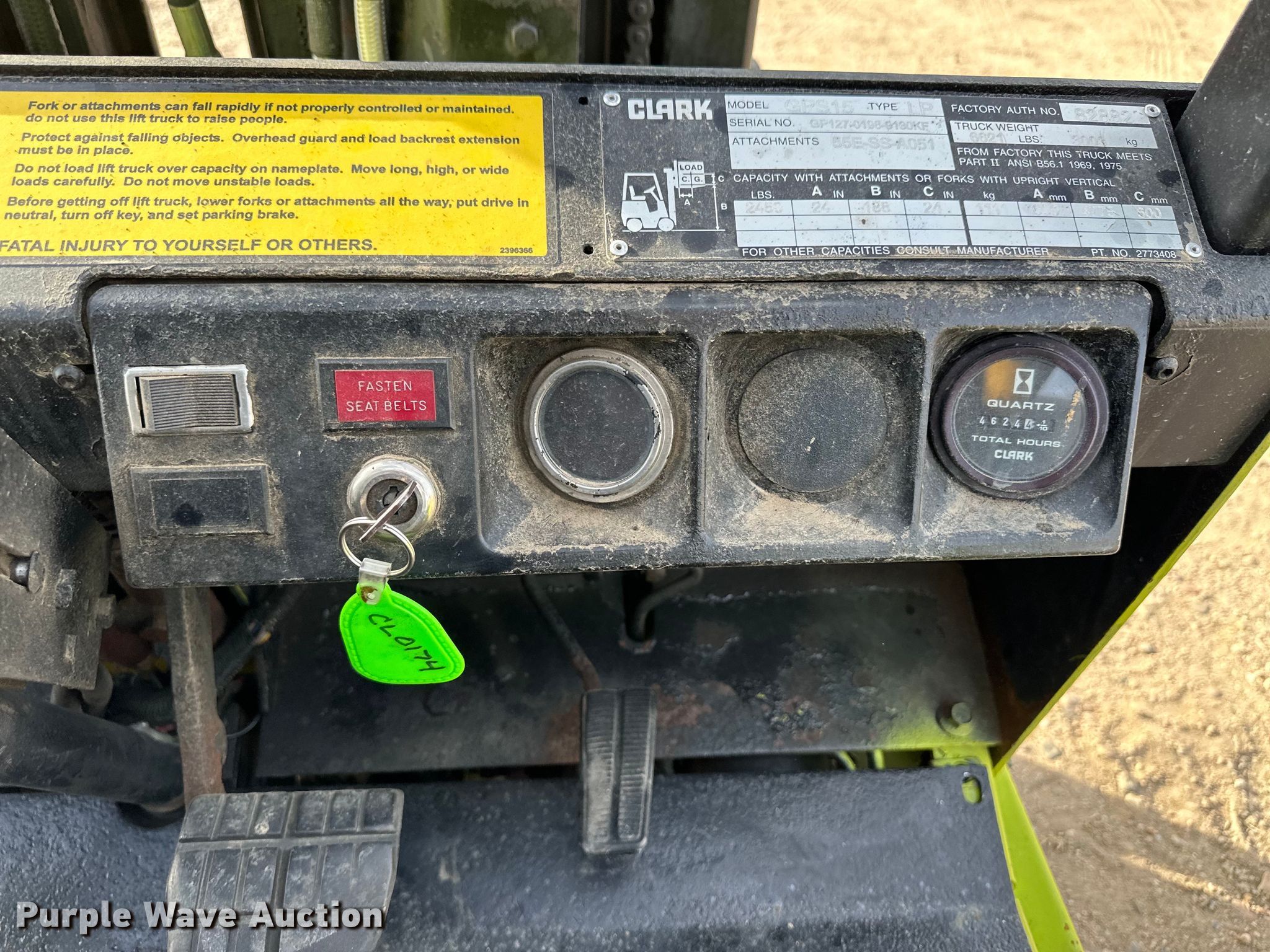 Purple Wave is selling a used Warehouse Forklift in Kansas. This item is a Clark GPS15 forklift with the following: Hours: 4,624 on meter, Serial: GP127-0198-9130KF
