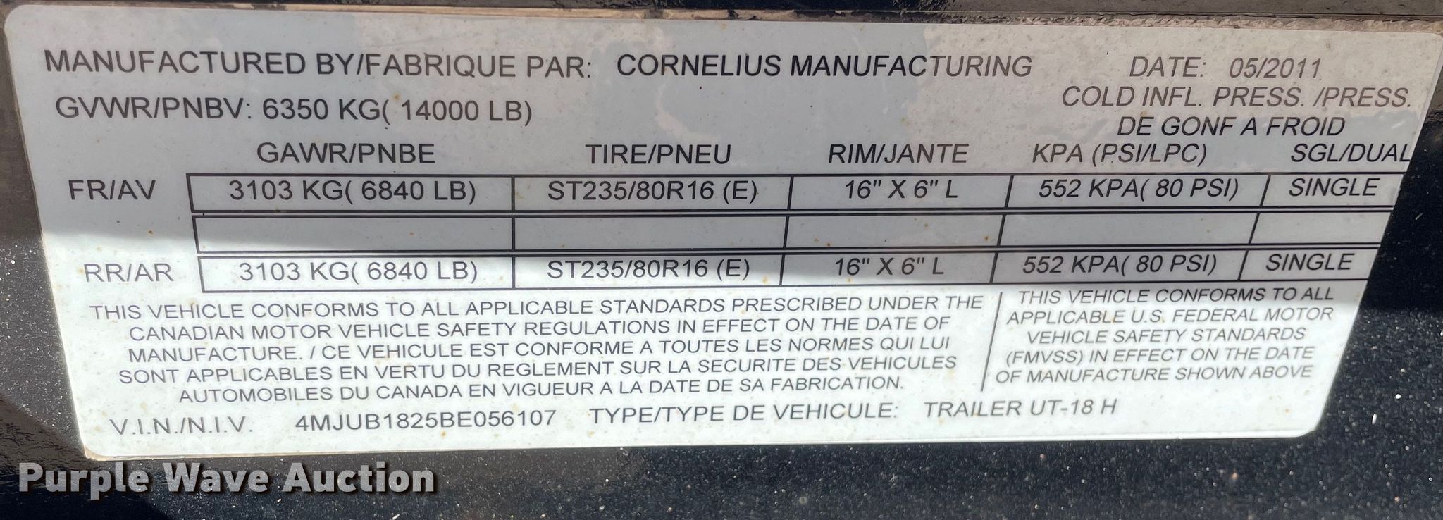 2011 Cornelius Manufacturing UT-18H equipment trailer. VIN: 4MJUB1825BE056107, Unit #: ST1. Dimensions Overall: 24' L x 84" W, Deck: 16' L x 81" W, Deck height: 23", Tail length: 2', Ramps: Manual Length: 48". Features Deck type: Wood. Chassis Hitch: Pintle, Landing gear: Single, Suspension: Spring, Brakes: Electric, Axles: Tandem, GVWR: 14,000 lbs, GAWR: 6,840 lbs. Tires Steel wheels, Size: 235/80R16. Wisconsin title. Ken Becker & Sons. W197N7555 F and West Court. Lannon, WI 53046