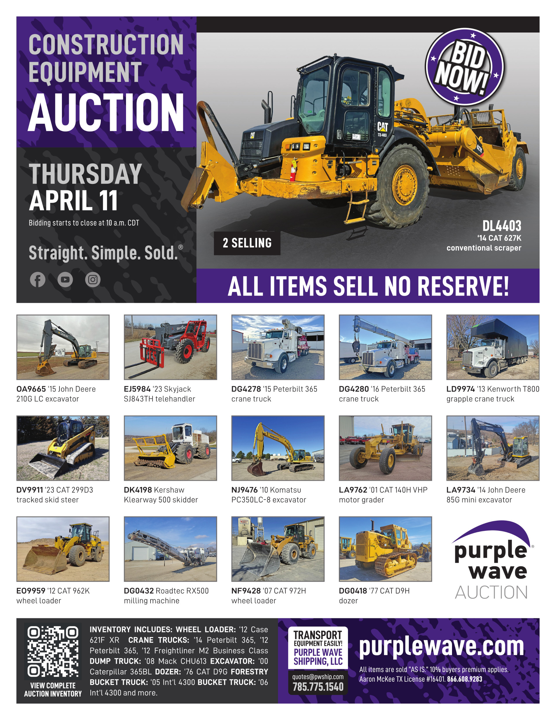 Purple Wave Shipping, LLC provides shipping and transportation services to winning bidders on ag, construction and fleet type assets. Purple Wave Shipping, LLC does not provide shipping on items weighing less than 1,000 pounds.