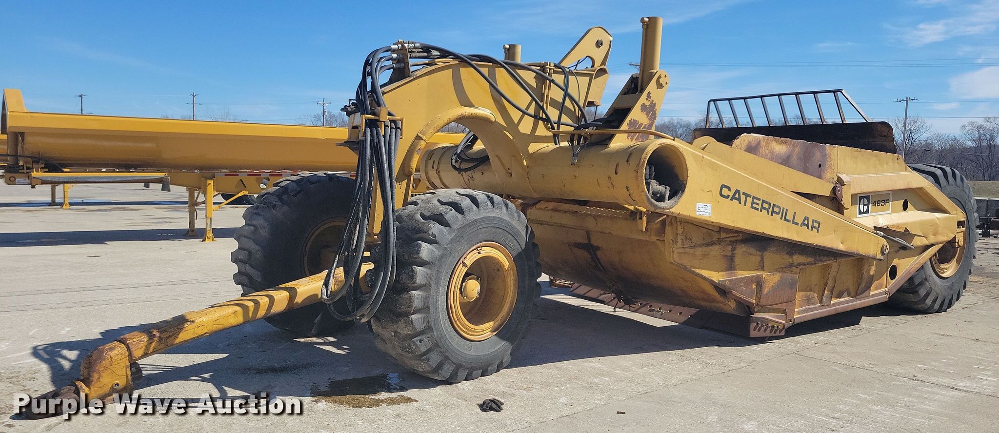 Purple Wave is selling a used Pull Type Scraper in Iowa. This item is a Caterpillar 463F scraper with the following: Bowl: 10', Hydraulic lift, Axle ride, Rear push block, Hitch: Scraper