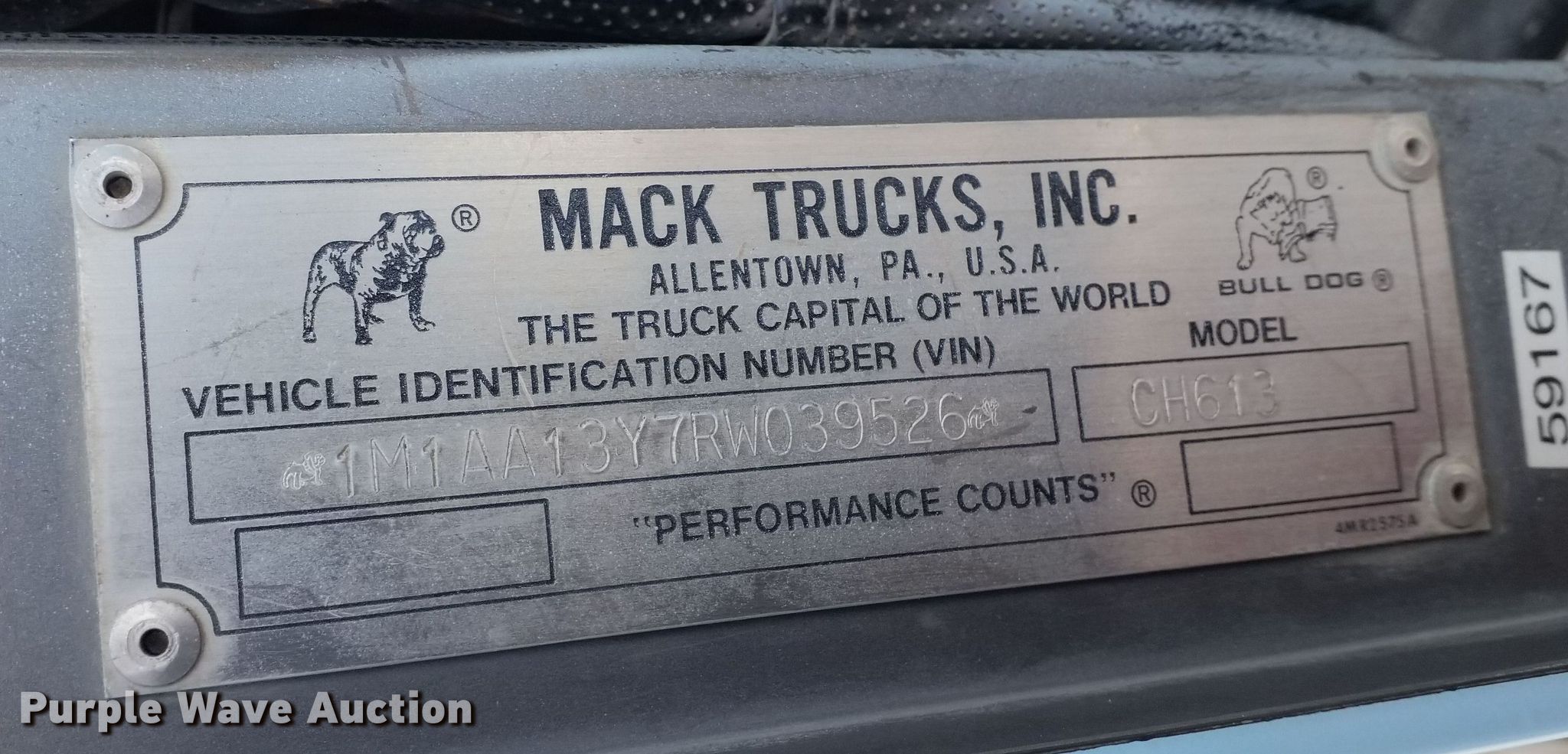 Purple Wave is selling a used Truck Tractor in Iowa. This item is a 1994 Mack CH613 semi truck with the following: Miles: 111,808 on odometer, Hours: 12,428 on meter, VIN: 1M1AA13Y7RW039526