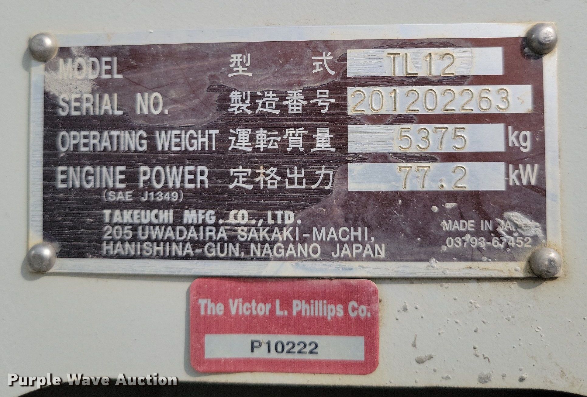 Purple Wave is selling a used Tracked Skid Steer Loader in Missouri. This item is a 2016 Takeuchi TL12 tracked skid steer loader with the following: Hours: 4,220 on meter, Actual hours unknown, Actual hours unkown, Serial: 201202263