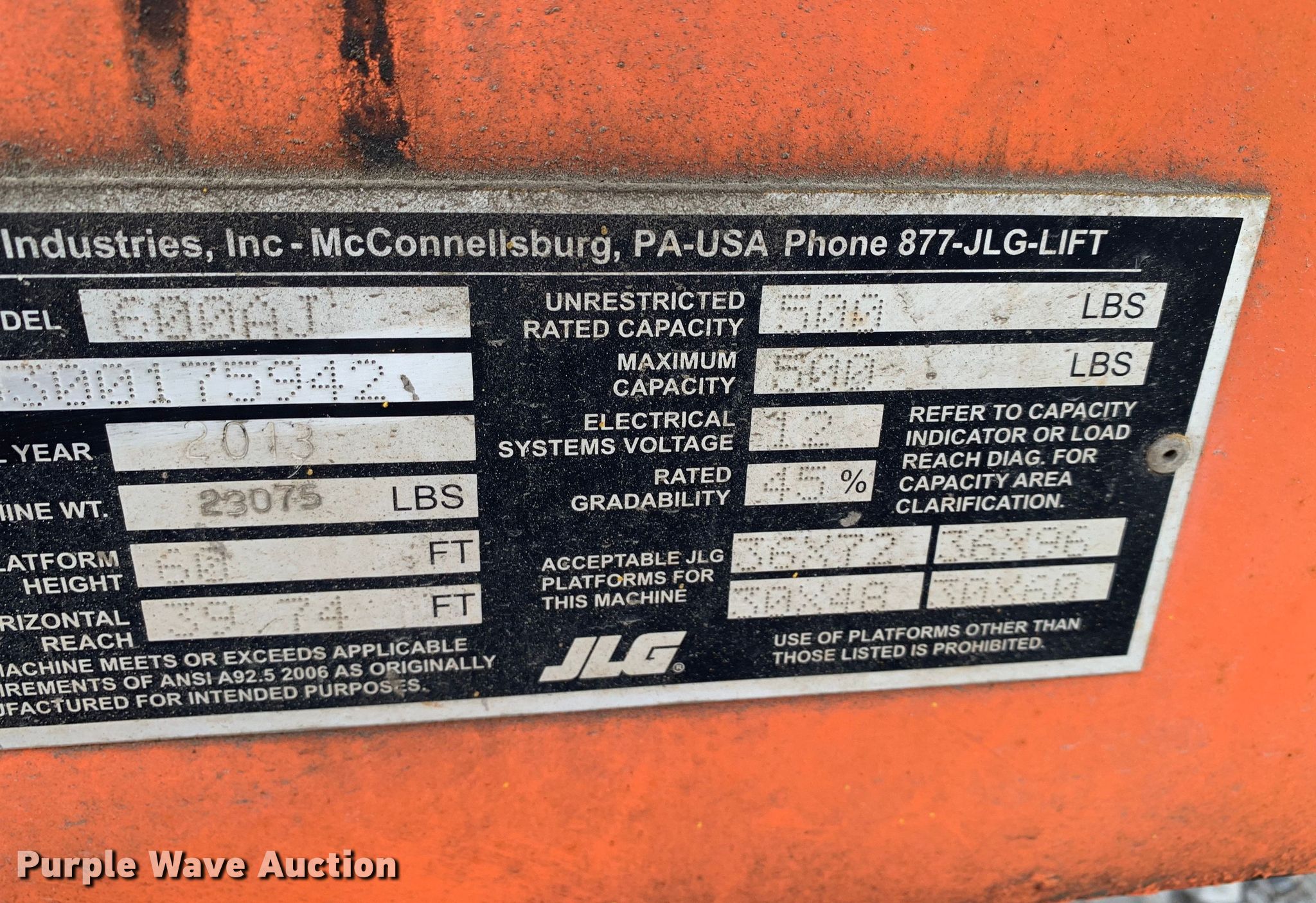 Purple Wave is selling a used Boom Lift in Texas. This item is a 2013 JLG 600AJ boom lift with the following: Hours: 1,374 on meter, Serial: 0300175942