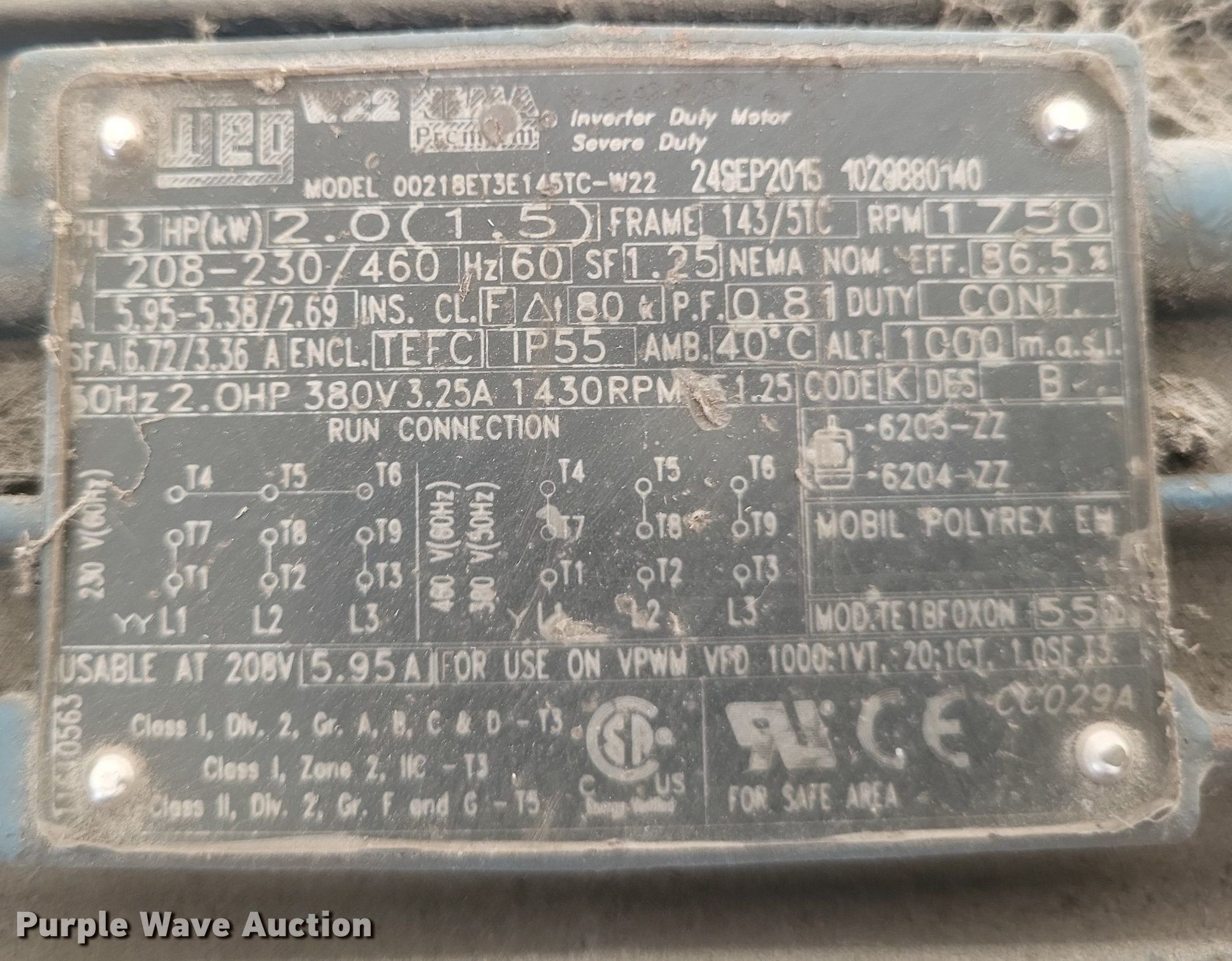 Purple Wave is selling a used Conveyor in Missouri. This item is a Conveyor with the following: WEG W-22, HP: 2, Volts: 380, Phase: Three