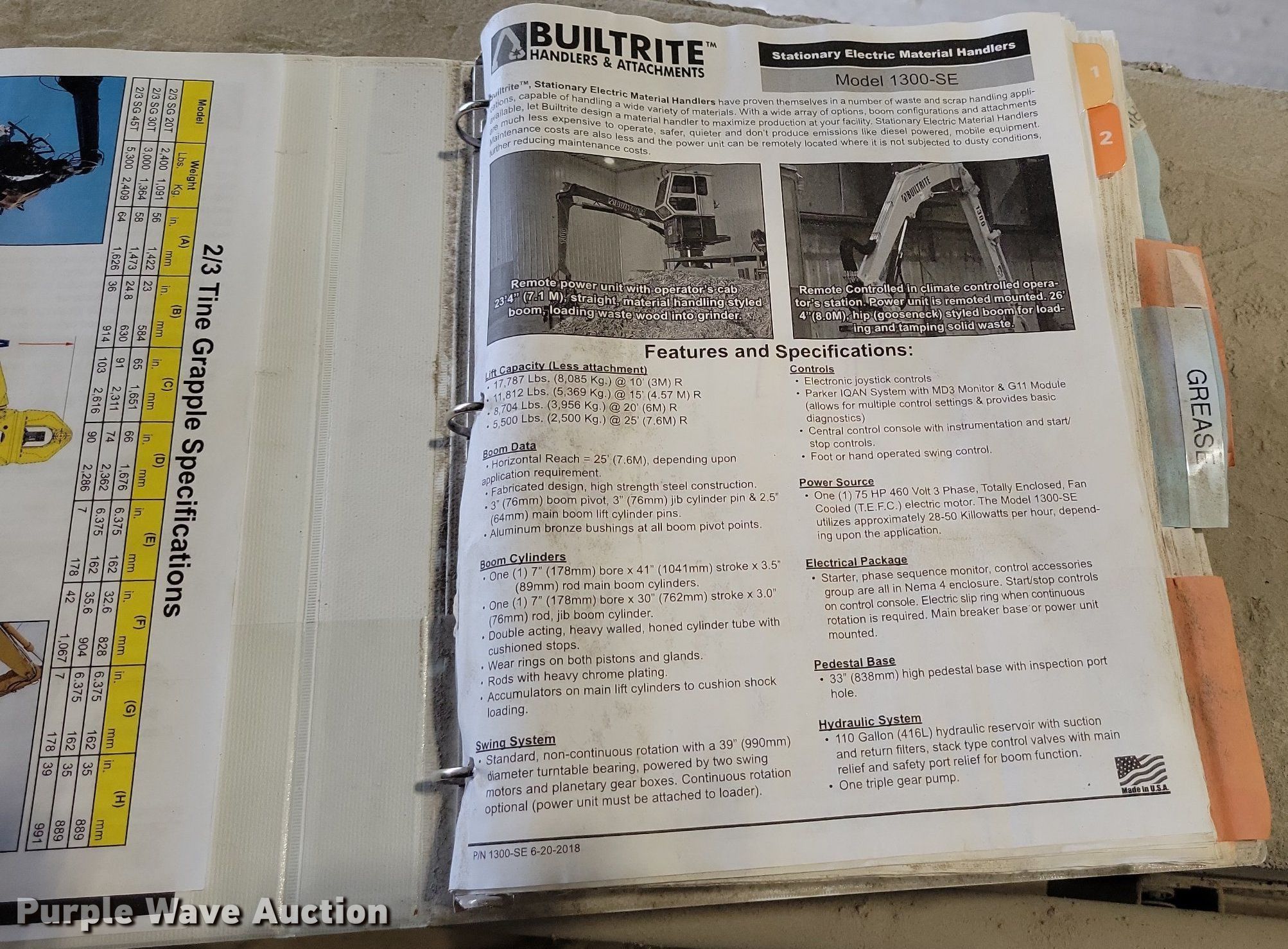 Builtrite 1300SE material handler crane. Serial: NS4666. Electric Motor Phase: Three, Volts: 230/460, HP: 1. Features Operators station, Grapple bucket Width: 20". R.R. Taylor Construction Services. 1280 SE Century Dr. Lee's Summit, MO 64081