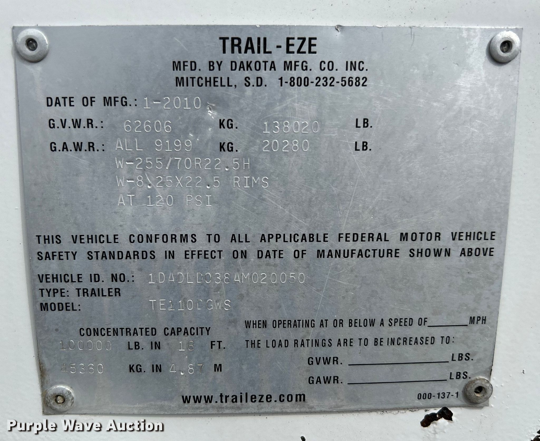 2010 Trail-Eze TE110DGWS lowboy equipment trailer. VIN: 1DADLD038AM020050. Dimensions Overall: 56' L x 102" W, Deck: 26' L x 90" W, Rear deck length: 16'. Features Deck type: Wood, Neck type: Folding, Hydraulic controls: Manual. Chassis Suspension: Air, Brakes: Air, Axles: Spread, GVWR: 138,020 lbs, GAWR: 20,280 lbs. Tires Steel wheels, Size: 255/70R22.5. 2010 Trail-Eze TE1A flip axle VIN: 1DAYYGA18AM020051. Dimensions Overall: 5' L x 102" W. Features Deck type: Steel. Chassis Suspension: Air, Brakes: Air, GAWR: 20,280 lbs. Tires Steel wheels, Size: 255/70R22.5. Oklahoma title. 15107 North 137th East Avenue. Collinsville, OK 74021