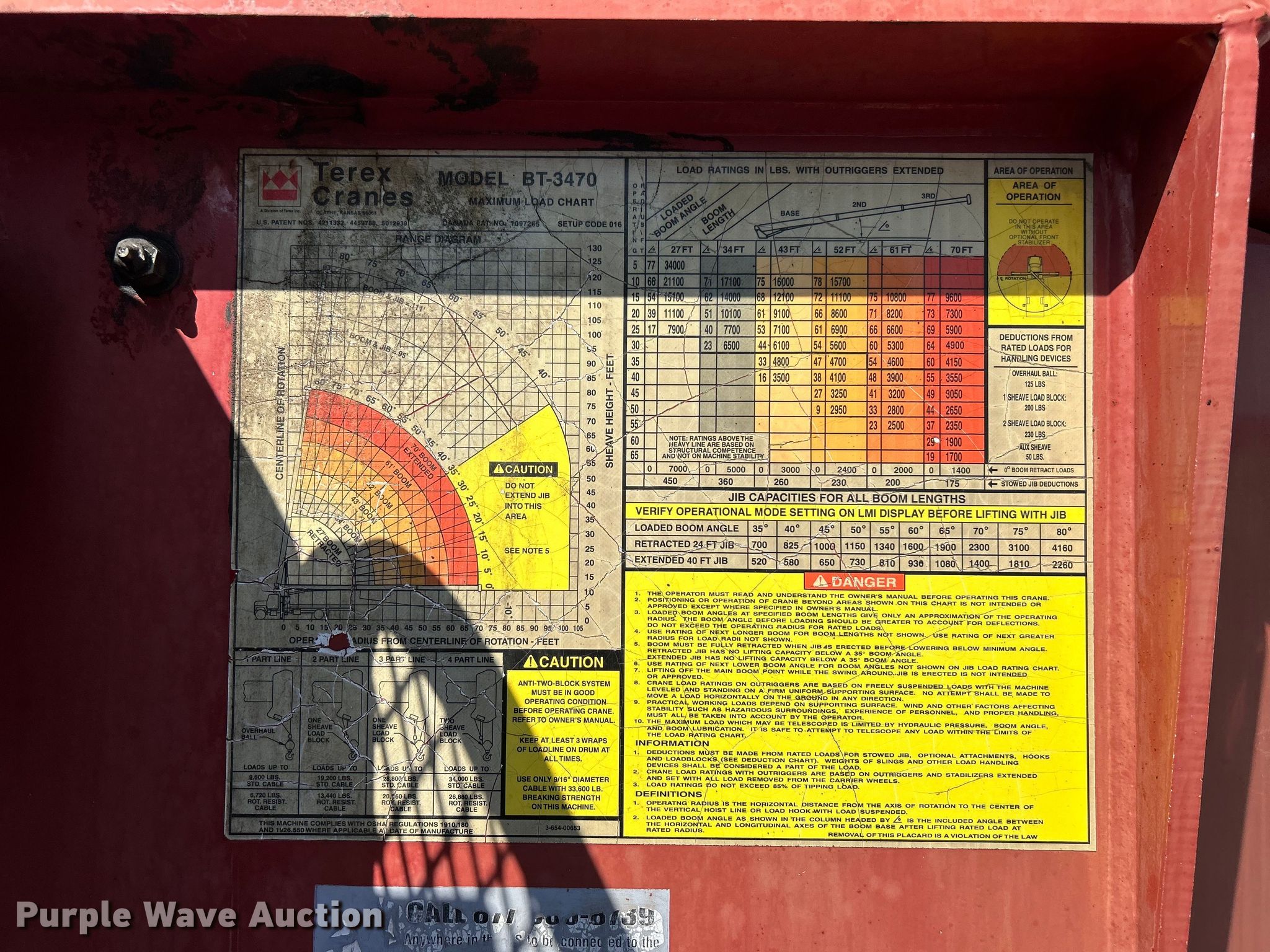 2003 Ford F750 Super Duty crane truck. Miles: 326,059 on odometer, VIN: 3FDXF75B73MB02442. Engine Cummins ISB, Displacement: 5.9L, Cylinders: 6, Fuel type: Diesel. Transmission Manual, Speed: 6. Chassis Axles: Single, Suspension: Spring, Brakes: Air, PTO, GVWR: 33,000 lbs FAWR: 12,000 lbs, RAWR: 21,000 lbs, Wheelbase: 260". Interior AC, Heat, Cruise control. Features Flatbed 20' L x 96" W, Crane Terex RO BT3470 Serial: 4490602387, Boom Telescopic, Maximum boom length: 70' Sections: 3, Maximum lift capacity: 34,000 lbs, Man basket, Boom controls Ground, Crane ball & hook, Lift chart. Tires Size: 11R22.5. Notes Windshield chipped or cracked. Oklahoma title. Title distribution may be delayed up to 14 days from verification of funds. 15107 North 137th East Avenue. Collinsville, OK 74021